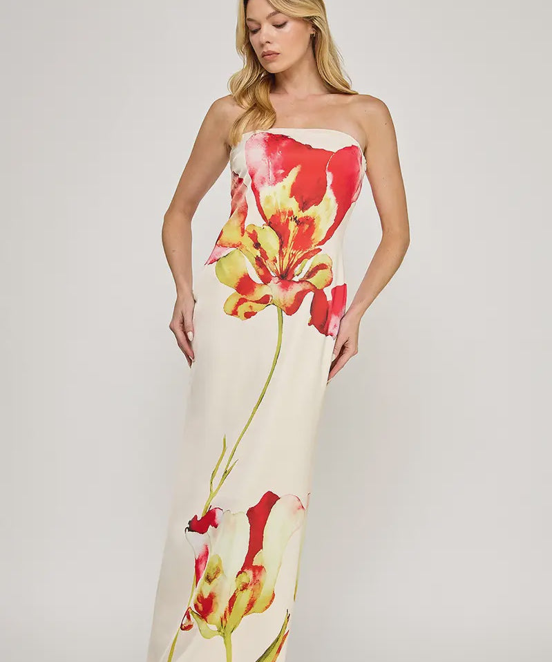 Scarlet Bloom Strapless Maxi Dress