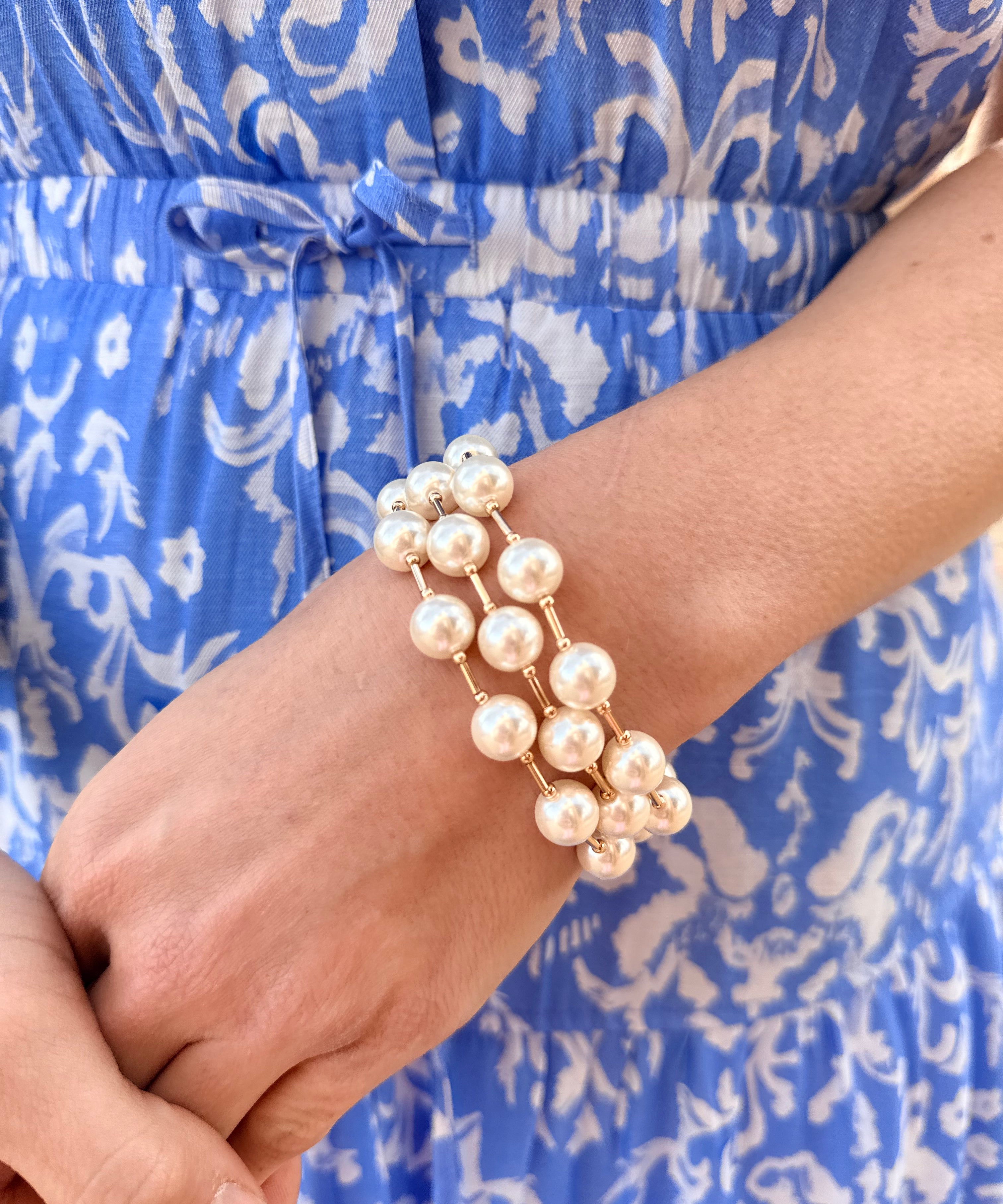 Water Resistant Set of 3 Gold Bar with Pearl Beaded Stretch Bracelets