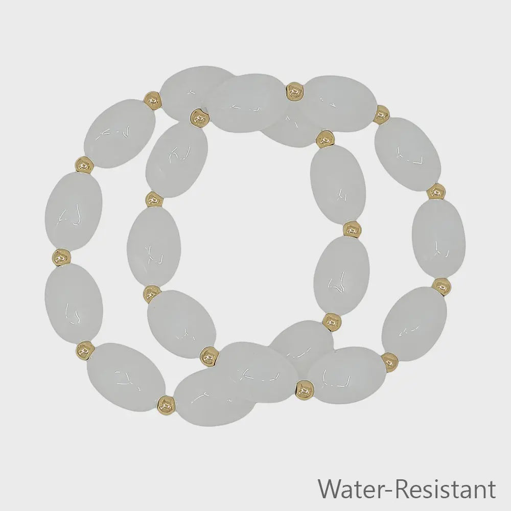 Water Resistant Set of 2 White Oval Acrylic and Gold Beaded Stretch Bracelets