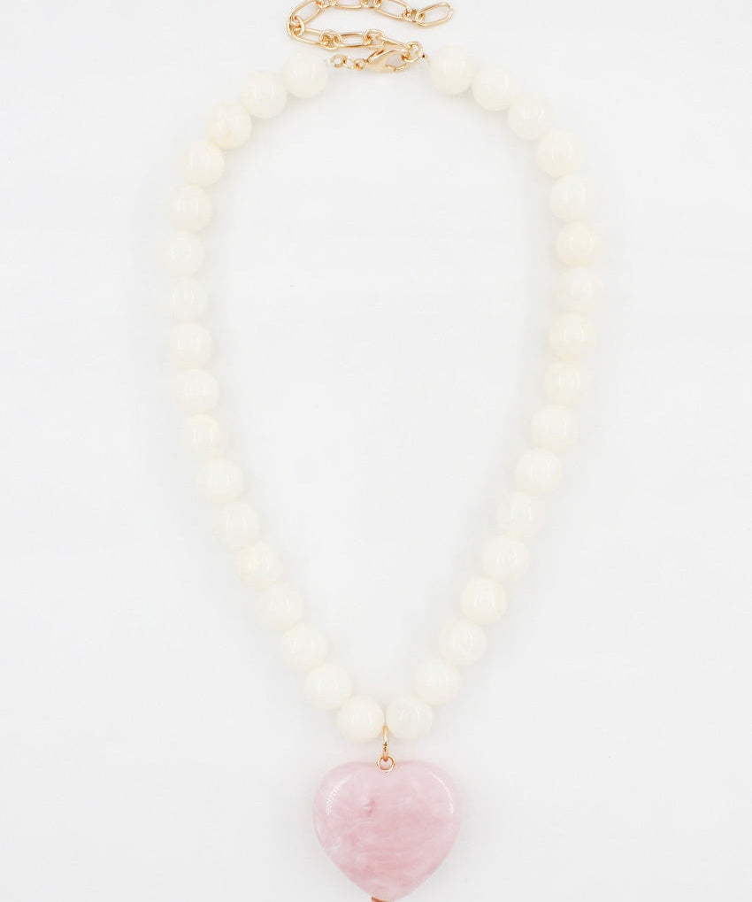 White Stone Circle Necklace with Pink Natural Stone Heart Charm