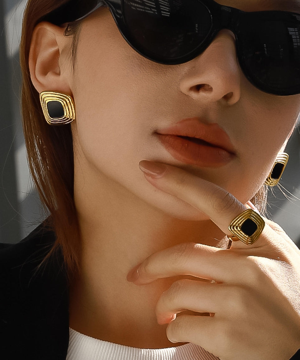 Solenne 18K Gold Enamel Square Earrings - Black