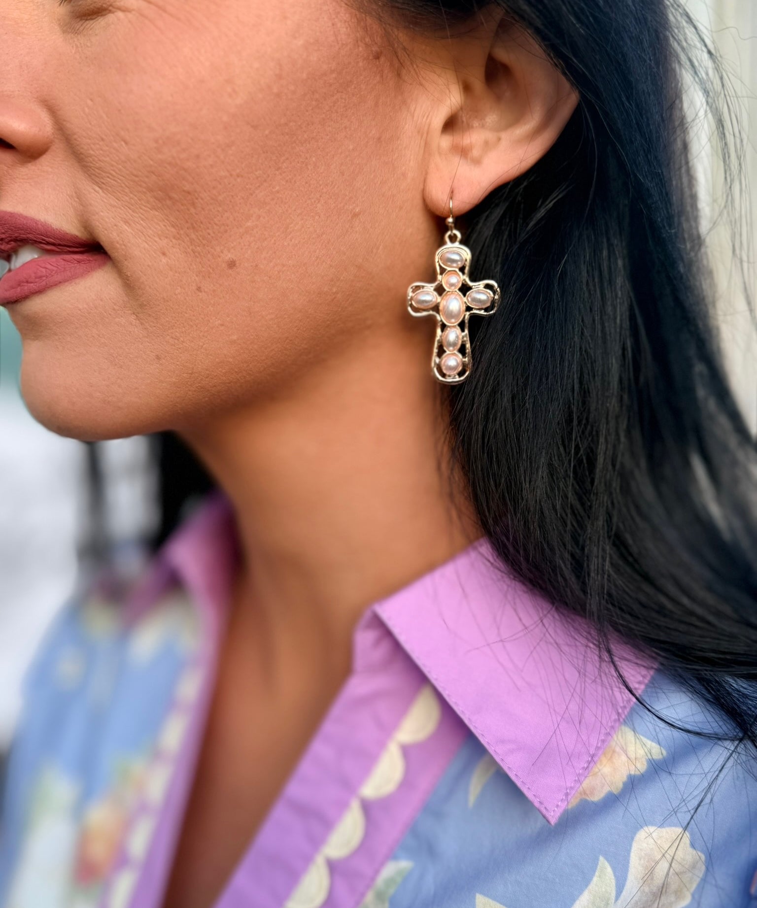 Graceful Pearl Cross Earrings