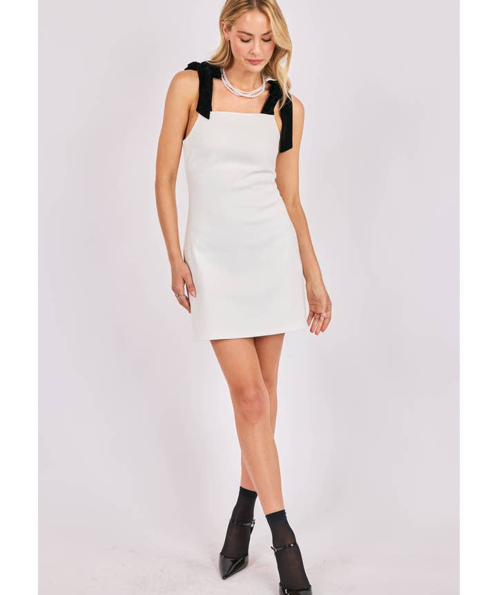 White Black Flirtation Contrast Shoulder Tie Mini Dress