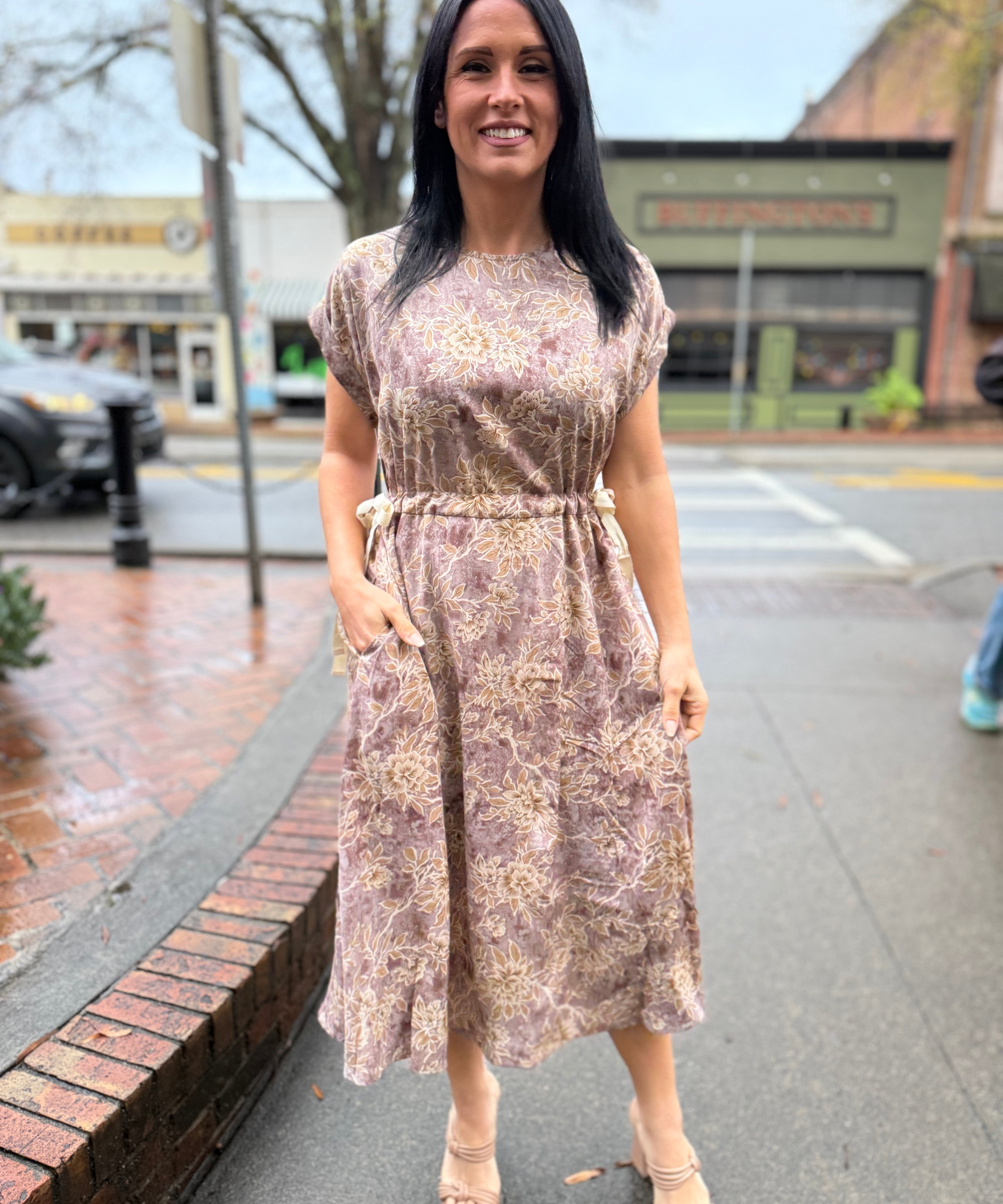 Drop Shoulder Woven Floral Print Midi Dress - Mocha