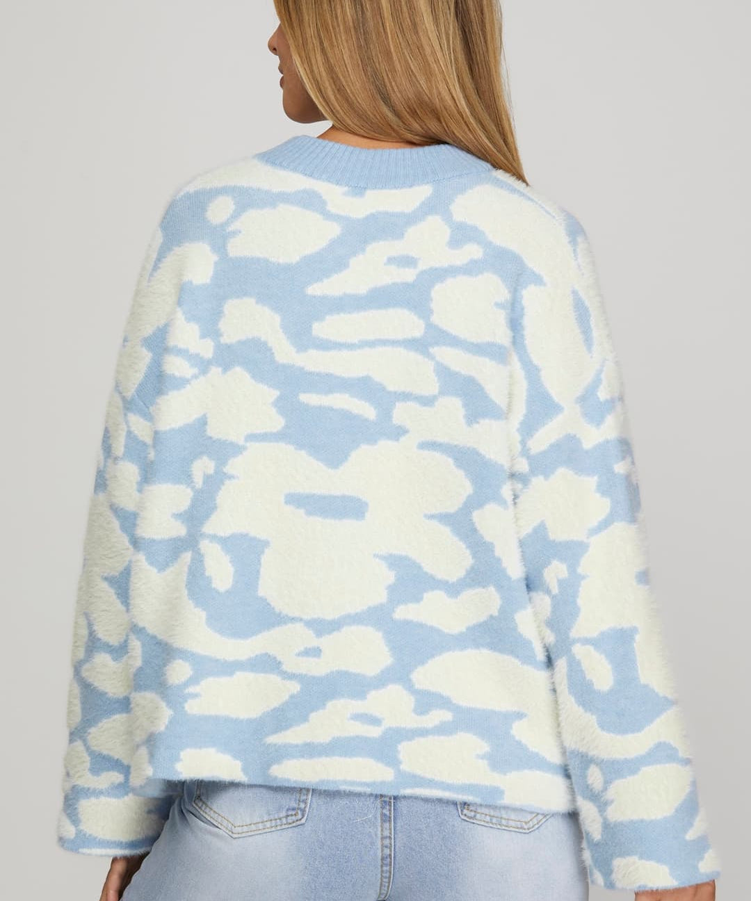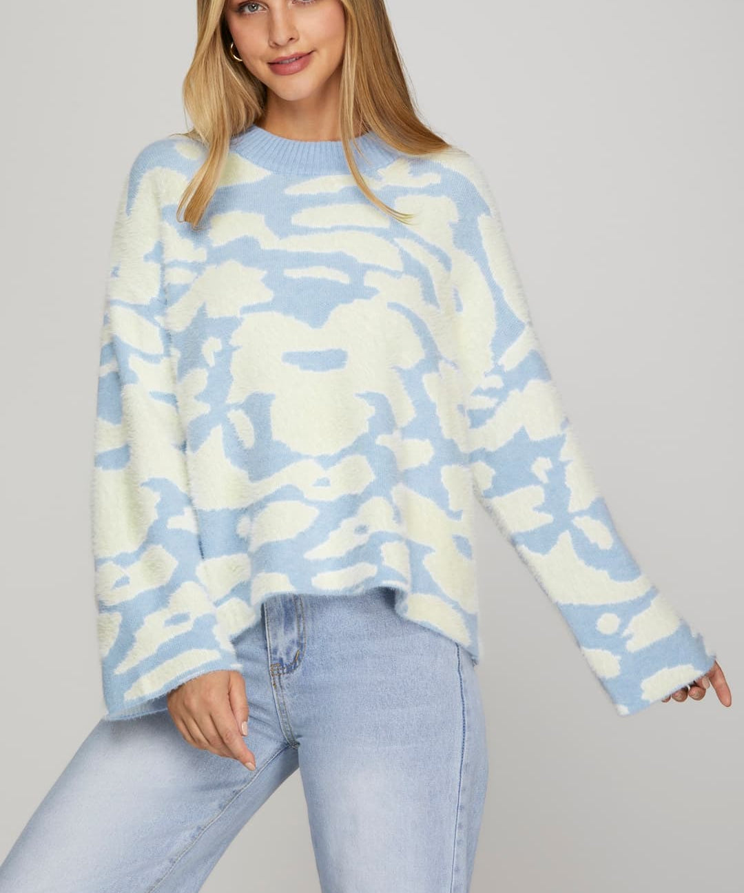 Long Sleeve Fuzzy Floral Print Sweater Top - LT. Blue