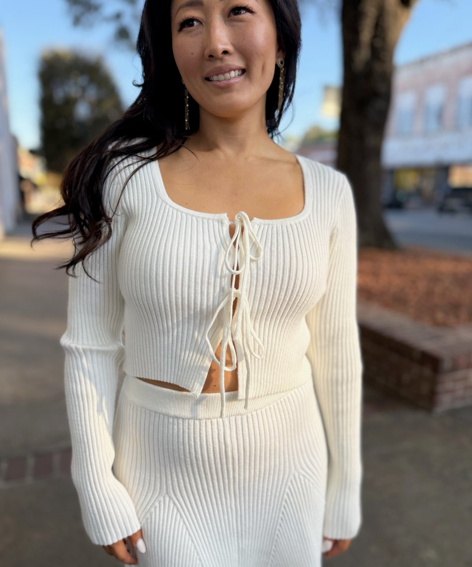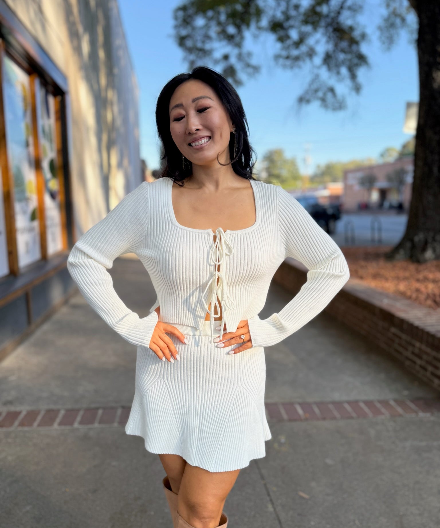 Cream Bow Tied Ribbed Knit Cardigan And Mini Skirt