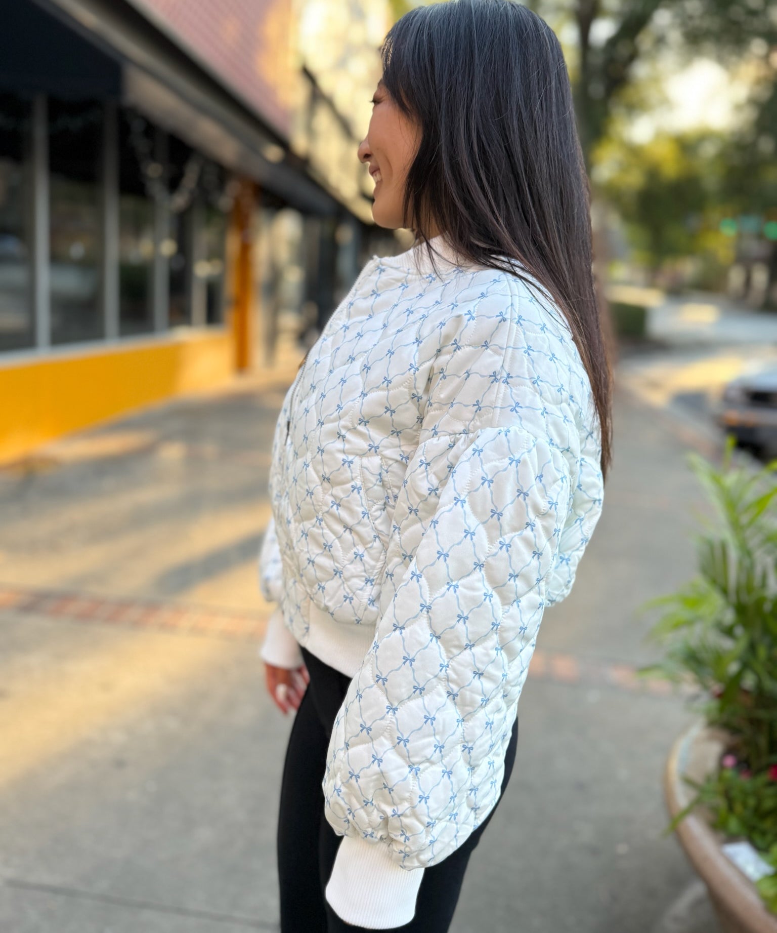 Blue Bow Ribbon Print Oversized Bomber Jacket