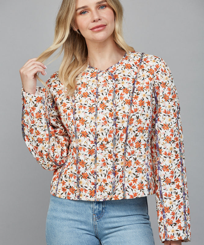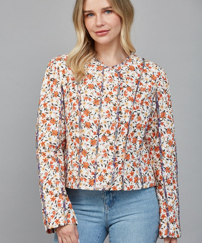 Off White Multi Contrasting Piping Floral Print Quilted Jacket
