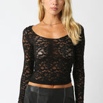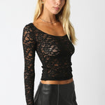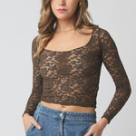 Sultry meets chic in the After Dark Lace Top. This sheer floral lace long sleeve features a flattering scoop neckline and fitted silhouette that layers beautifully over a bralette or cami. Available in classic black and rich mocha, it’s the perfect piece to elevate high-waisted denim or leather for a night-out look that turns heads. Effortless, daring, and endlessly versatile.