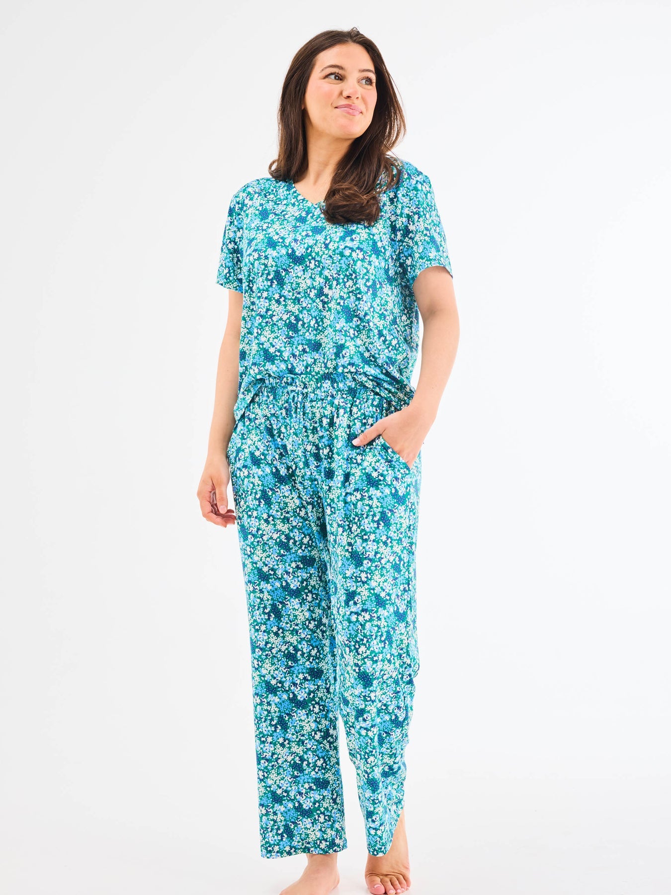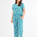 Effortlessly comfortable and undeniably charming, the Alli Day Dreaming Pant Set is your new go-to for relaxed days with a touch of style. This two-piece set features a soft V-neck short-sleeve top and matching full-length pants, both adorned in a dreamy all-over floral print in soothing shades of teal, aqua, and white. The top has a relaxed fit for breathable ease, while the pants feature an elastic waistband and convenient pockets, combining comfort with functionality. Whether you're lounging at home, running errands, or stepping out for a casual outing, this set delivers laid-back elegance with a fresh, floral twist.