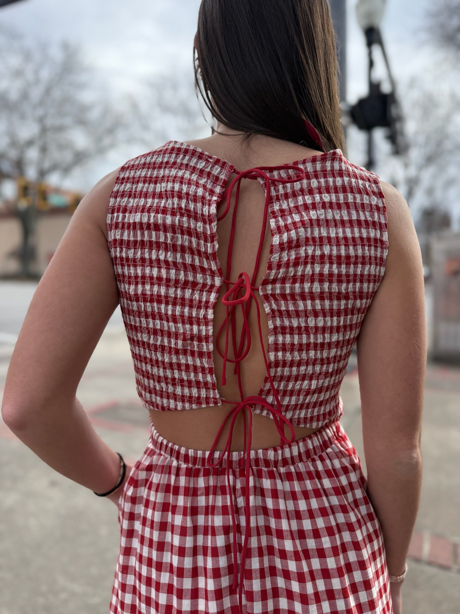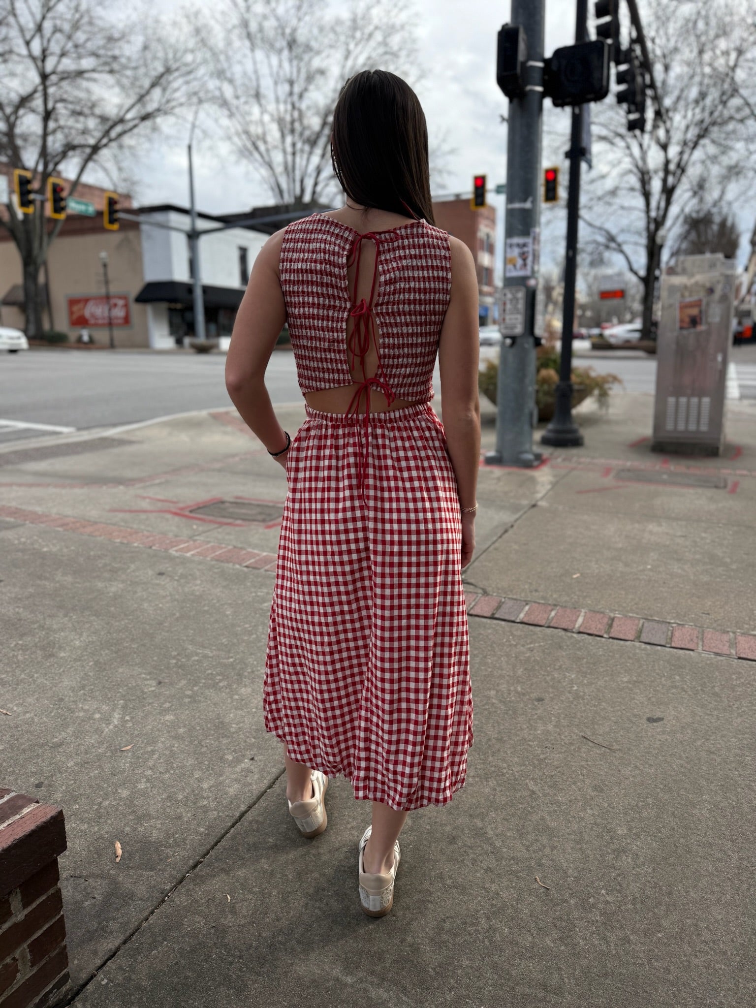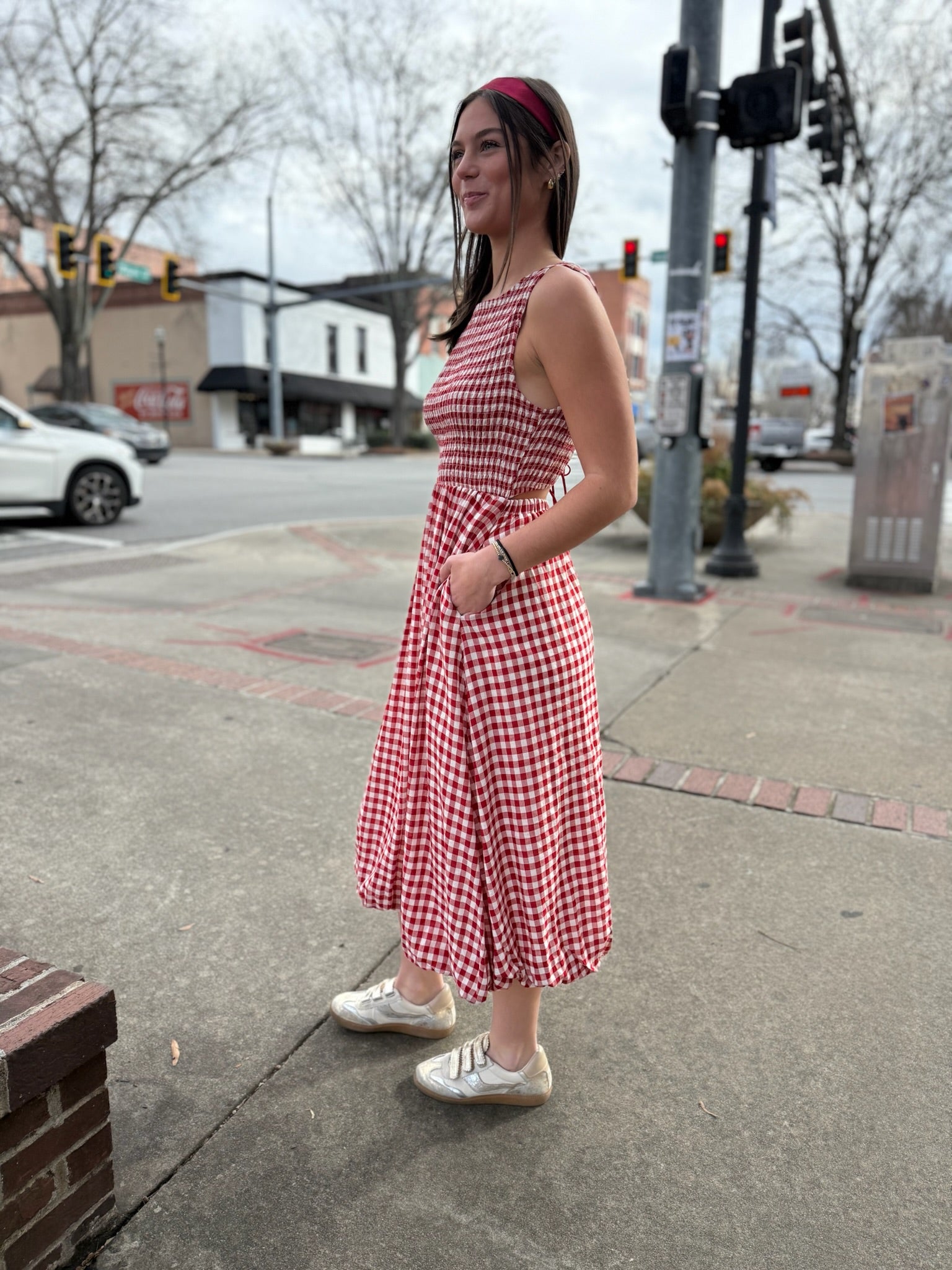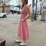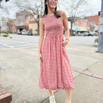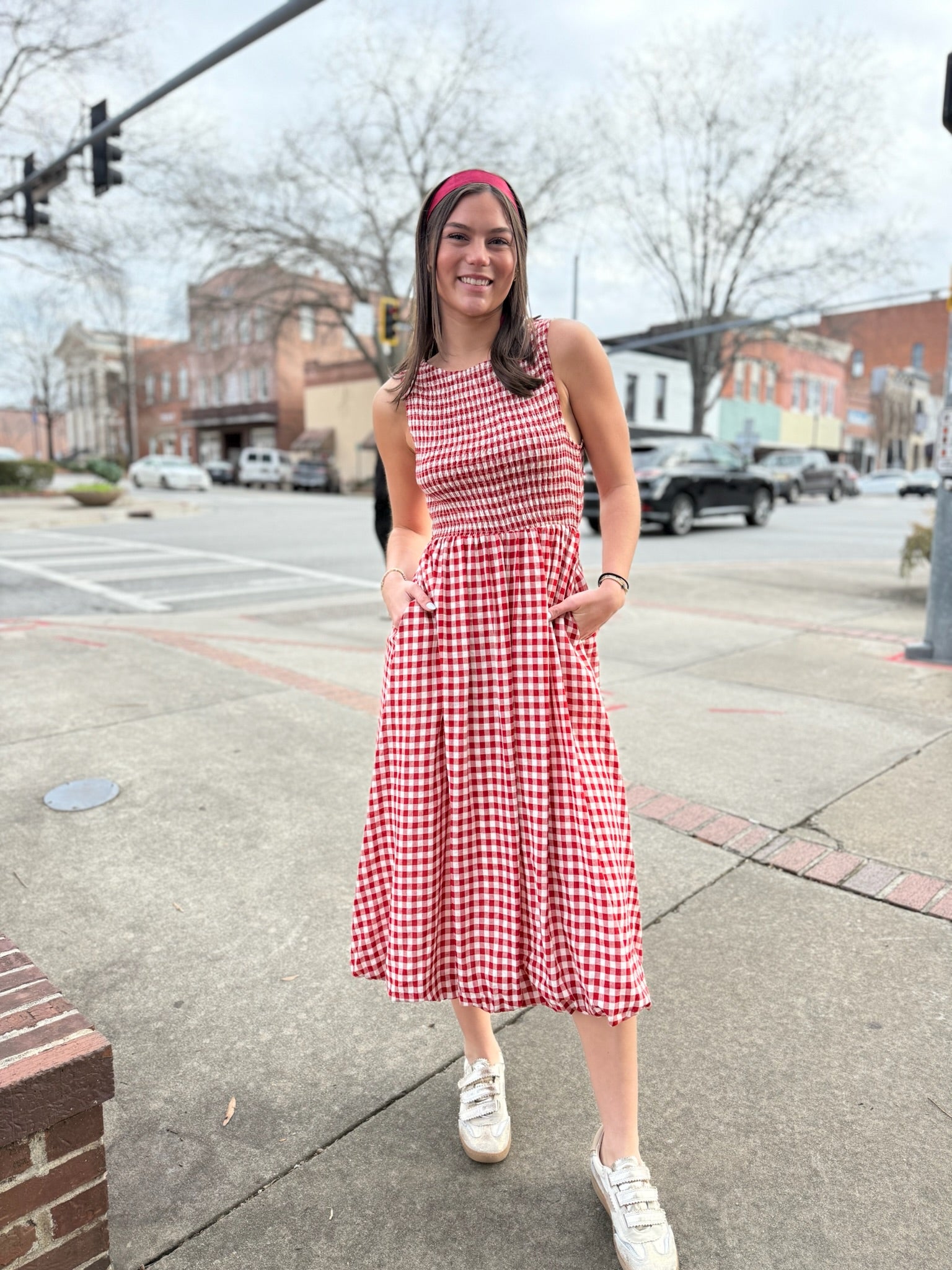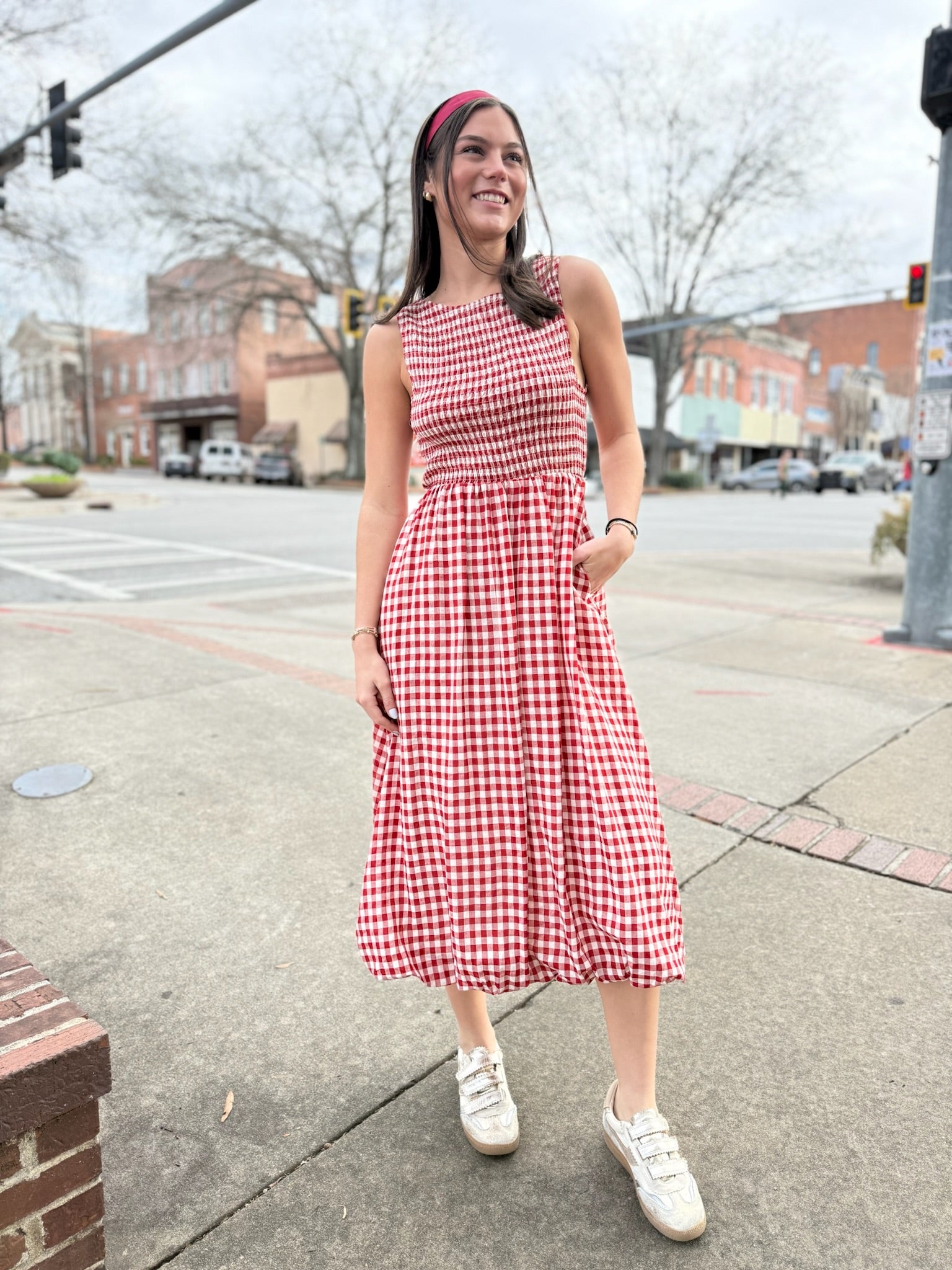 Sweet, timeless, and effortlessly charming, the Apple Butter Midi Dress by Sadie & Sage is a warm-weather favorite. Featuring a classic red and ivory gingham pattern, this sleeveless midi silhouette offers a flattering, easy fit with a softly structured shape. Crafted from breathable cotton with a comfortable stretch lining, it’s perfect for everyday outings, brunch dates, or casual gatherings. Style it with sandals for a relaxed look or dress it up with wedges for a polished finish.