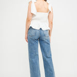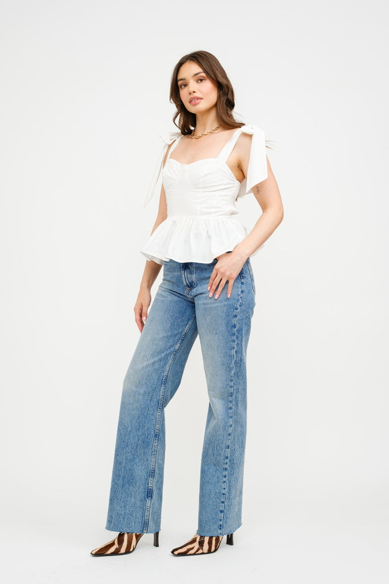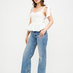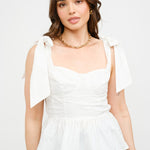 The Audrey Off-White Top is a timeless and effortlessly chic piece that combines romantic details with a flattering silhouette. Made from a crisp, structured fabric, this top features a corset-inspired bodice with subtle pleating for a fitted yet comfortable feel. The sweetheart neckline adds a touch of femininity, while the delicate shoulder tie straps provide an elegant and adjustable detail, creating a soft, graceful look. The peplum-style hem flares slightly at the waist, enhancing its figure-flattering shape and making it perfect for pairing with high-waisted jeans, skirts, or tailored trousers.