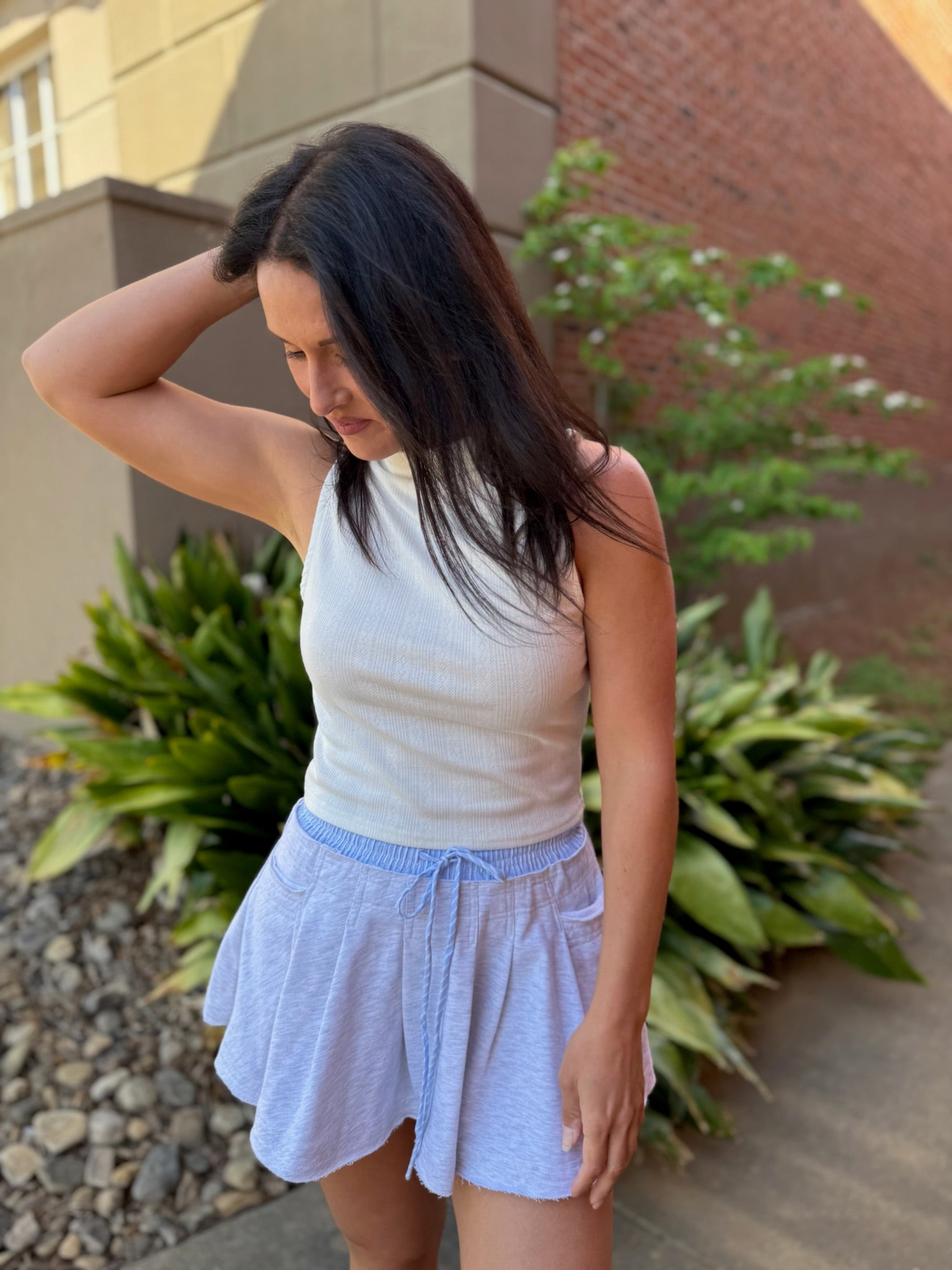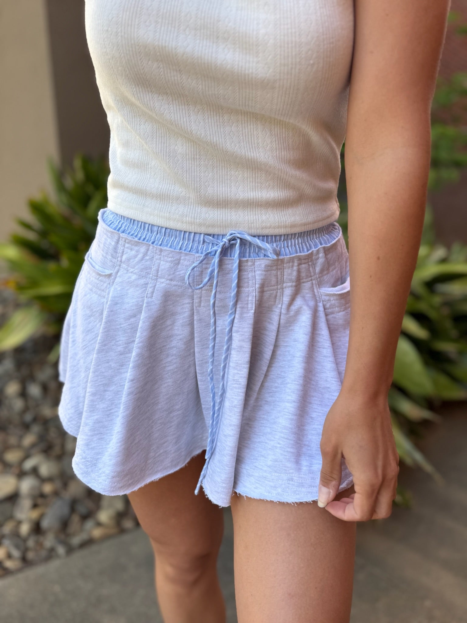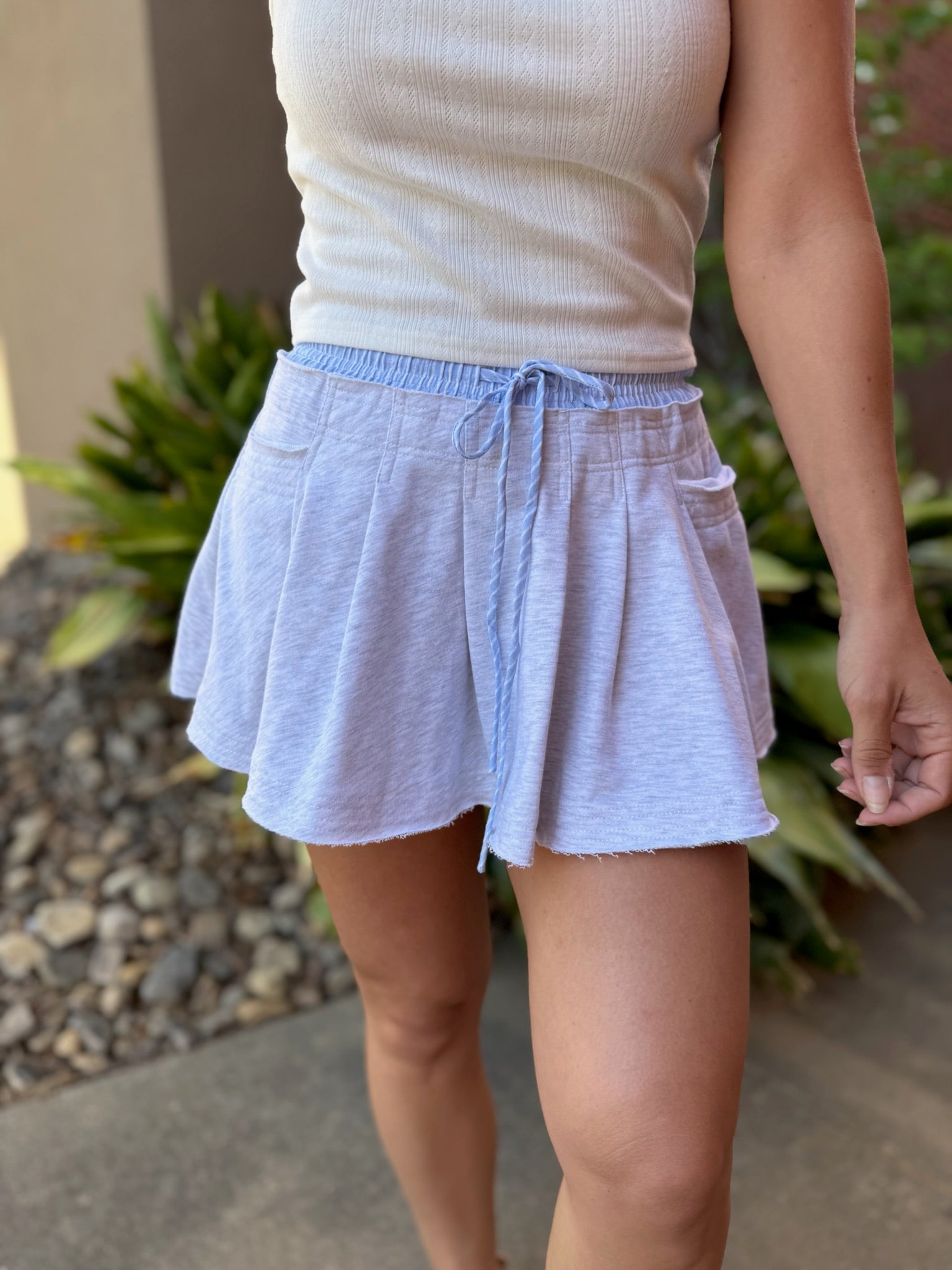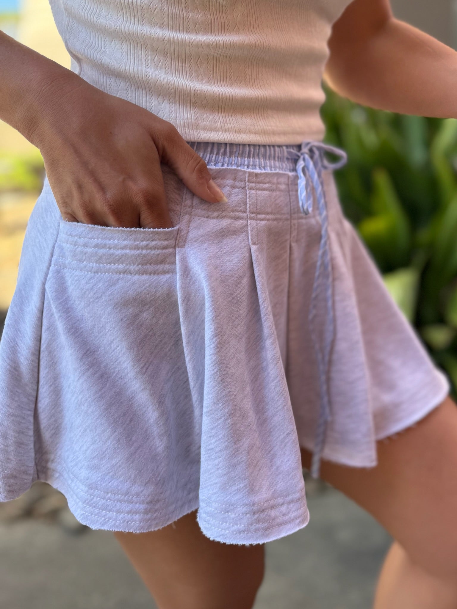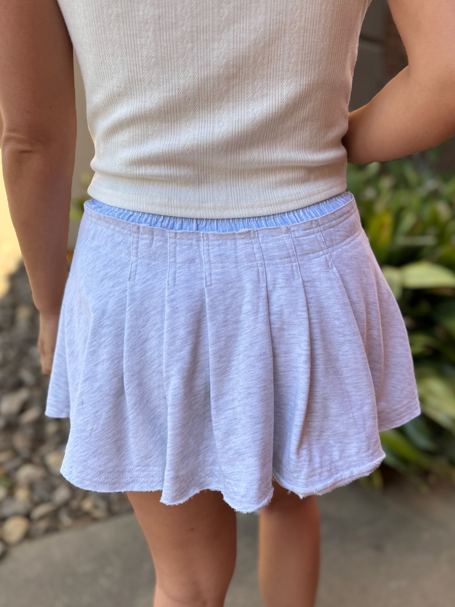 Laid-back meets playful in the Bayline Terry Skort — your new off-duty favorite. Made from soft terry fabric in a light heather gray, this skort features a flared silhouette with roomy patch pockets and built-in shorts for all-day comfort. The contrast blue striped waistband with an adjustable drawstring adds a sporty touch. Perfect for beach strolls, coffee runs, or lounging in style.