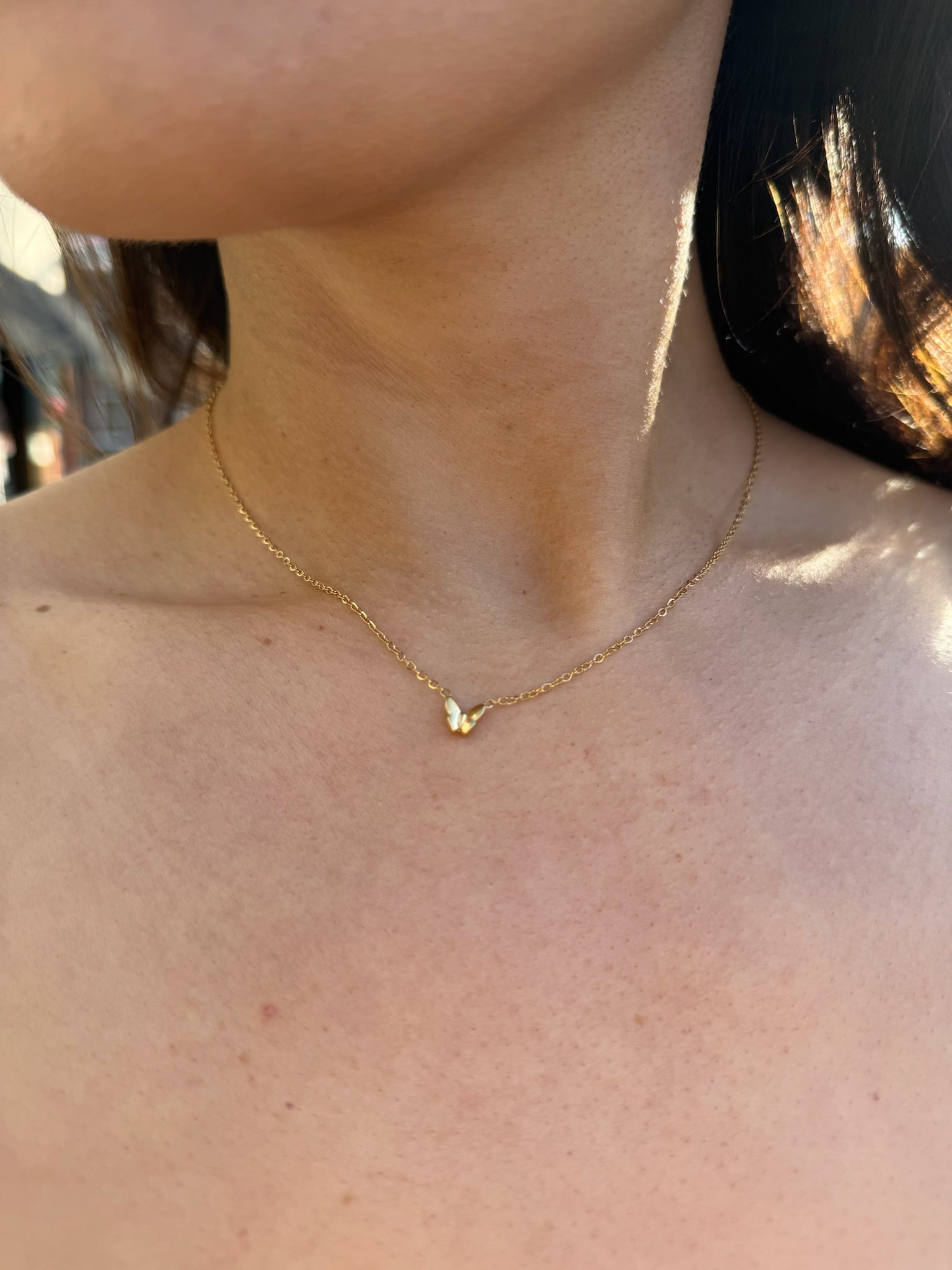 This necklace features a minimalist design with a subtle, gold butterfly pendant placed in the center. The pendant's delicate and clean lines capture the beauty of the butterfly, symbolizing transformation and freedom. Its simple and elegant appearance makes it perfect for everyday wear, offering a touch of charm without being overwhelming.