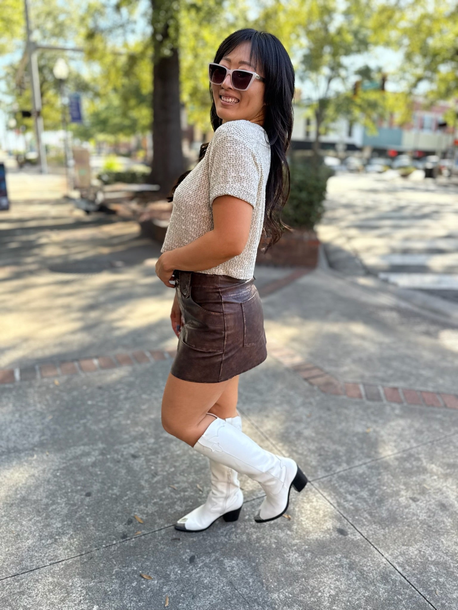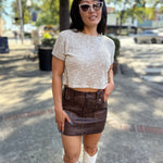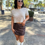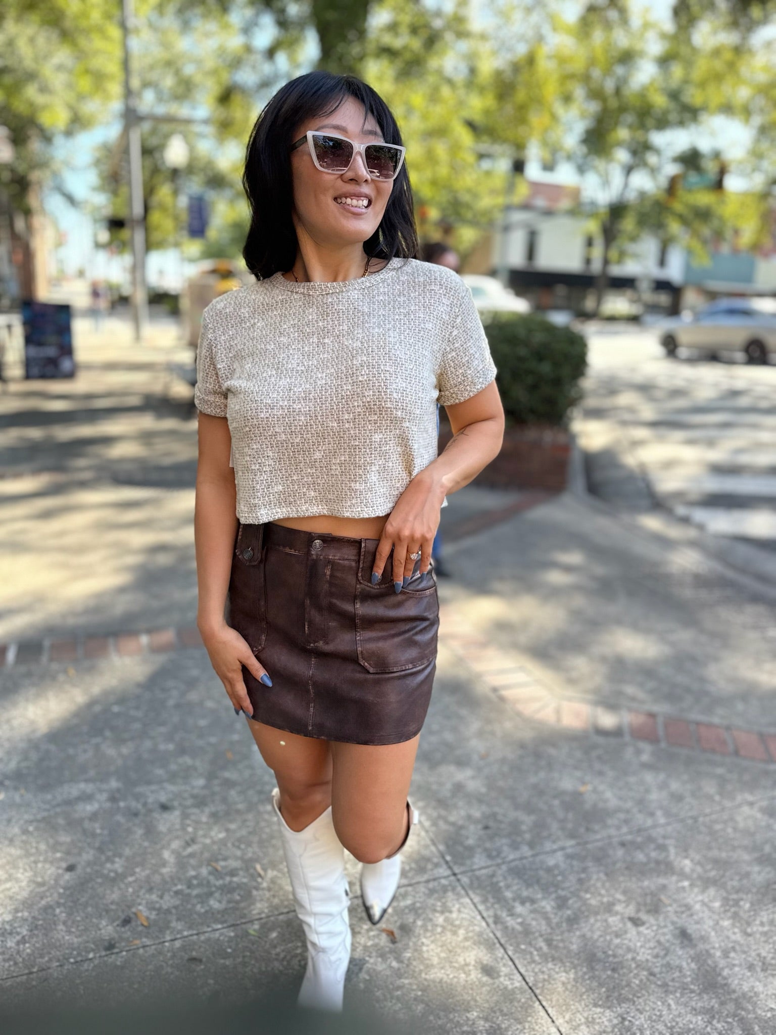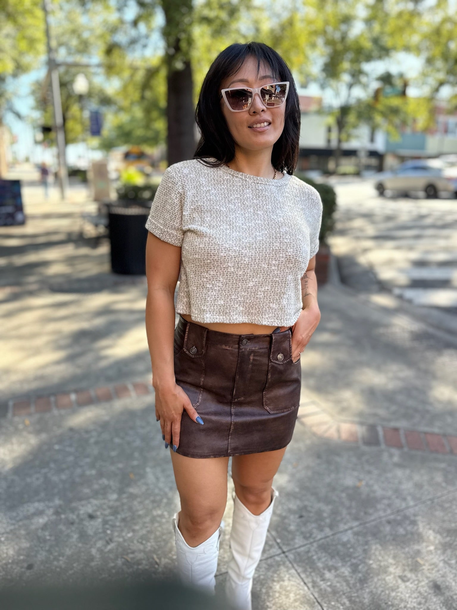 Keep it casual and chic with this short sleeve knit top, featuring a subtle speckled pattern and a relaxed, cropped fit. Its lightweight fabric makes it perfect for everyday wear, while the neutral tones pair effortlessly with anything from denim to tailored bottoms.
