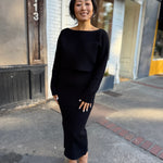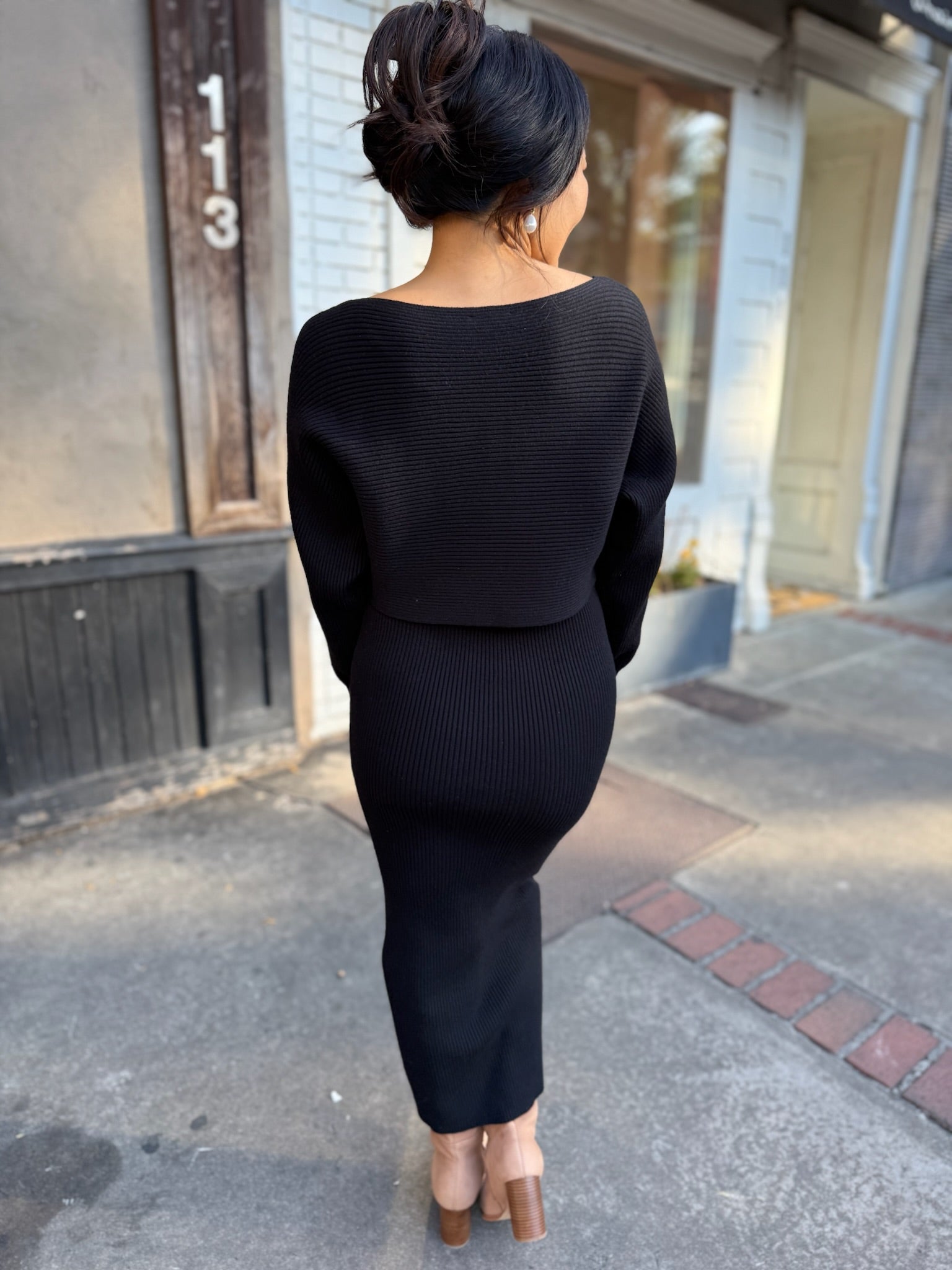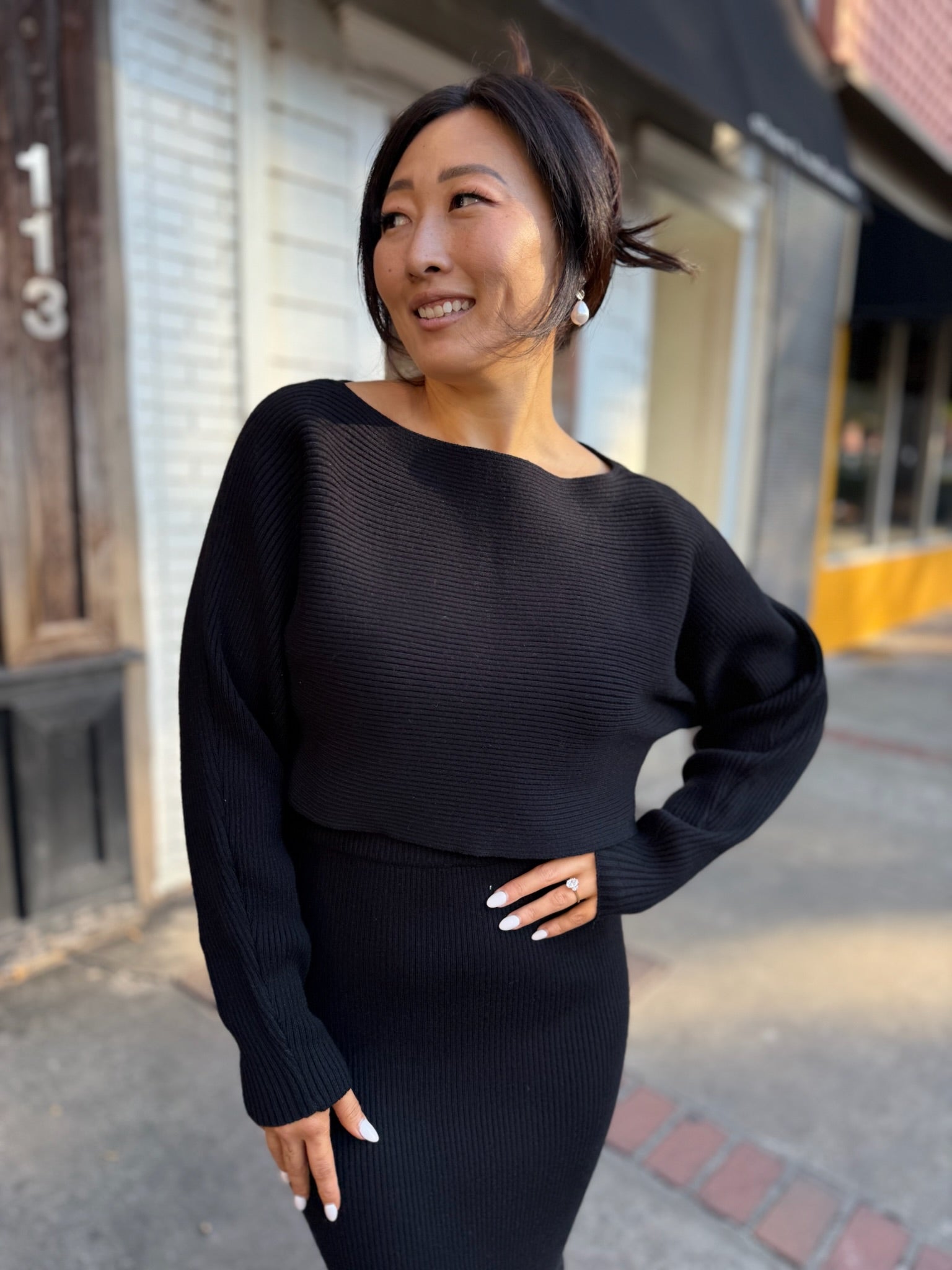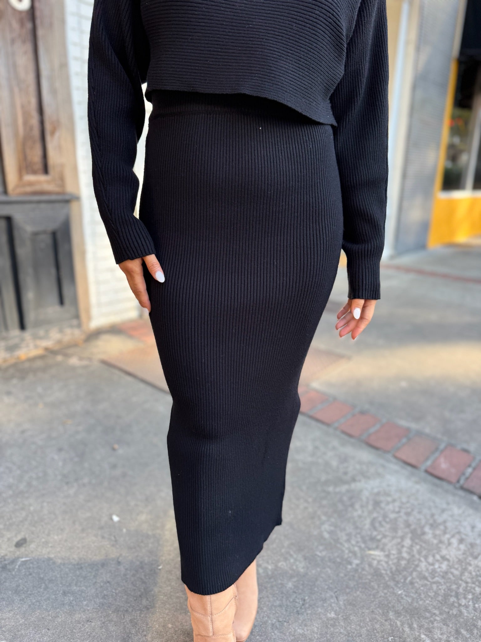 This chic ensemble features a long-sleeve crop sweater knit top and a matching bodycon midi skirt, creating a sleek and flattering silhouette. Perfect for dressing up or down, it’s a versatile set for any occasion.