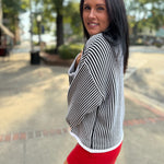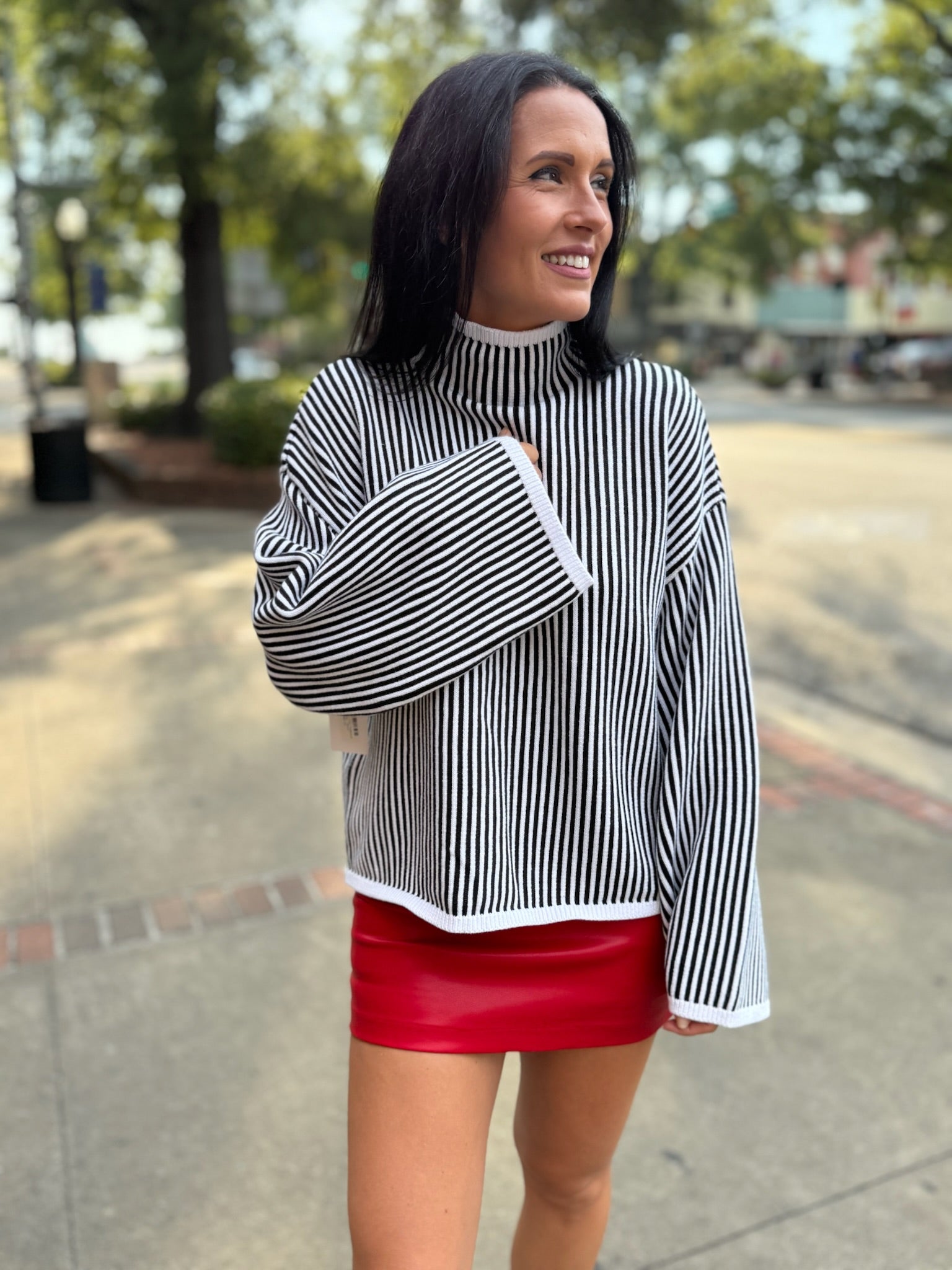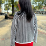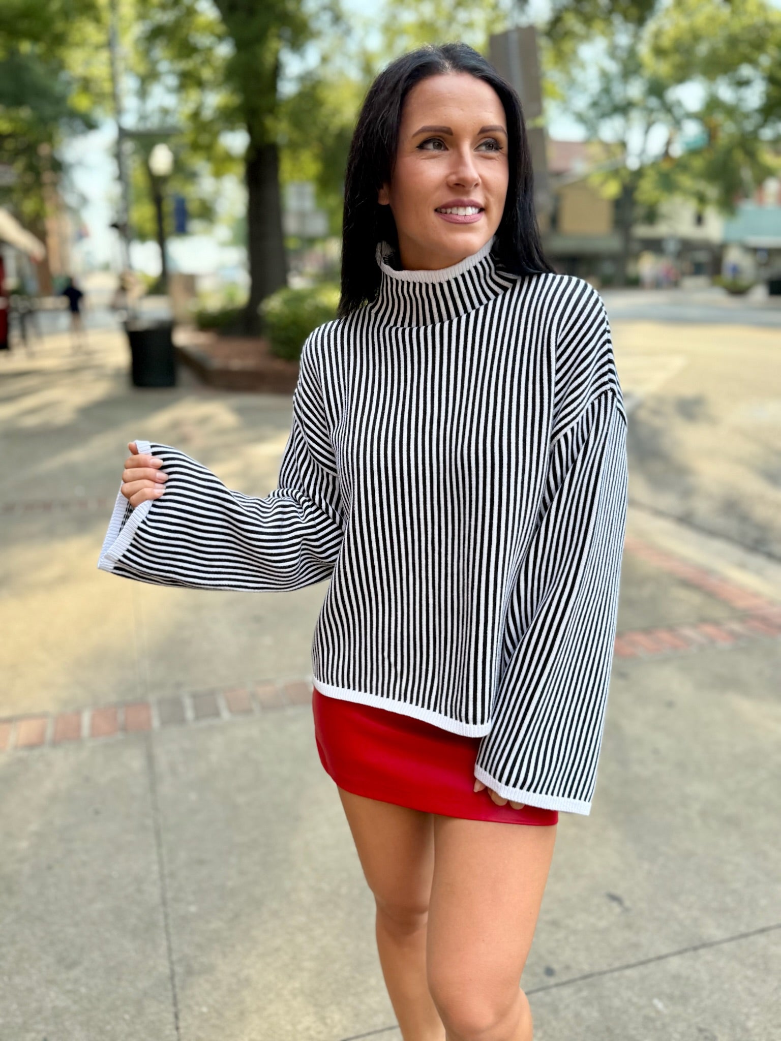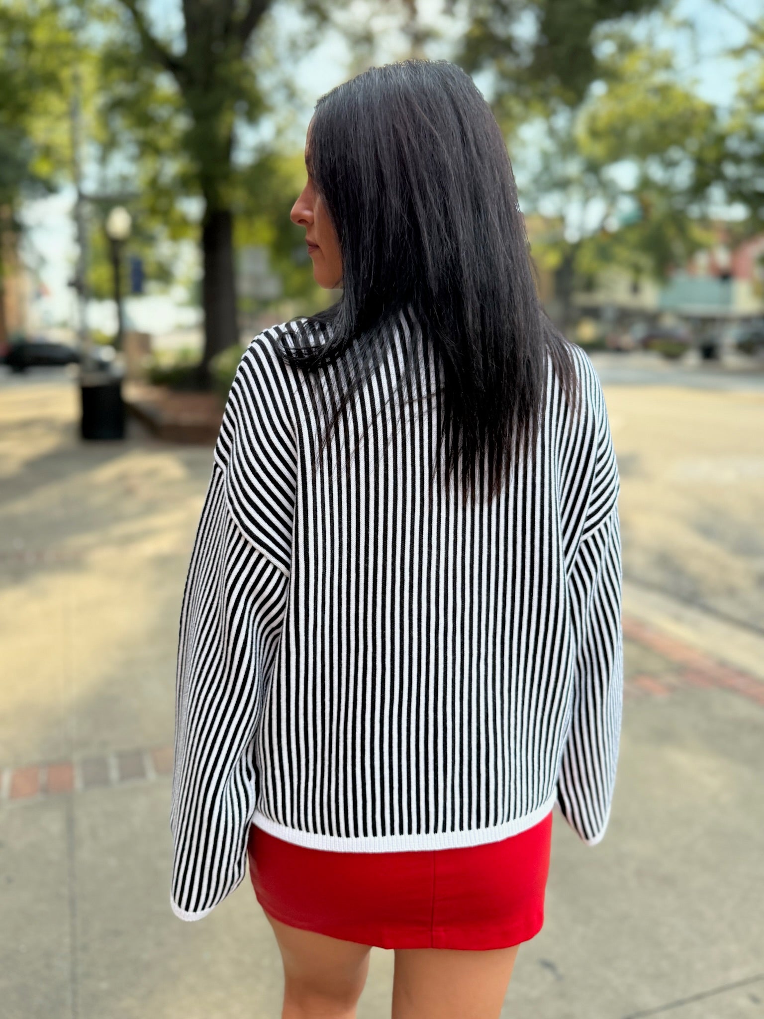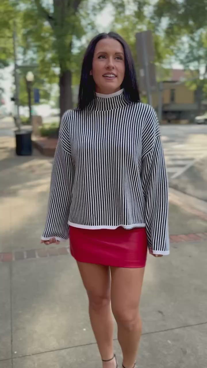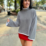 This high-neck sweater brings effortless modern edge with its crisp black-and-ivory vertical stripes. Designed with a relaxed drop-shoulder silhouette and wide sleeves, it drapes with ease while keeping a clean finish. Perfect with denim or tailored trousers for a chic, streamlined look.