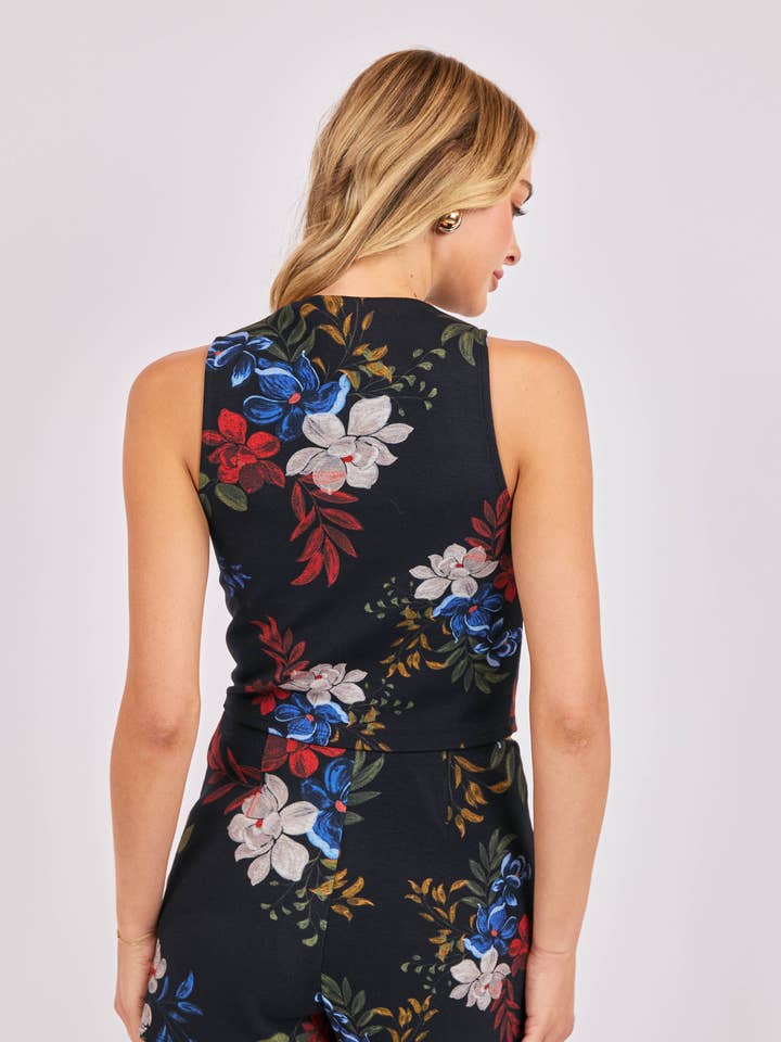 The Black Multi Four Seasons Highneck Crop Top is bold, vibrant, and made to turn heads. Featuring a sleek high neckline and a cropped cut, it’s elevated with a stunning floral print that pops against the dark backdrop. The fitted silhouette flatters your shape while giving just the right amount of edge. Perfect with the matching skirt or styled solo, this top brings a chic statement to any occasion.