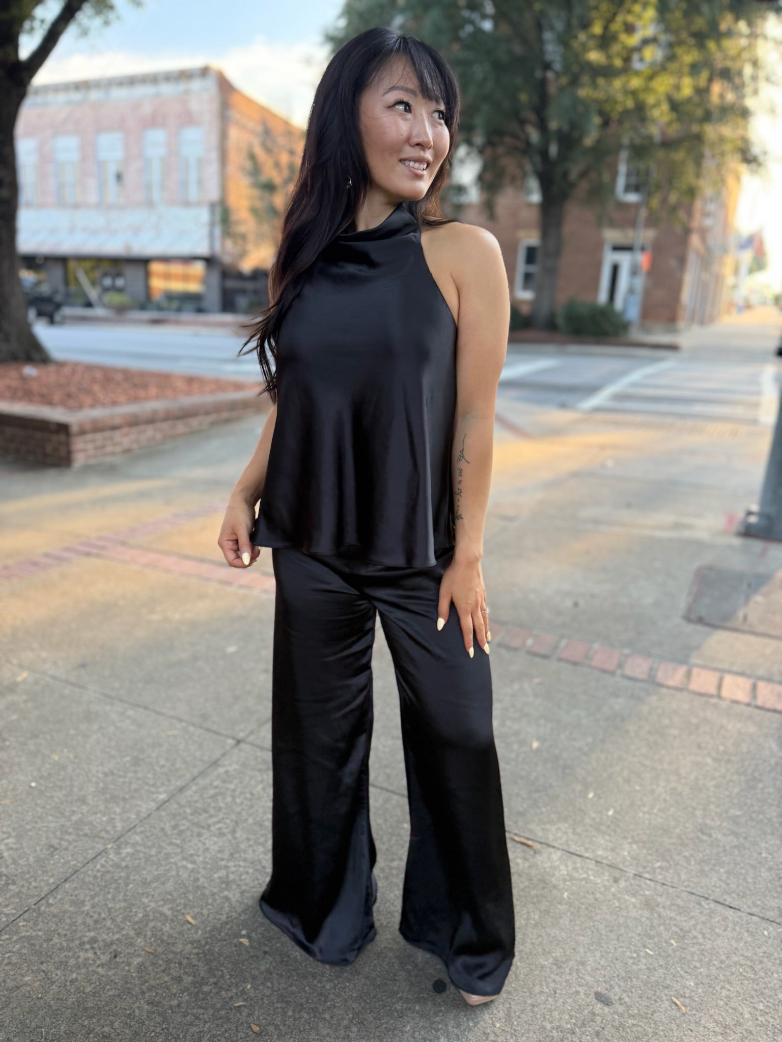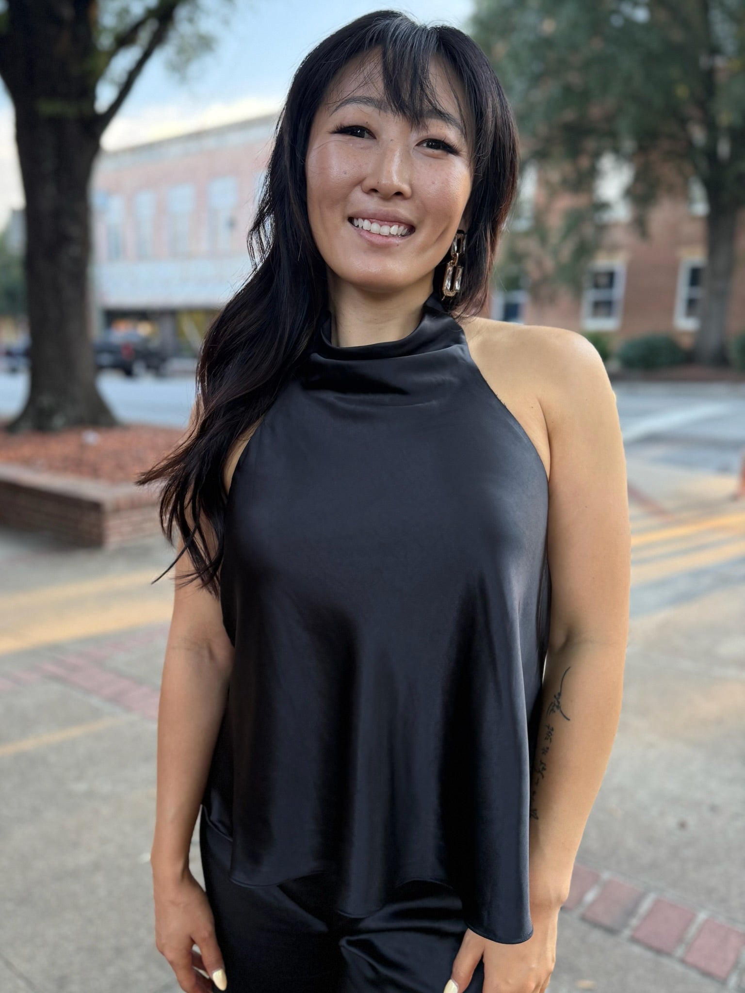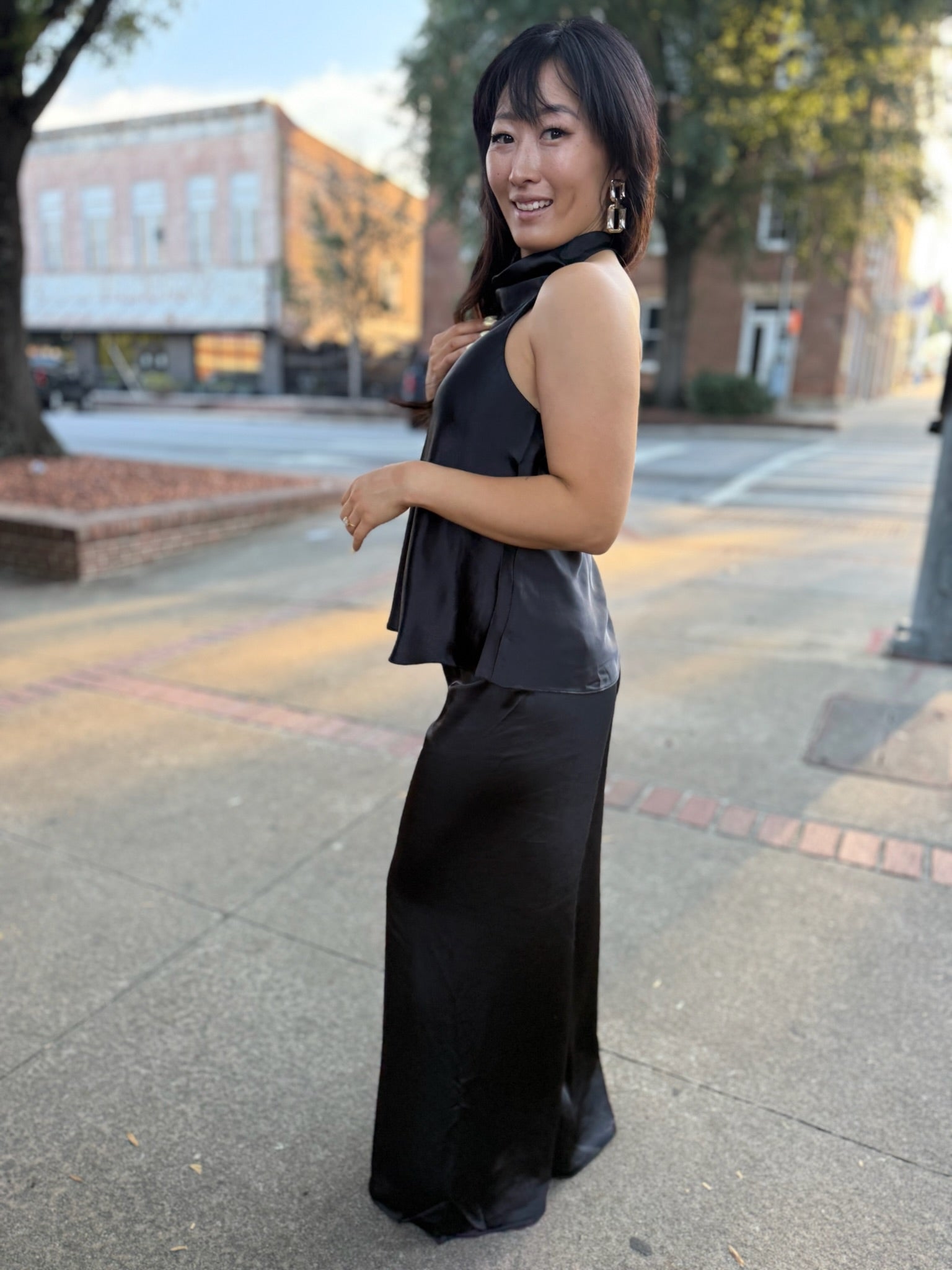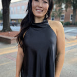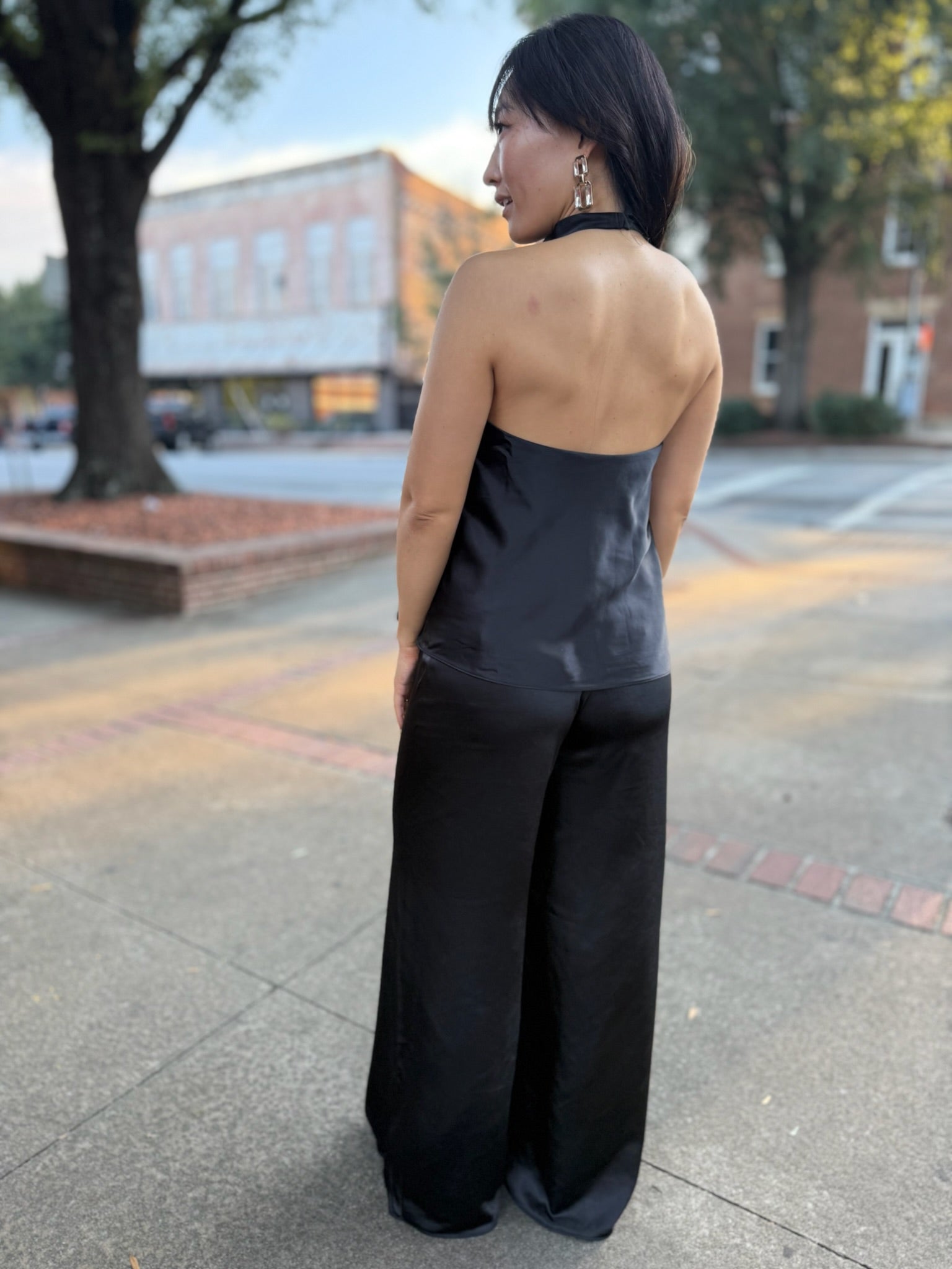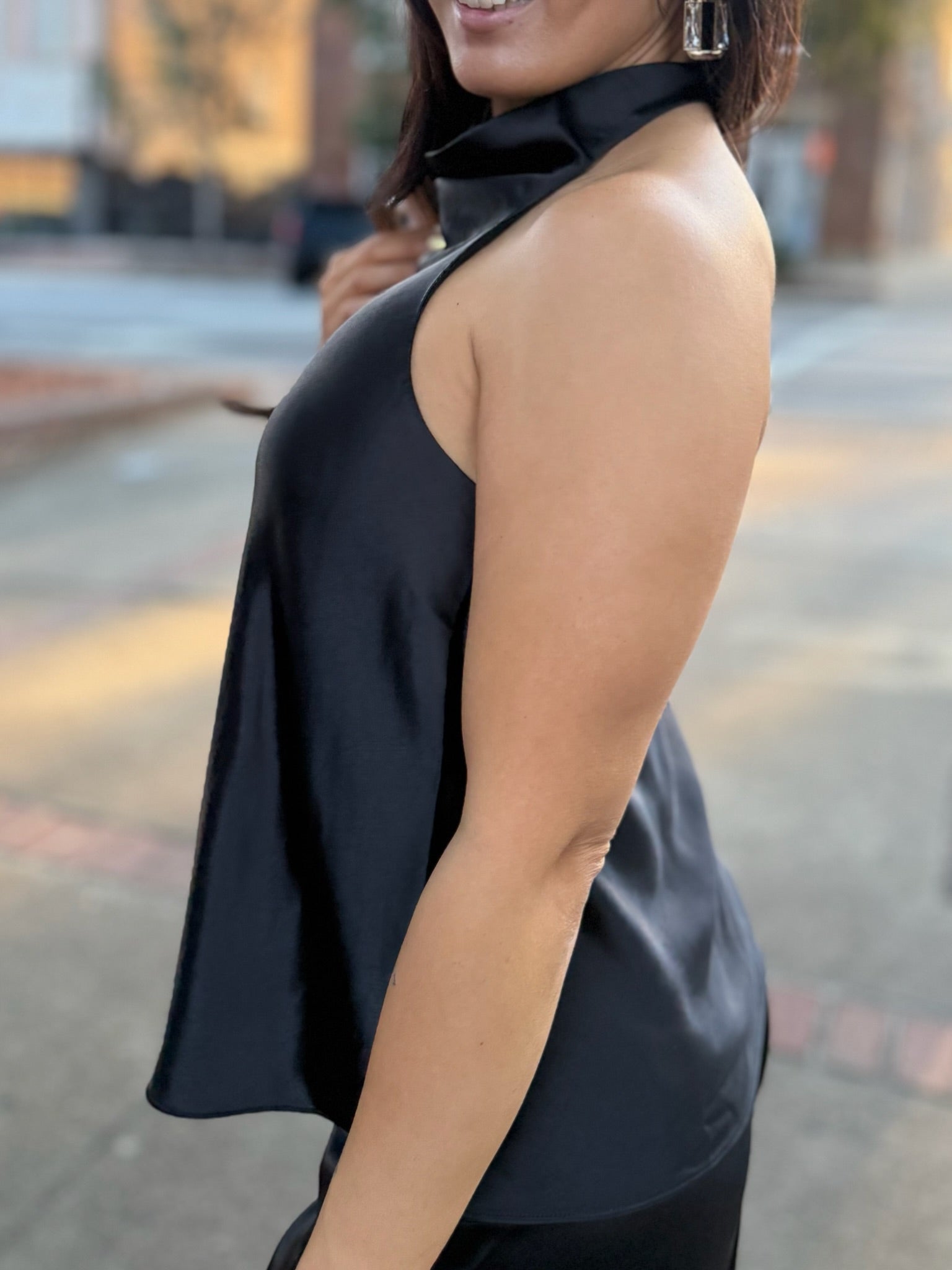 Elevate your look with this sleek satin halter neck top. Crafted from a smooth, lustrous fabric, it drapes effortlessly for a sophisticated yet relaxed fit. The halter neckline adds a modern, elegant touch, while the sleeveless cut makes it perfect for layering or wearing on its own. Designed with a slightly flowy silhouette, this top offers comfort and chic style, ideal for both day-to-night dressing.