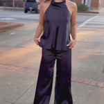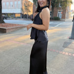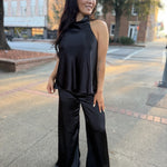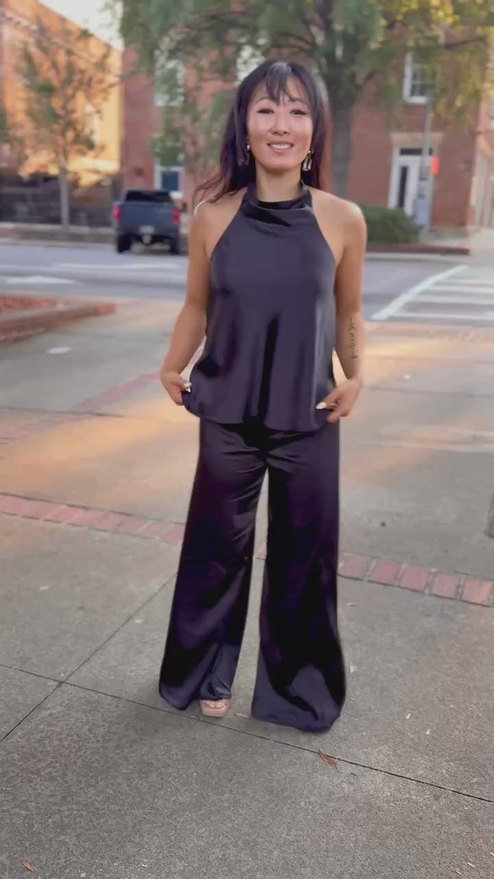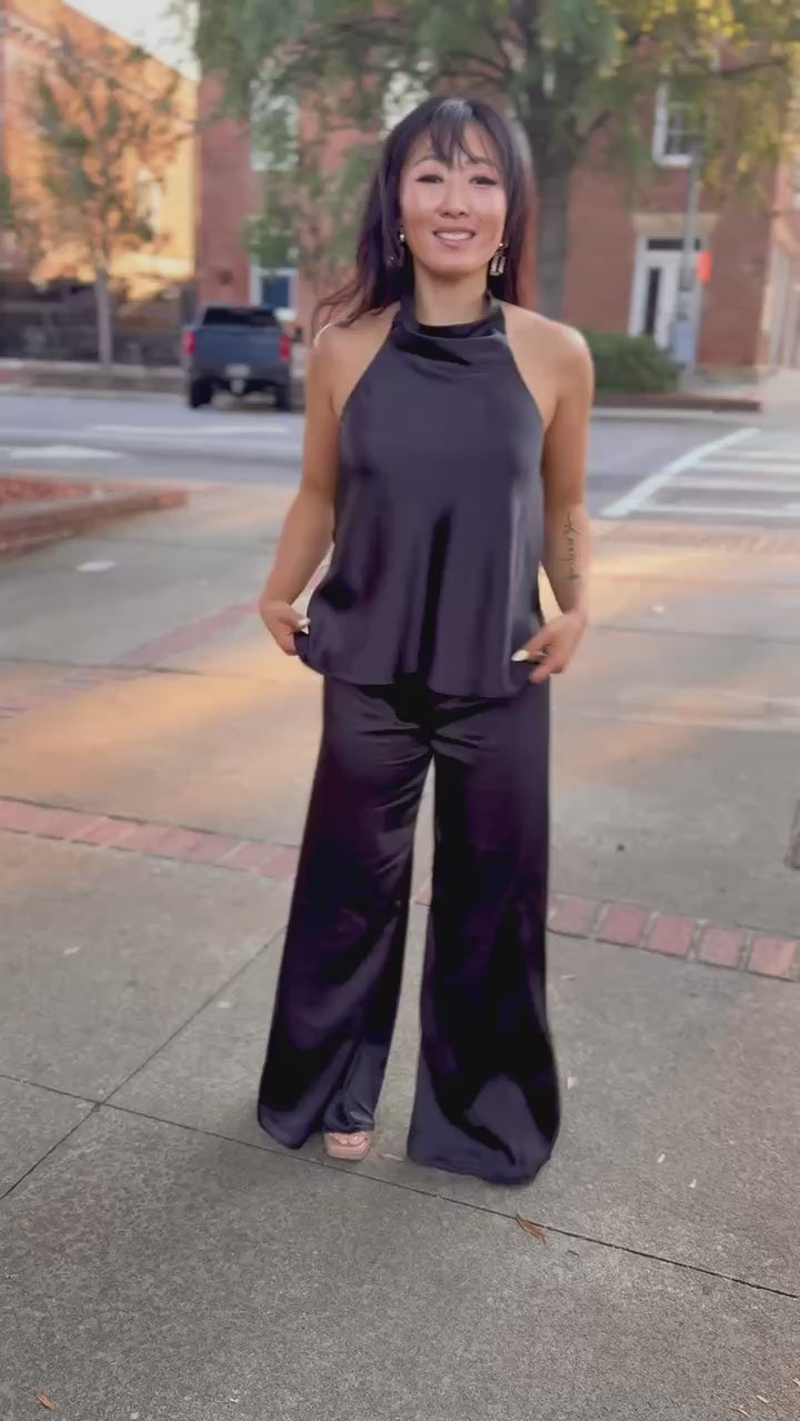 Elevate your look with these sleek black satin pants, designed with a high-rise fit and a fluid wide-leg silhouette that drapes effortlessly. The lightweight satin fabric offers a subtle sheen, giving them a sophisticated edge perfect for day-to-night wear. Full-length and elongating, they pair beautifully with heels or flats for a polished finish. A versatile closet staple that moves with elegance and ease.