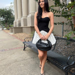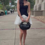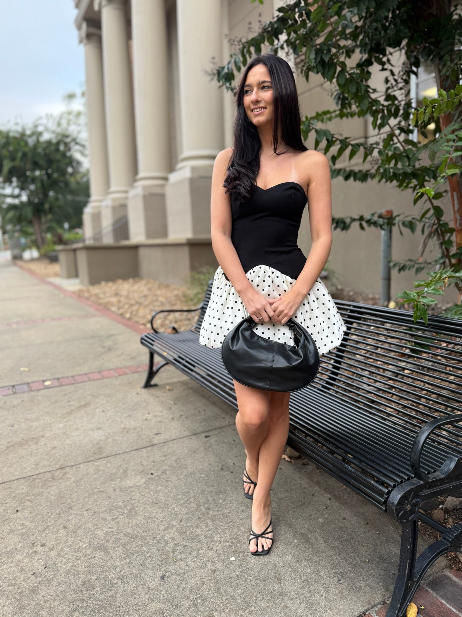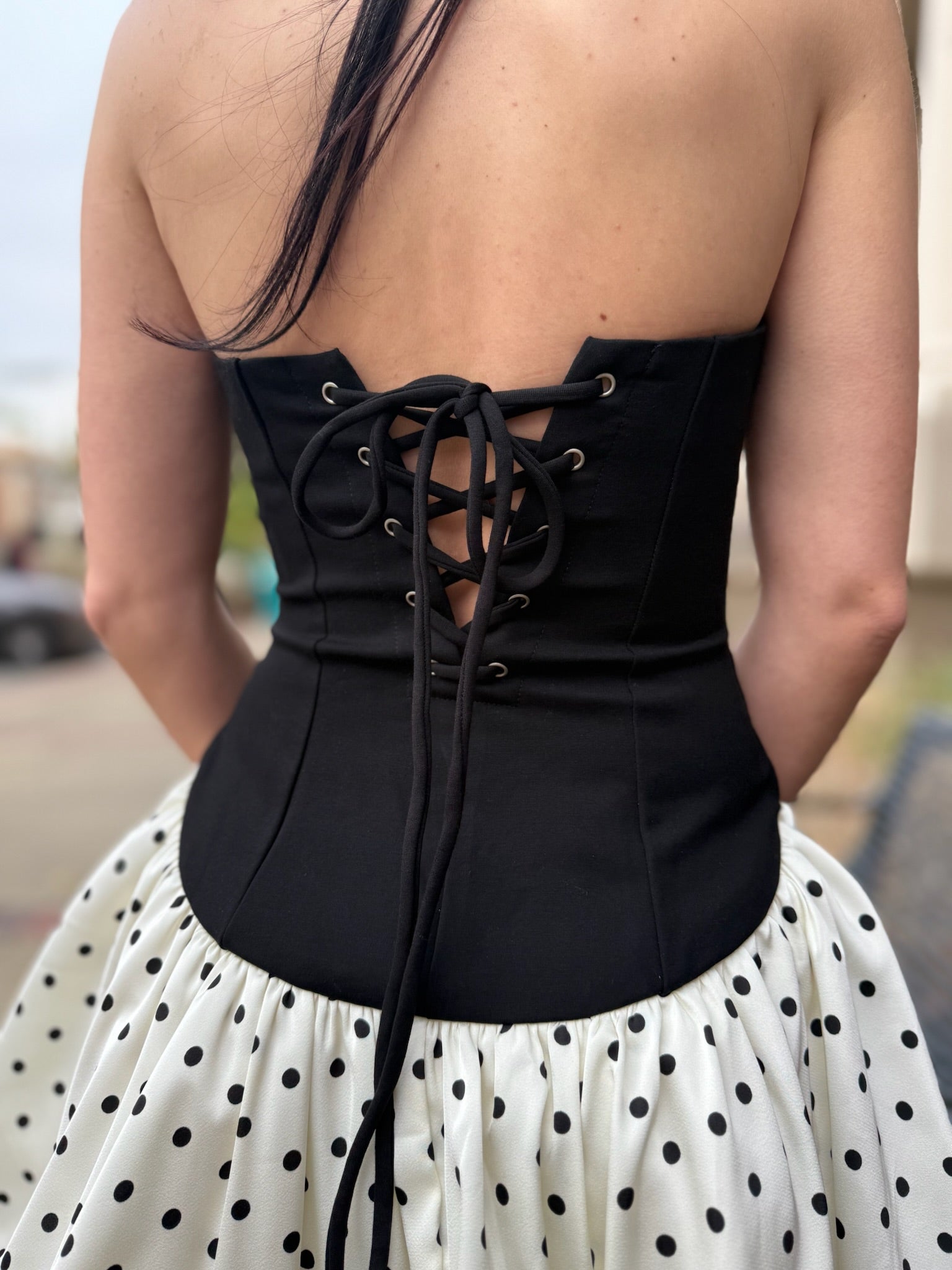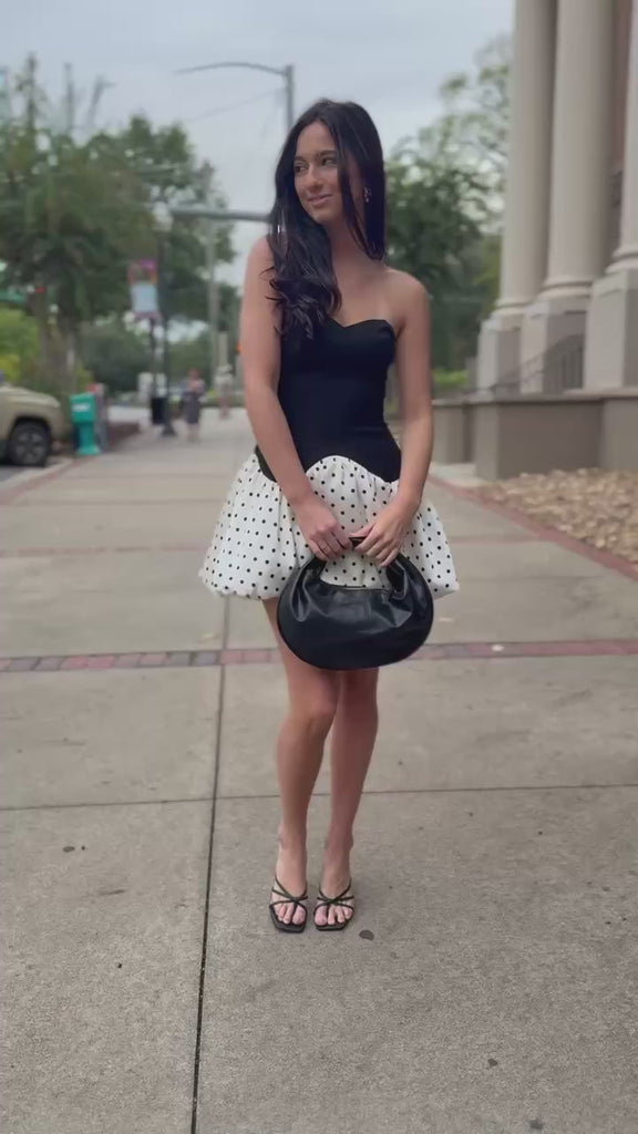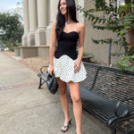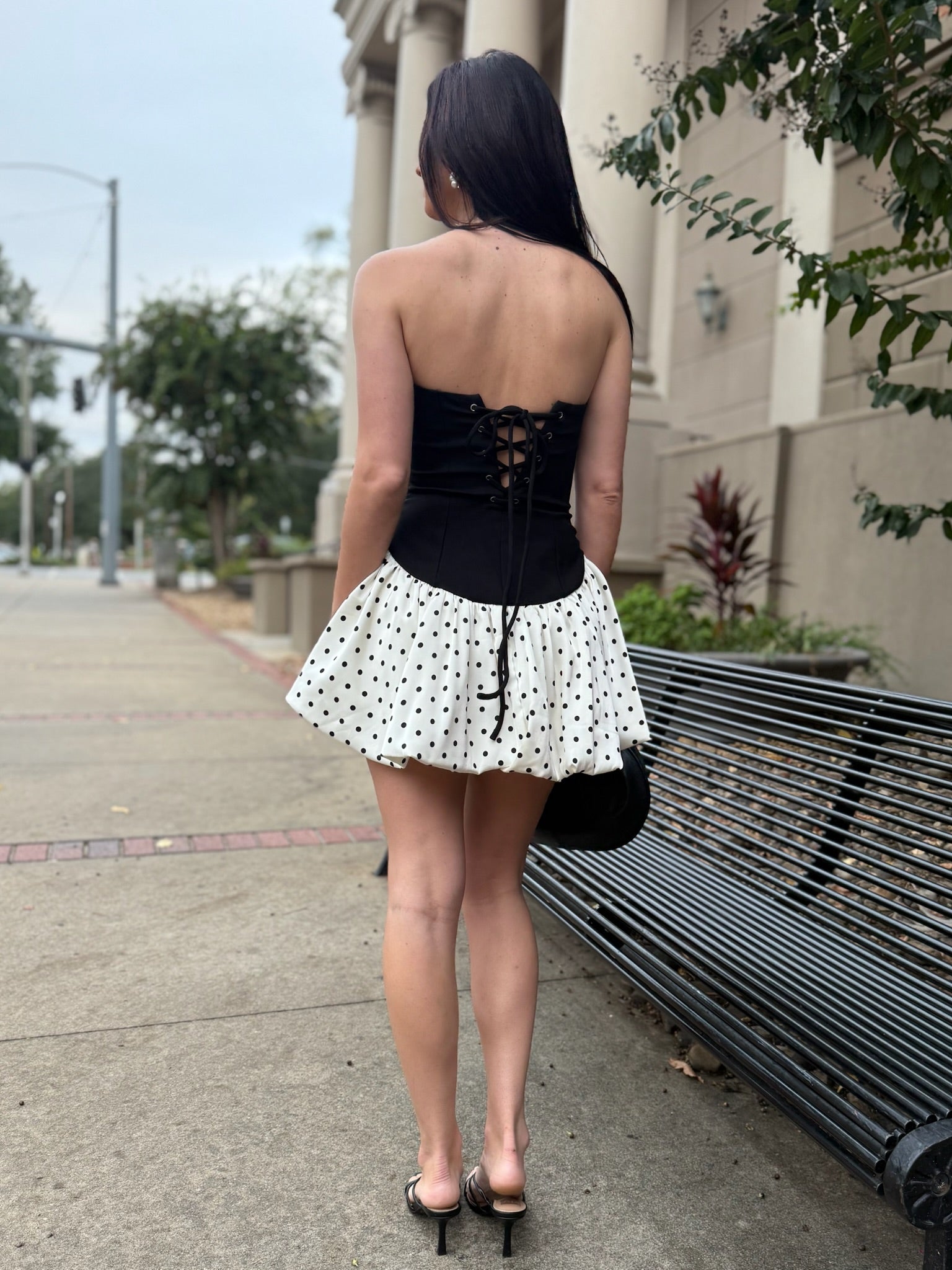 The Black Strapless Sweetheart Neck Polka Dot Bubble Dress is a flirty and fun statement piece. Featuring a strapless sweetheart neckline with a back lace-up bodice, it’s paired with a playful polka dot printed bubble skirt for a striking contrast. Fully lined for comfort, this mini dress is perfect for making an entrance.