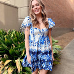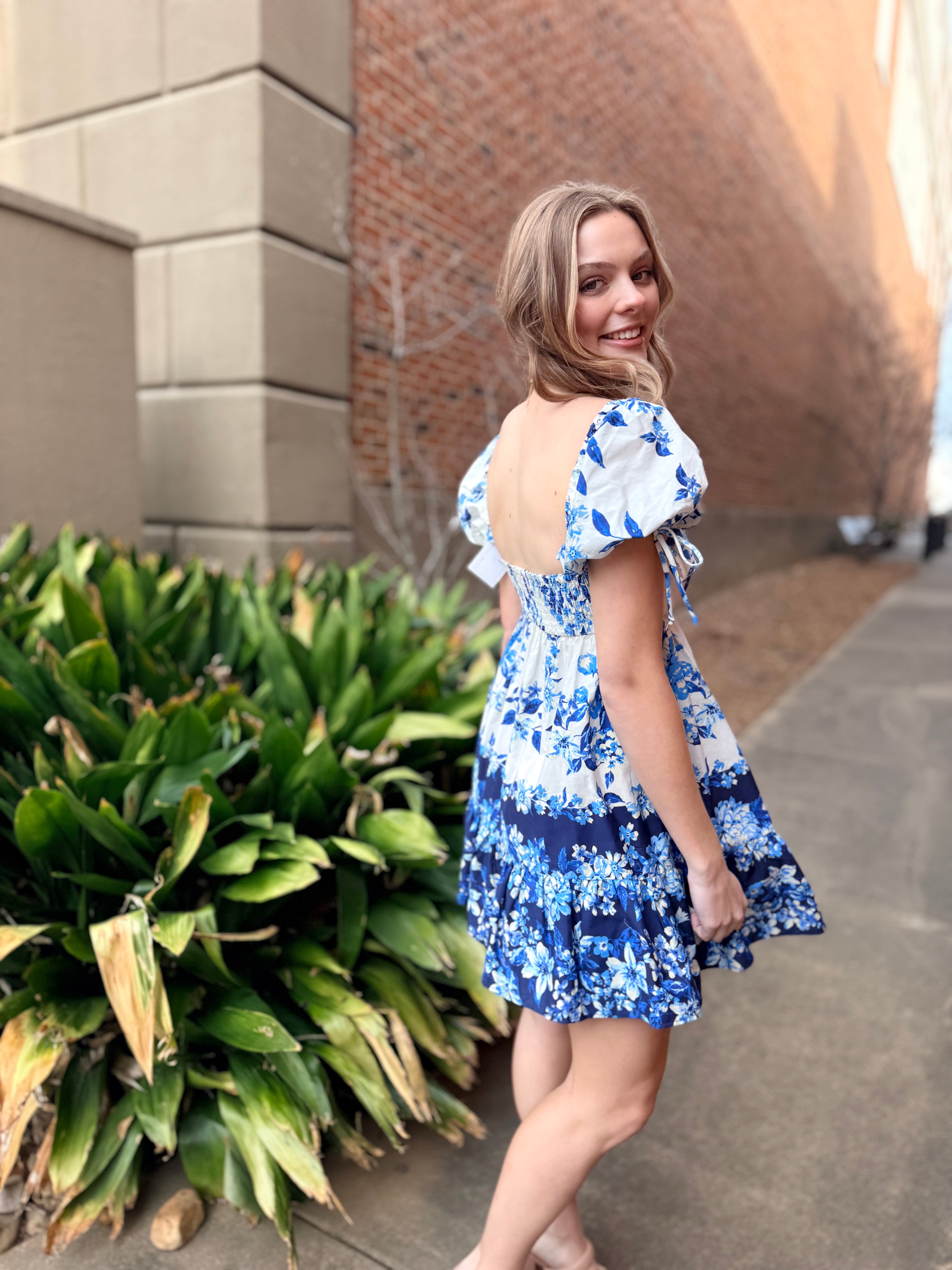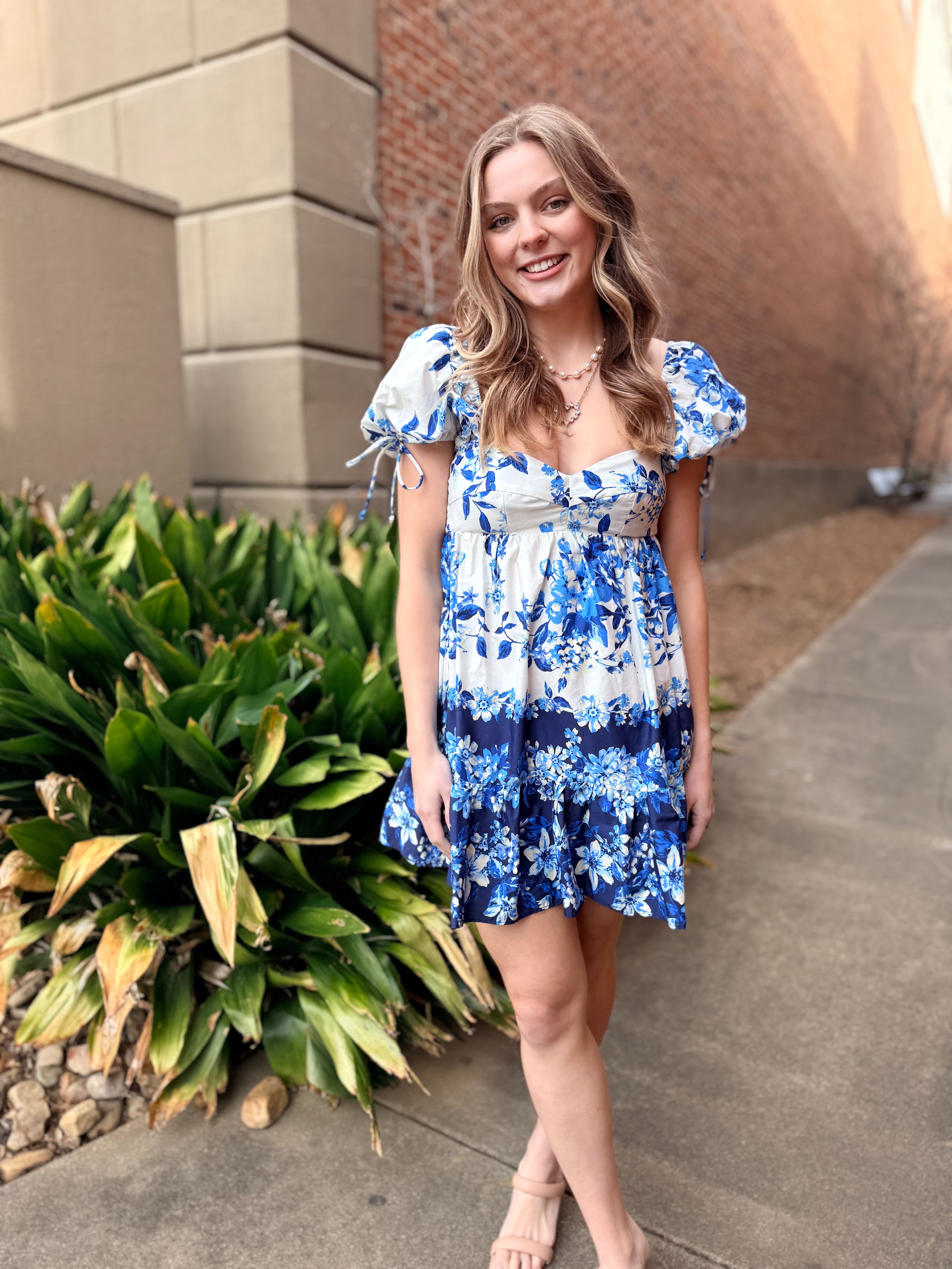 Sweet, feminine, and made for sunny days — the Bluebell Garden Mini Dress is a true spring standout. Featuring a romantic blue floral print on a soft ivory backdrop, this dress is designed with a flattering sweetheart neckline, puff sleeves with delicate tie details, and a flowy empire waist silhouette that feels effortlessly flattering. The tiered skirt with its bold navy floral border adds the perfect pop of contrast and movement. Lightweight and easy to wear, it’s perfect for brunch dates, showers, vacation dinners, or any moment that calls for a little extra charm. Just add sandals or wedges and you’re ready to go.