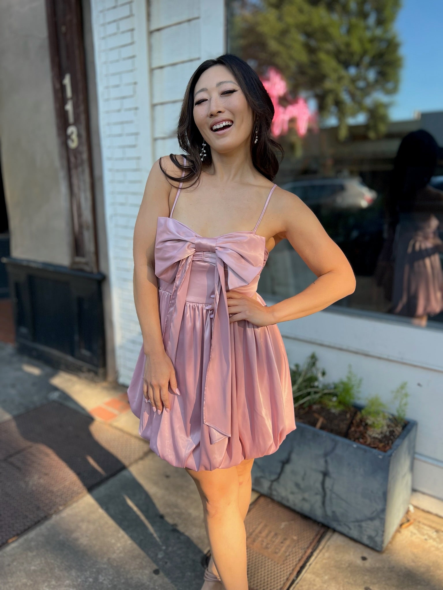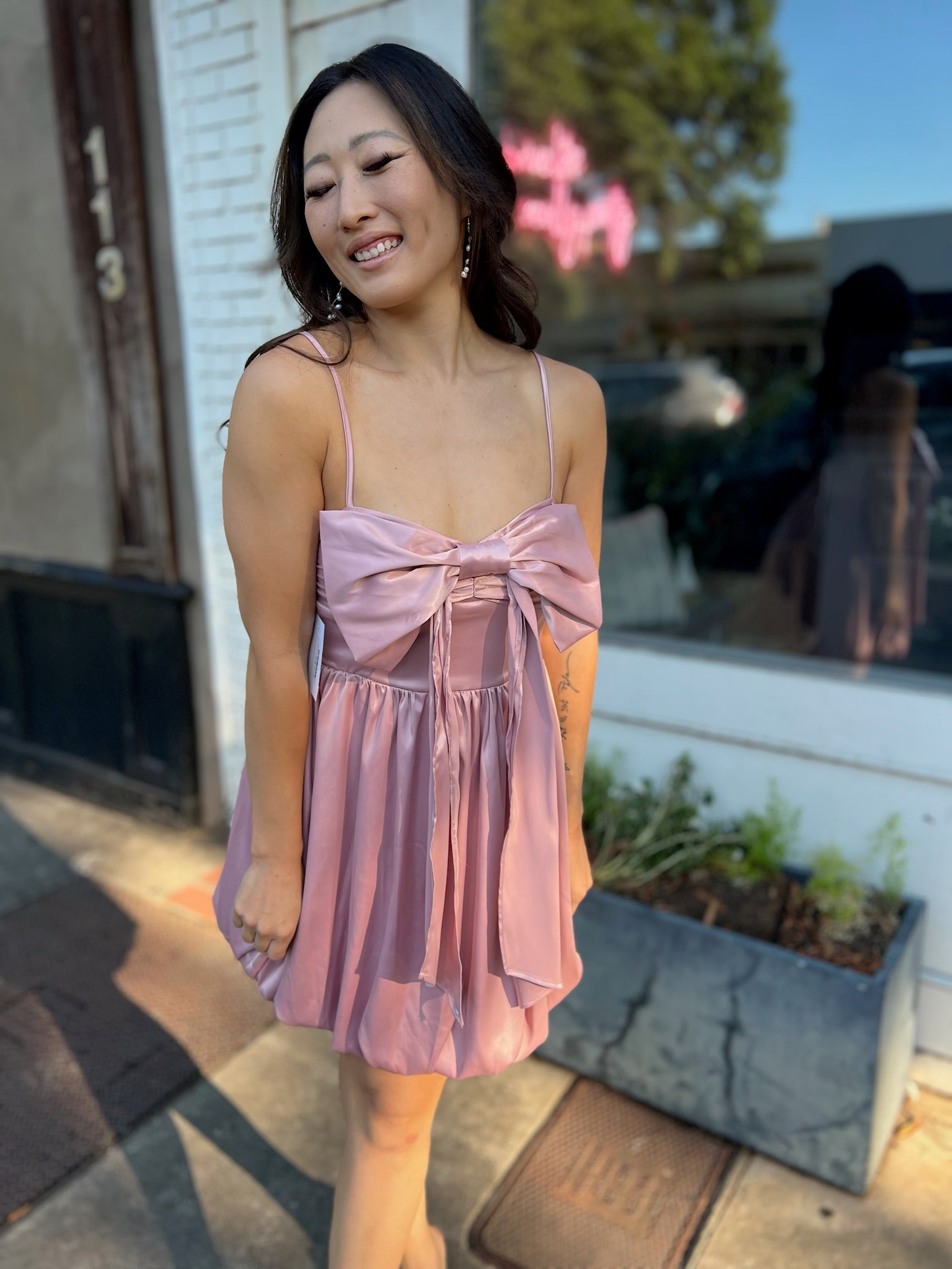 A satin sheen, monochromatic A-line mini dress with a sweetheart neckline and a large bow detail. It features a fitted bodice, gathered waist, ruched back, and a discreet back zipper. The hem is gathered and sewn for a refined finish