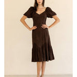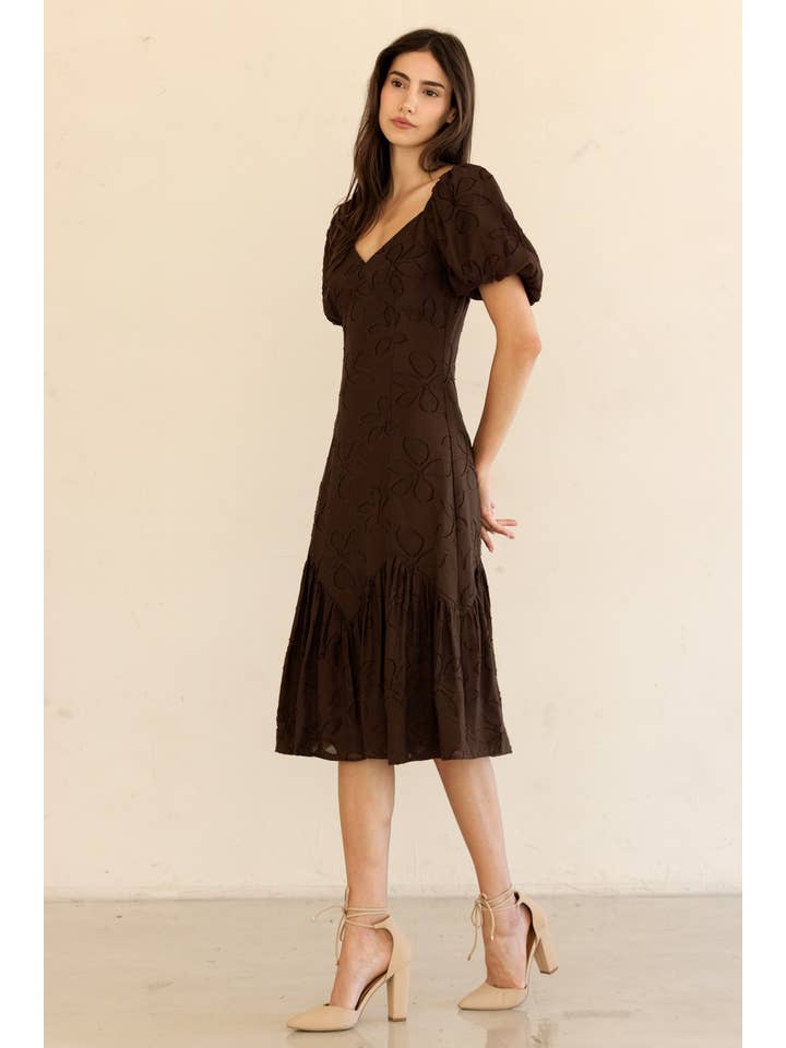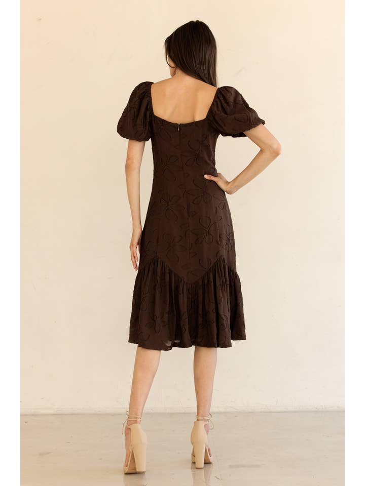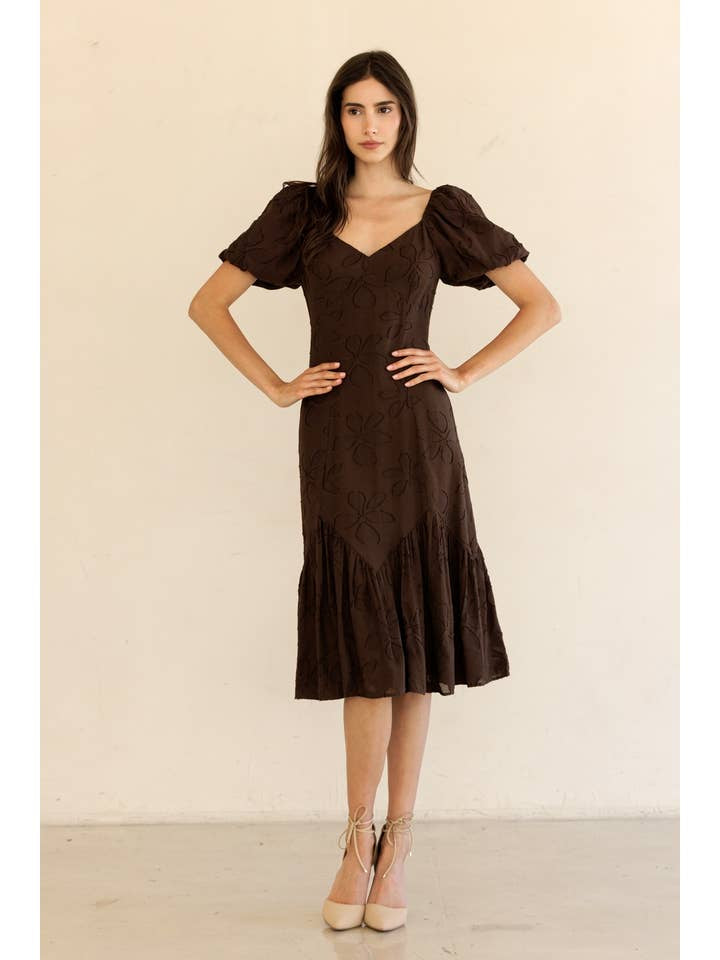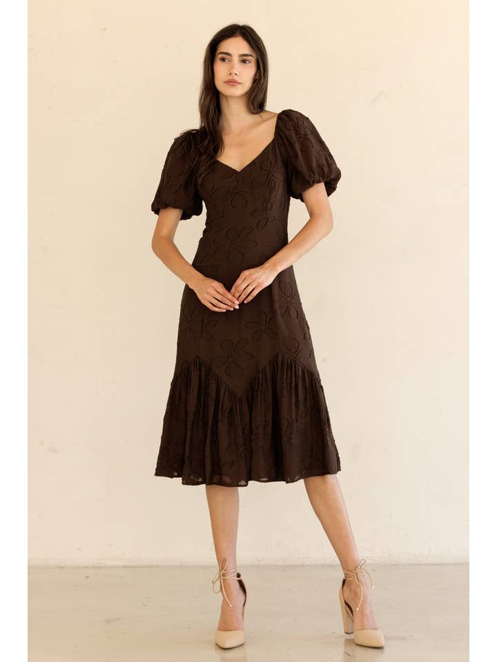 Feminine and effortlessly elegant, this dress features a relaxed A-line silhouette with a flared skirt that moves beautifully with every step. The short puff sleeves, finished with elastic hems, add a voluminous touch, while the lightweight embroidered fabric showcases a delicate textured floral design. A tiered ruffle at the hemline enhances the flowy shape, and a back zipper closure ensures easy wear. The combination of puff sleeves and ruffled detail creates a timeless, romantic look perfect for any occasion.