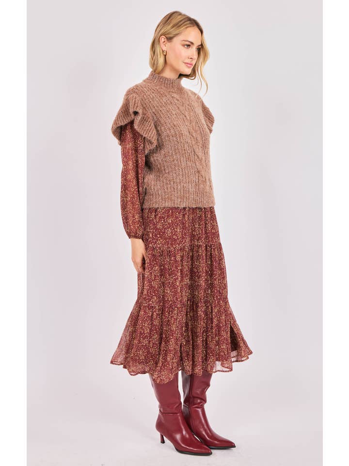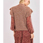 Add a touch of feminine charm to your cozy staples with the Brown Willow Ruffle Shoulder Sweater. Featuring delicate ruffle accents at the shoulders and a textured cable knit, this piece blends soft sophistication with everyday wearability. The earthy brown hue makes it easy to pair with flowy skirts or tailored pants, while the relaxed fit keeps it effortlessly chic and comfortable. Perfect for layering or wearing on its own, this sweater is a statement piece with timeless appeal.