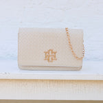 This woven vegan leather crossbody is equipped to keep you organized! There are built in credit card slots inside as well as a zippered pocket and open pocket. It features the signature, shiny gold Caroline Hill logo on the front magnetic flap. The chain crossbody strap has a strip of matching material to sit comfortably on your shoulder. It can also be removed to carry as a stylish clutch. Great for events or everyday wear!