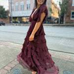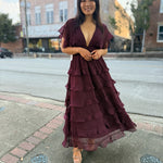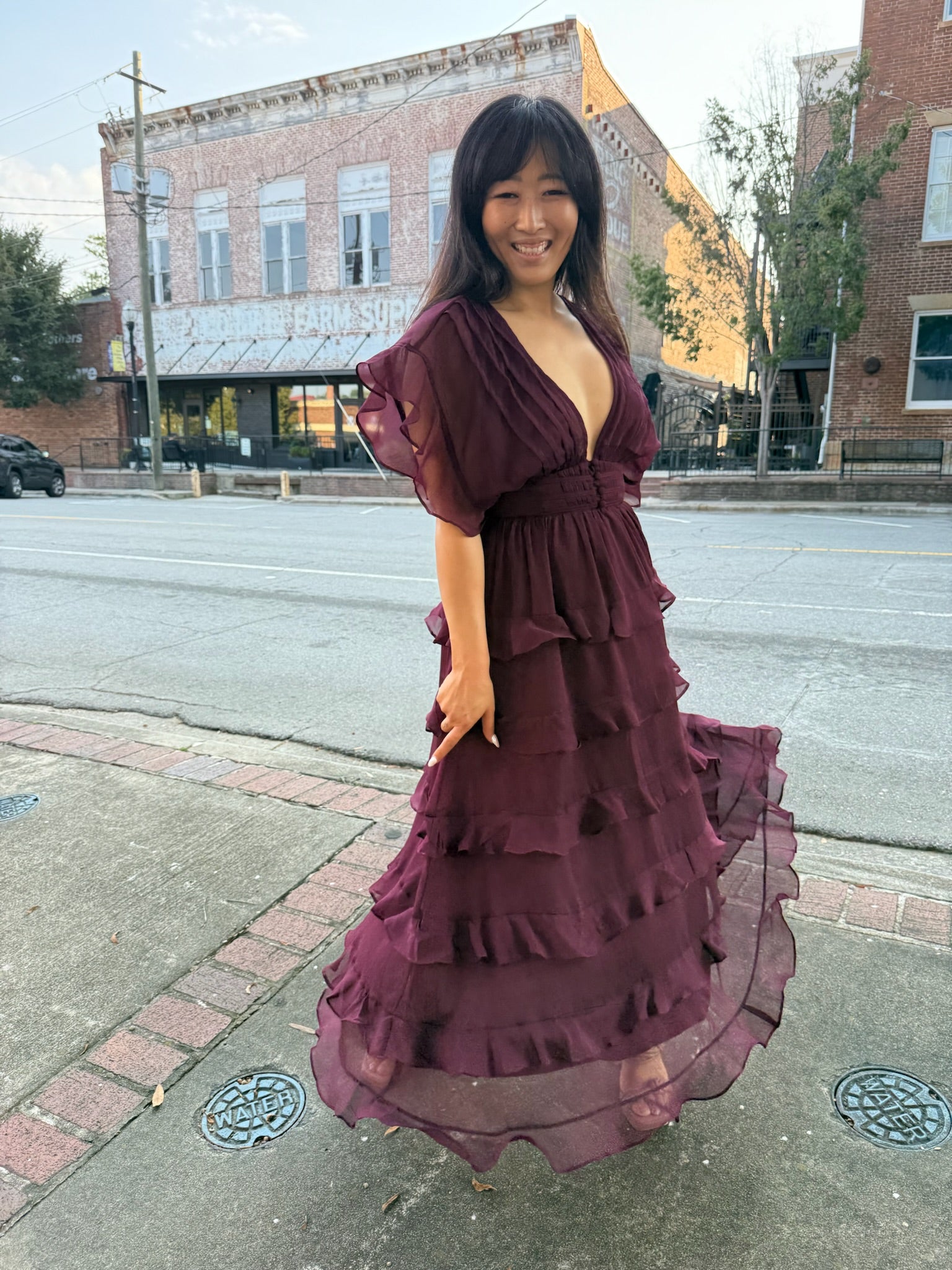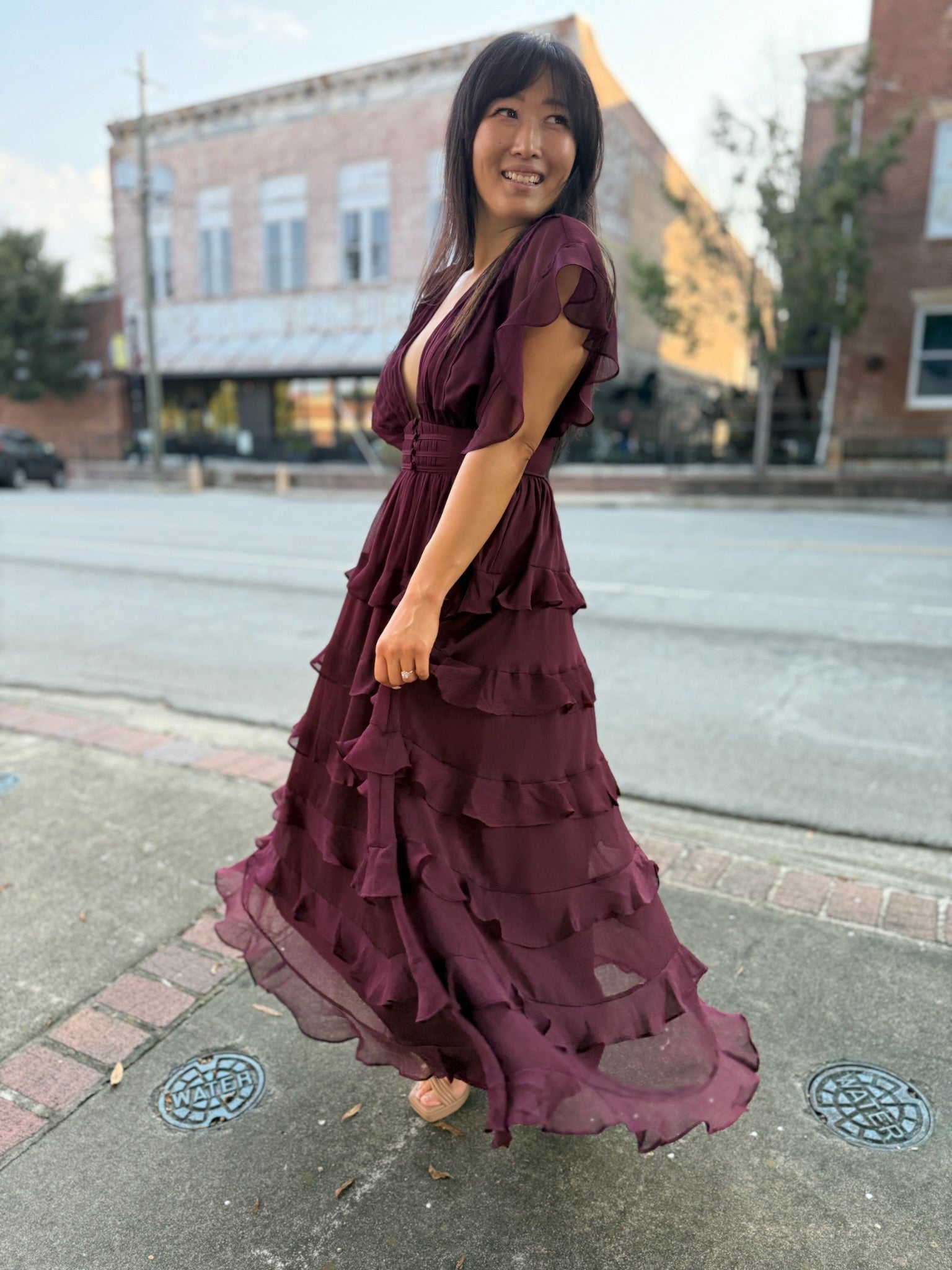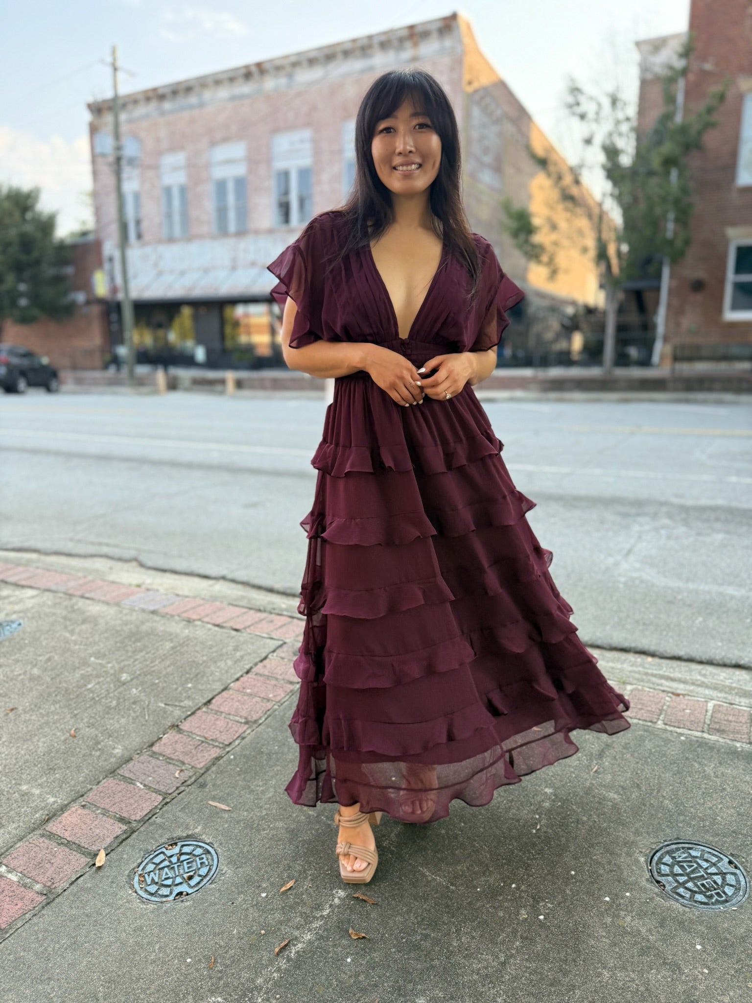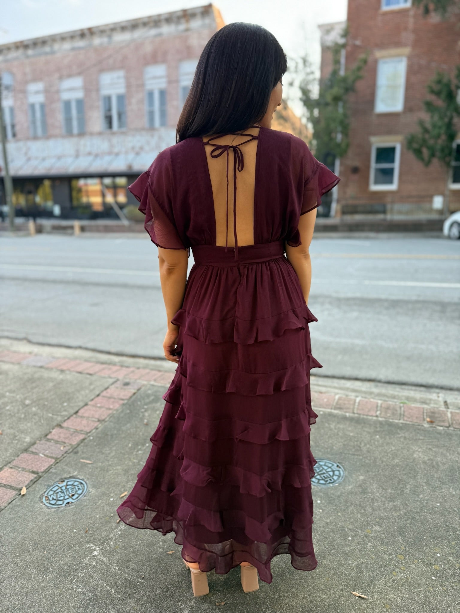 Elegant and romantic, this A-line midi dress features a flowy silhouette with a deep V plunge neckline and softly pleated bodice detailing. The cinched waist is accented with a wide band and fabric-covered decorative buttons, while flutter sleeves add a graceful touch. An open back with a tie-string closure and an invisible lower back zipper ensure an effortless fit. Finished with a tiered ruffle skirt, this piece moves beautifully and makes a statement at any special occasion.
