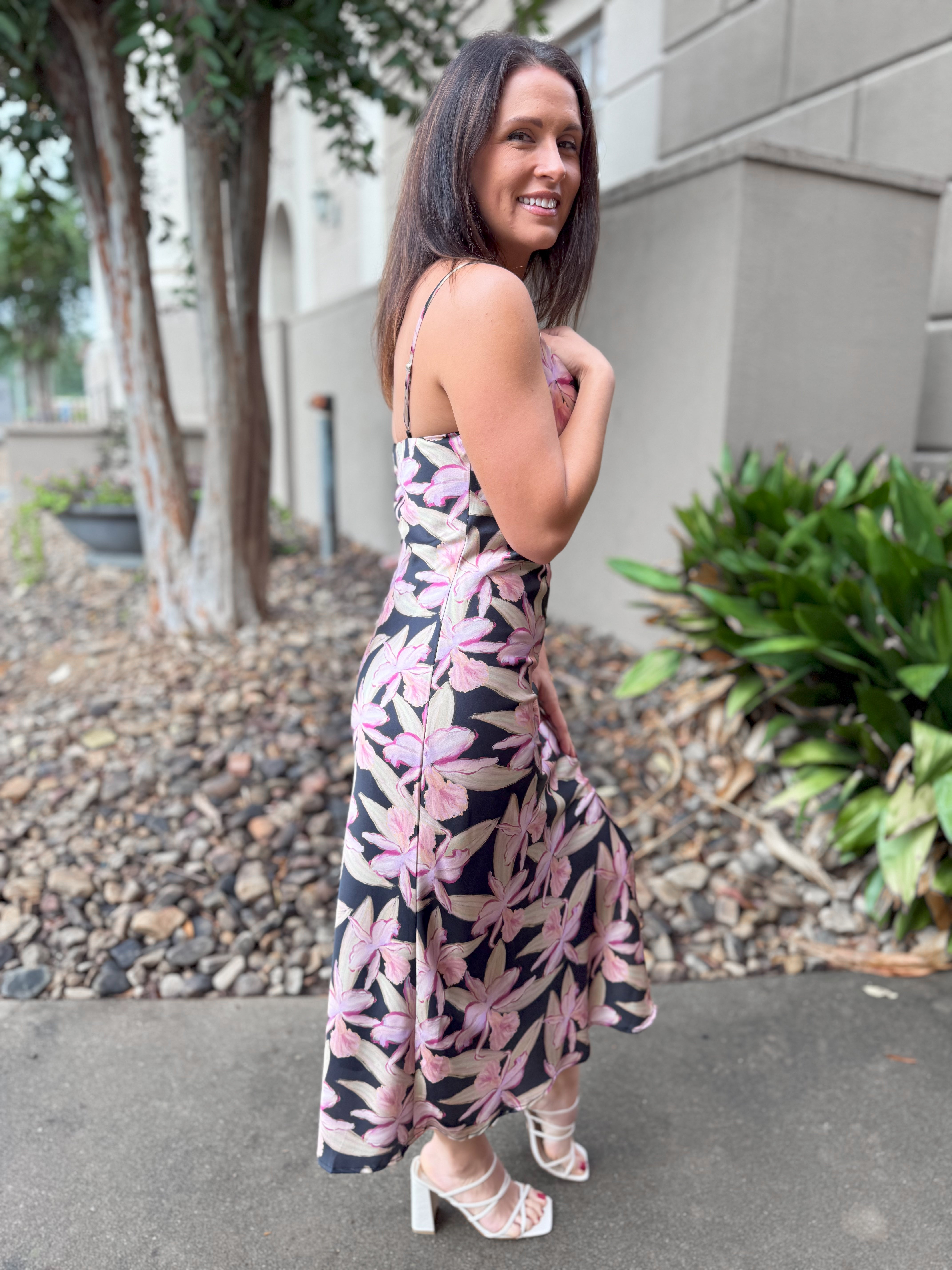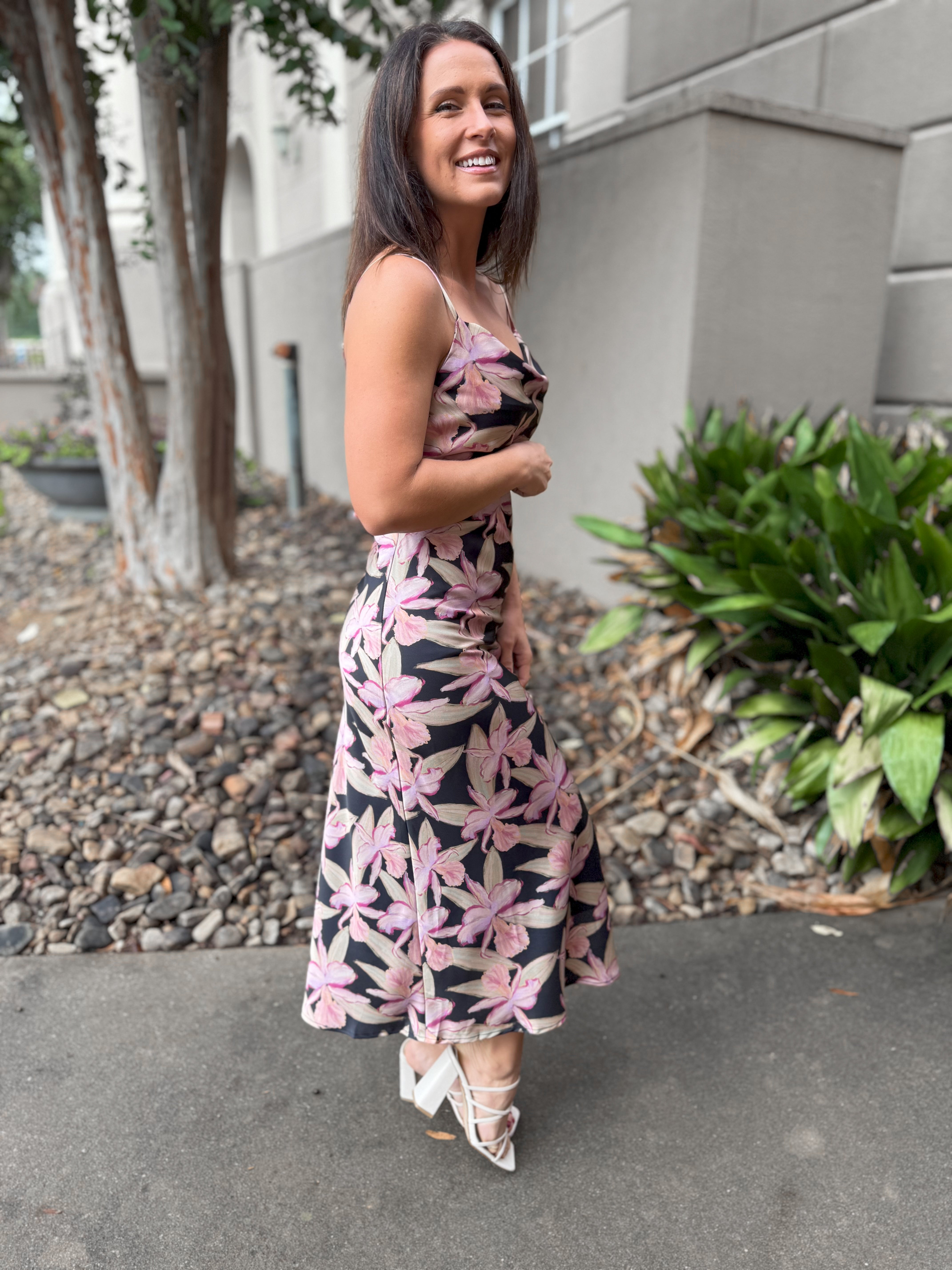 Elevate your wardrobe with this stunning cowl neck midi dress, designed to make a statement. Crafted with a soft, draping neckline, it showcases a bold, oversized floral print that exudes elegance and charm. Perfect for both daytime outings and evening events, this dress combines comfort with eye-catching style. Pair it with heels for a sophisticated look or flats for effortless chic.