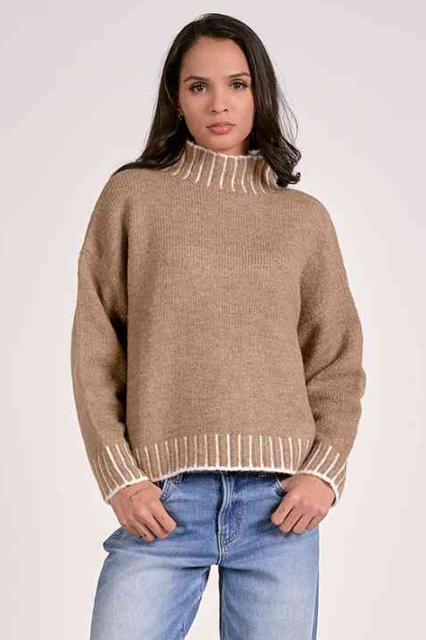 Cozy meets refined in this soft camel knit sweater, accented by contrasting ivory rib trim at the collar, cuffs, and hem. The mock neckline adds warmth while the relaxed shape makes it an easy throw-on piece. A timeless staple that pairs well with both denim and skirts for a polished casual vibe.