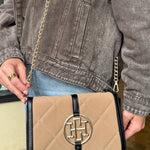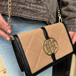 The Cecilia Circle Logo Handbag in Latte EC combines sleek style with practical design. Its Embossed croc texture and boxy shape create a modern, fashionable look, while the fold-over design with a magnetic closure ensures secure access. Featuring a prominent Caroline Hill circular logo, this crossbody bag offers ample space for your daily essentials, making it an ideal accessory for both everyday wear and chic outings.