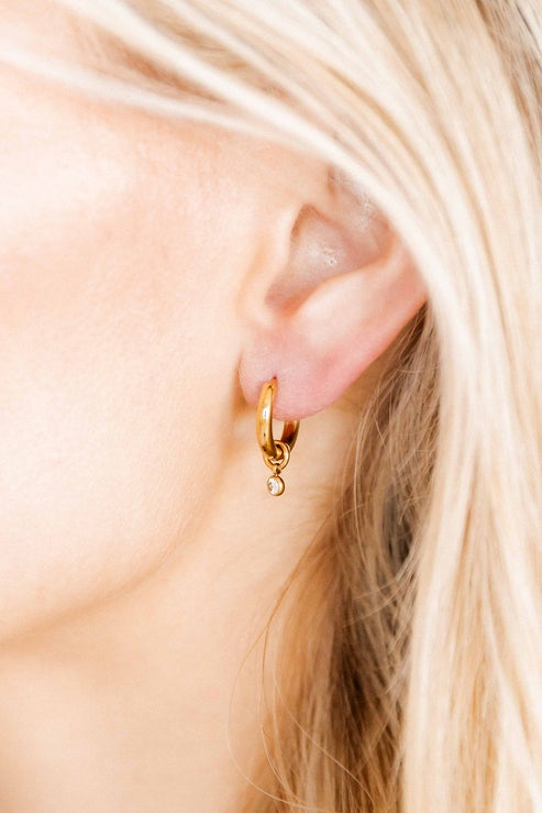 These earrings feature a sleek and sophisticated gold huggie hoop design with a delicate charm hanging from the bottom. The charm is a small, sparkling stone that adds a subtle yet radiant touch to the elegant hoop. The clean and polished finish of the gold hoop combined with the dainty charm makes these earrings perfect for both everyday wear and special occasions.