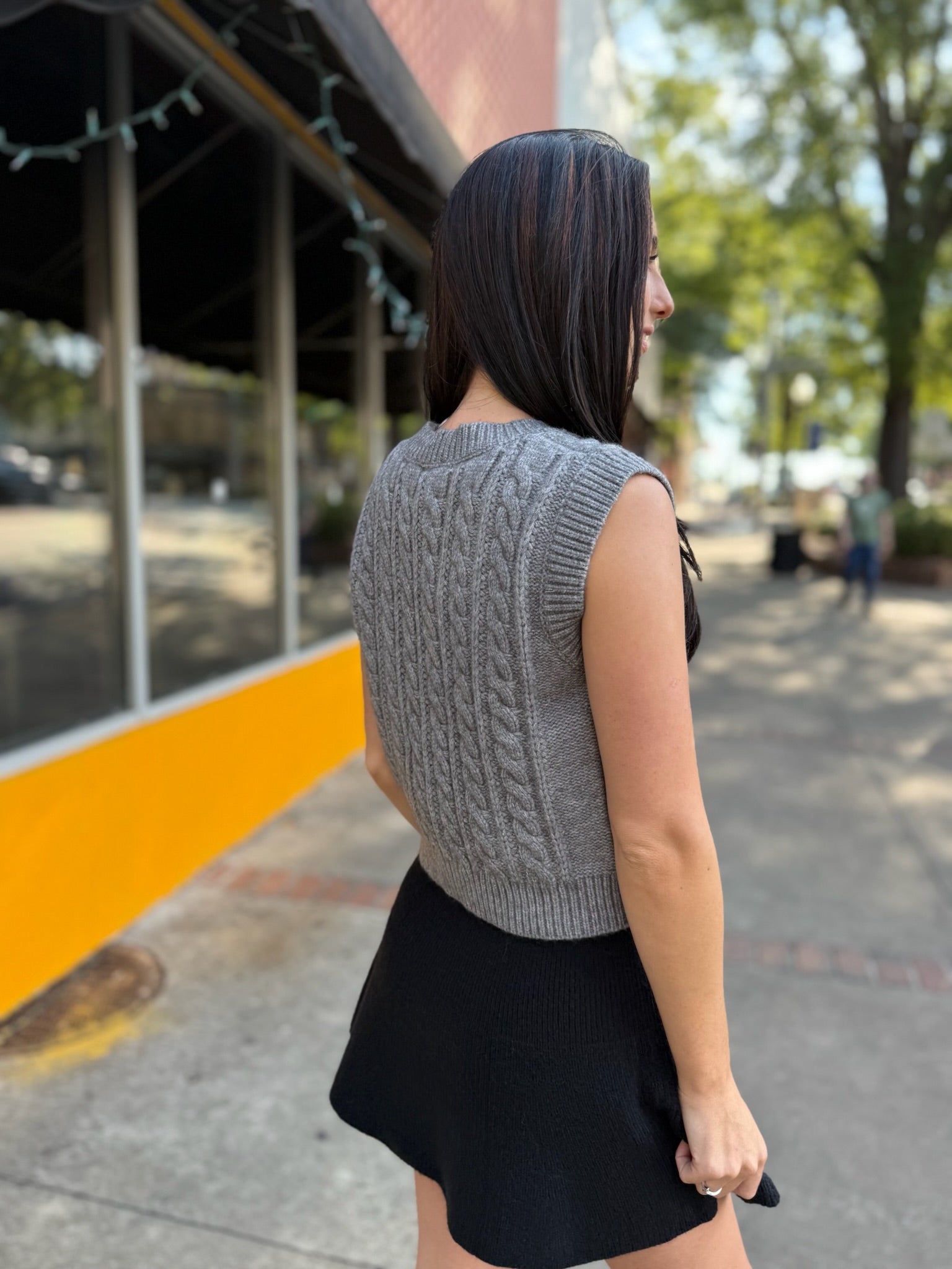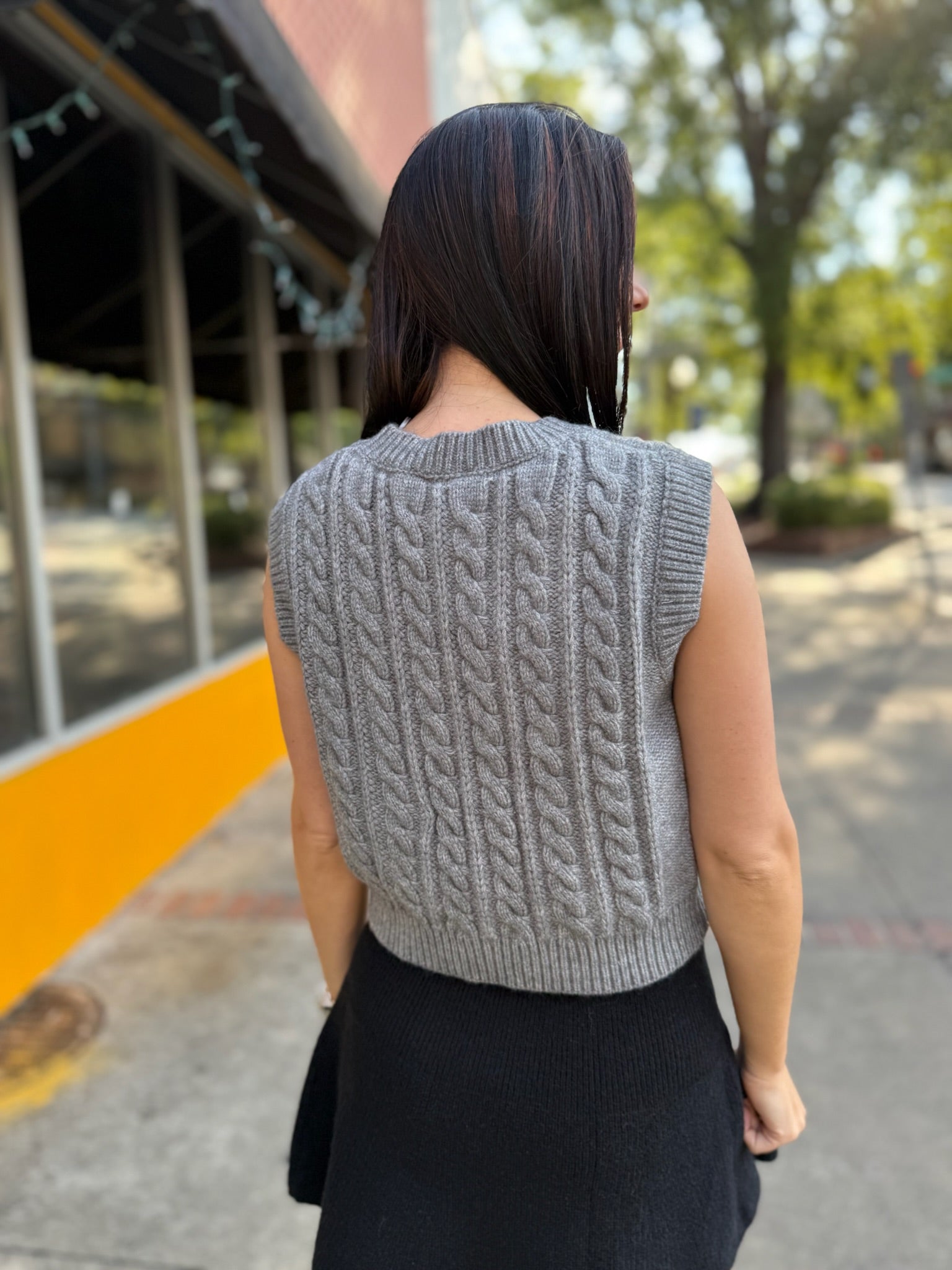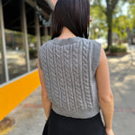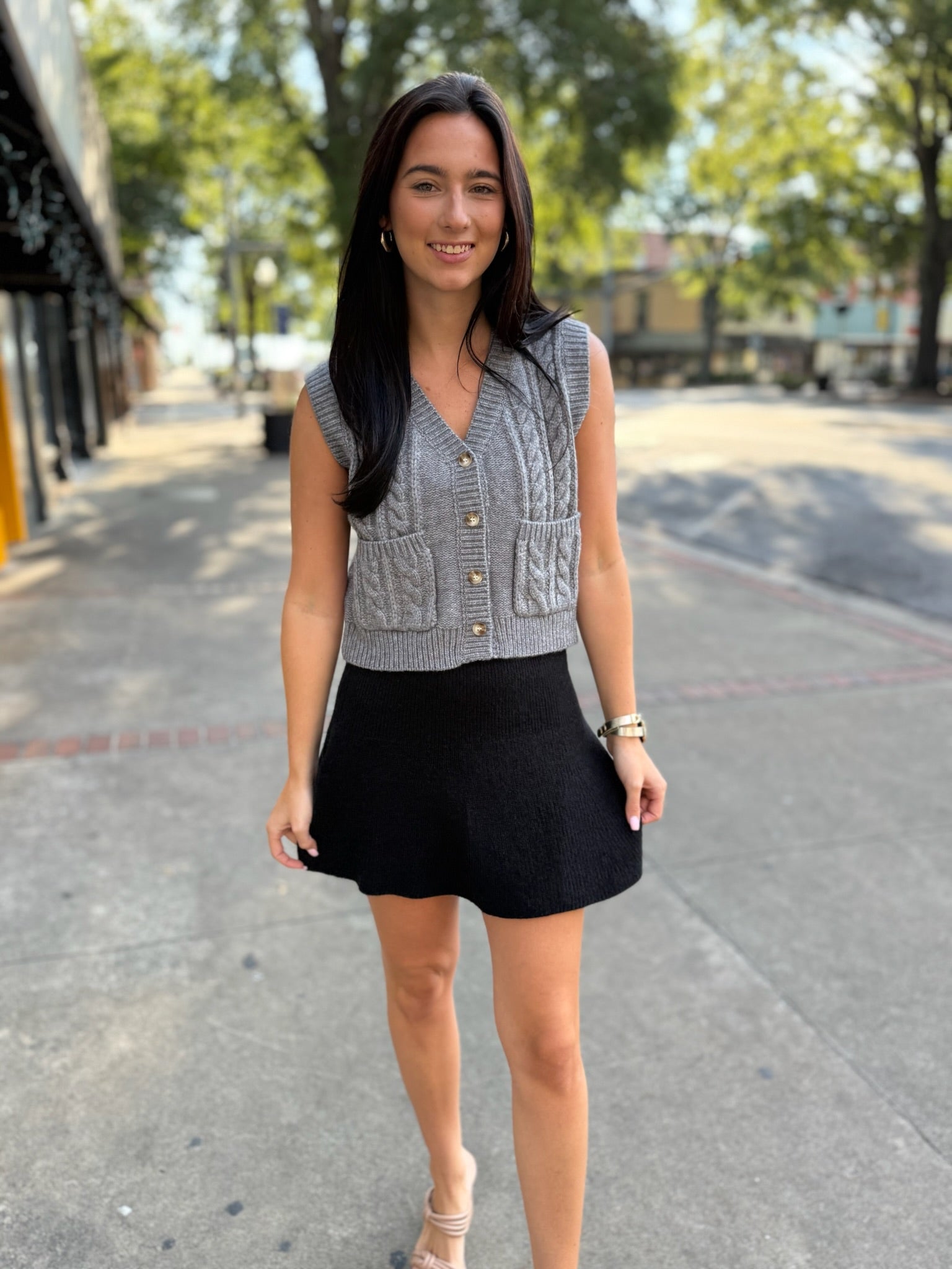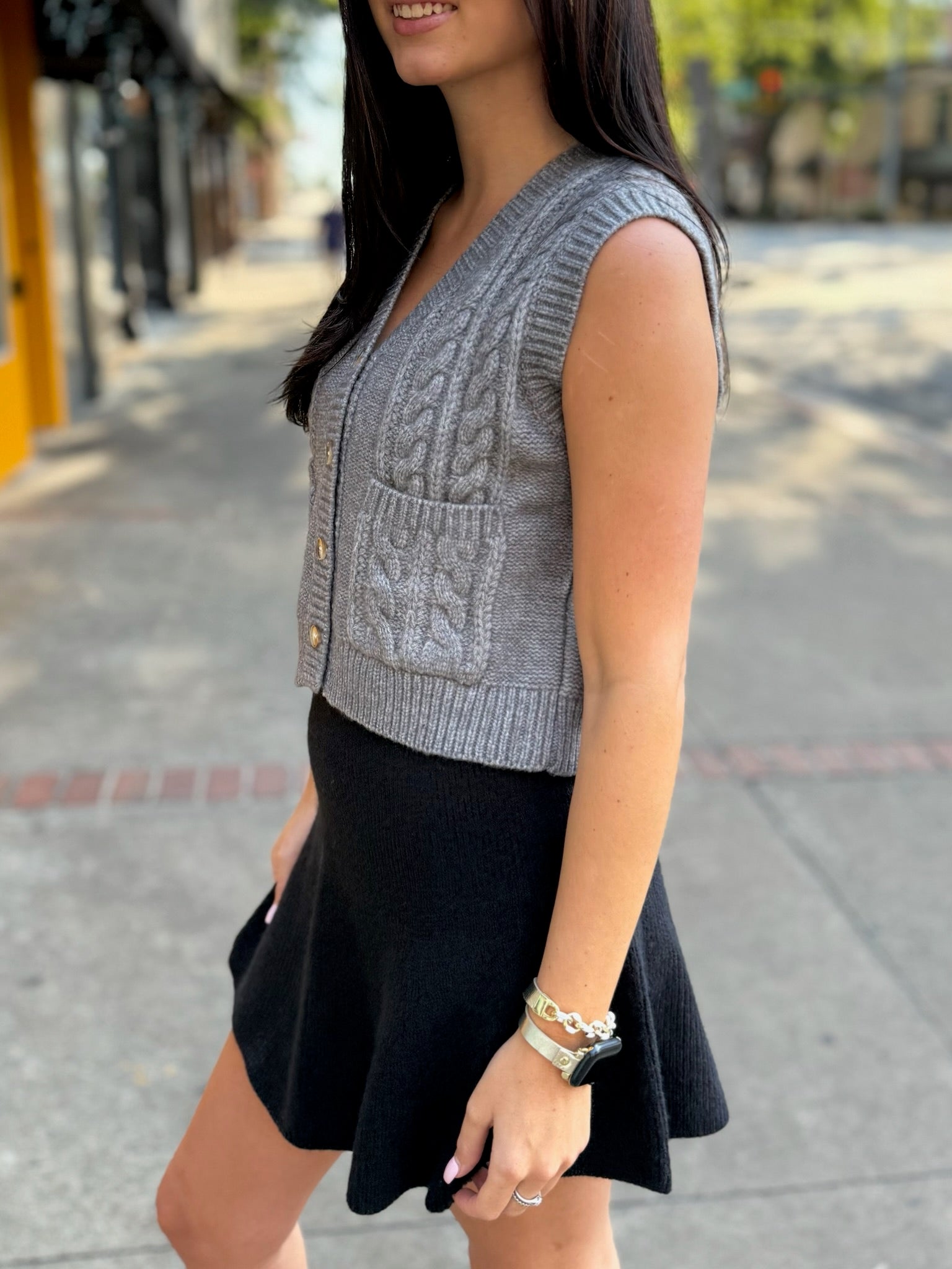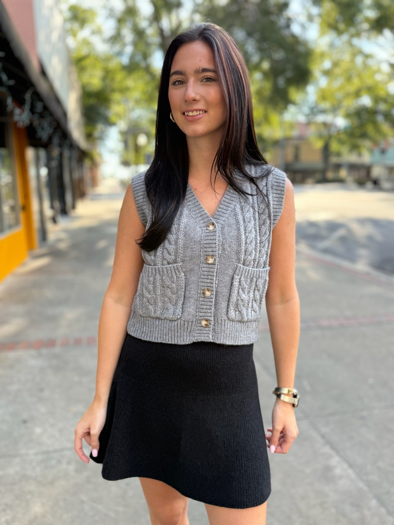 The Charcoal Cable Knit Button Down Sweater Vest adds a cozy, vintage-inspired touch to your look. Featuring classic cable knit detailing, front patch pockets, and a button-down front, it’s perfect for layering over tees, blouses, or dresses. Its cropped fit makes it a versatile piece for creating effortlessly chic outfits year-round.