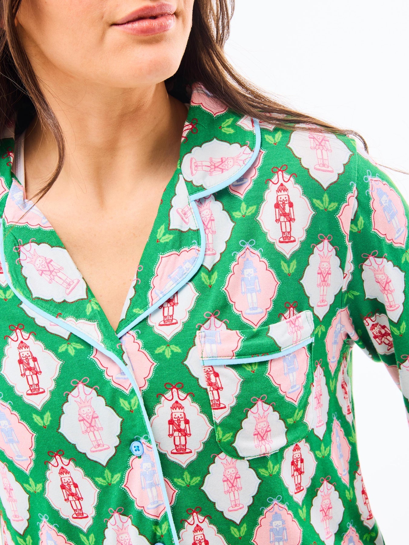 Step into the season in standout holiday fashion with the Charlotte Christmas Cavalry Set! Bursting with bold green hues and playful nutcracker cameos framed in a festive diamond pattern, this pajama set is a merry mix of tradition and fun. Crafted from irresistibly soft fabric and tailored for all-day comfort, it's perfect for Christmas morning magic, fireside lounging, or your next matching PJ photo op.