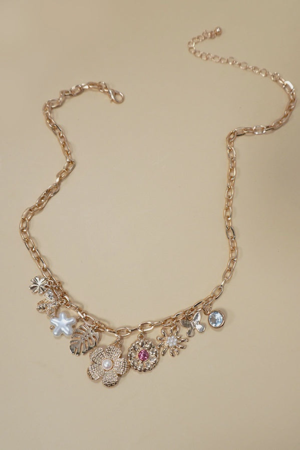 Charm Necklace featuring Flower, Leaf, Bee, and Butterfly charms, this enchanting necklace showcases a variety of intricately designed charms.