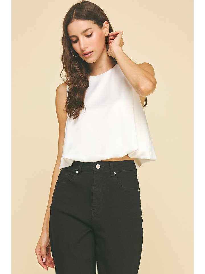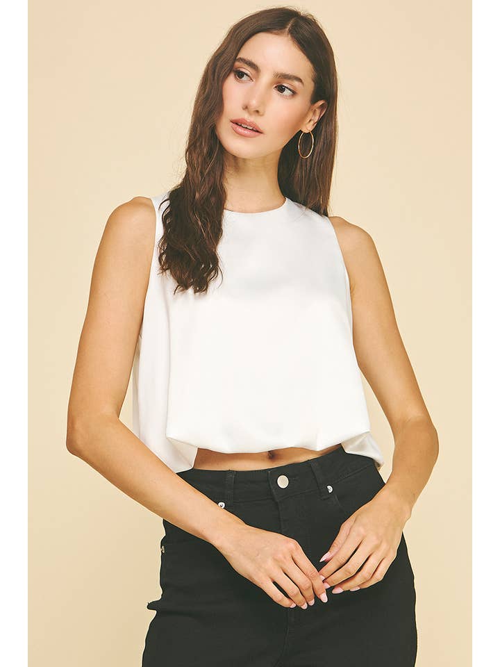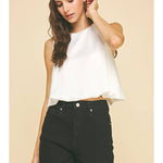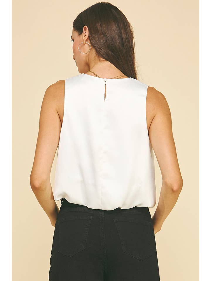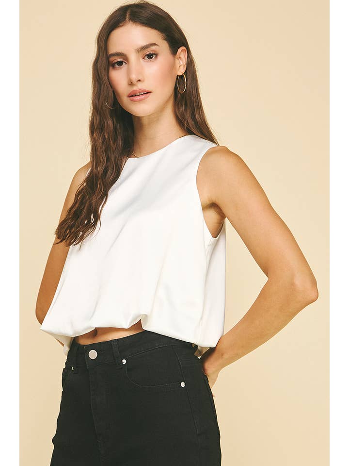 Sleek with a touch of volume, this chiffon bubble hem top is a chic statement piece for fall and winter styling. Designed with a clean round neckline and a sleeveless silhouette, it features a soft bubble hem that adds dimension and modern flair. Crafted from a lightweight chiffon blend with subtle stretch, this top is perfect for layering under jackets or wearing on its own for a polished, fashion-forward look. Pair it with tailored pants or skirts for effortless sophistication.