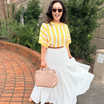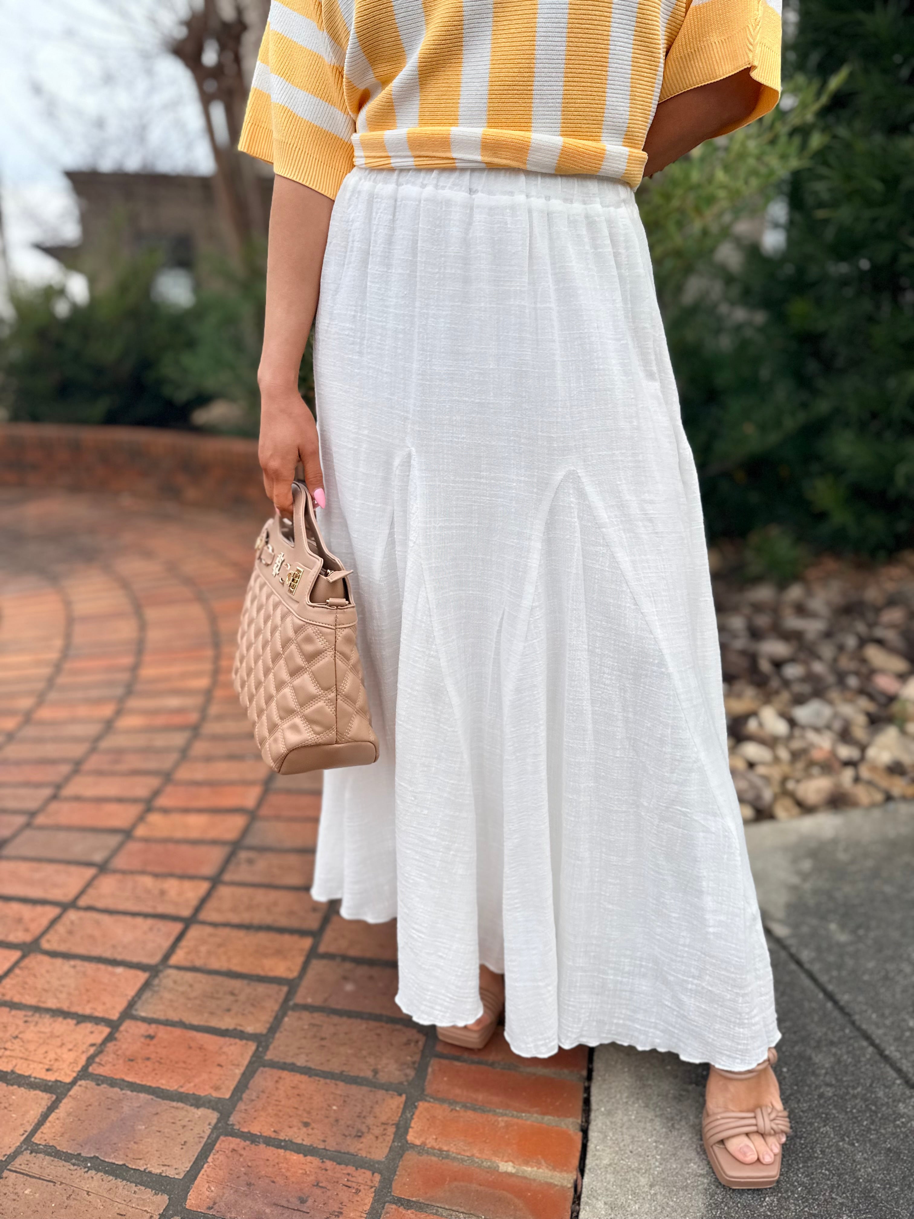 Effortless and airy, the Coastal Breeze Maxi Skirt is the definition of easy elegance. Designed in a soft textured white fabric, this flowy silhouette features a comfortable elastic waistband and a full, sweeping hem that moves beautifully with every step. Lightweight and versatile, it pairs perfectly with everything from fitted tanks to breezy blouses. Dress it up with heels for showers and spring events or keep it casual with sandals for everyday chic. A timeless staple you’ll reach for again and again.