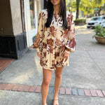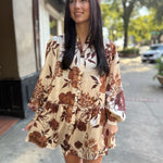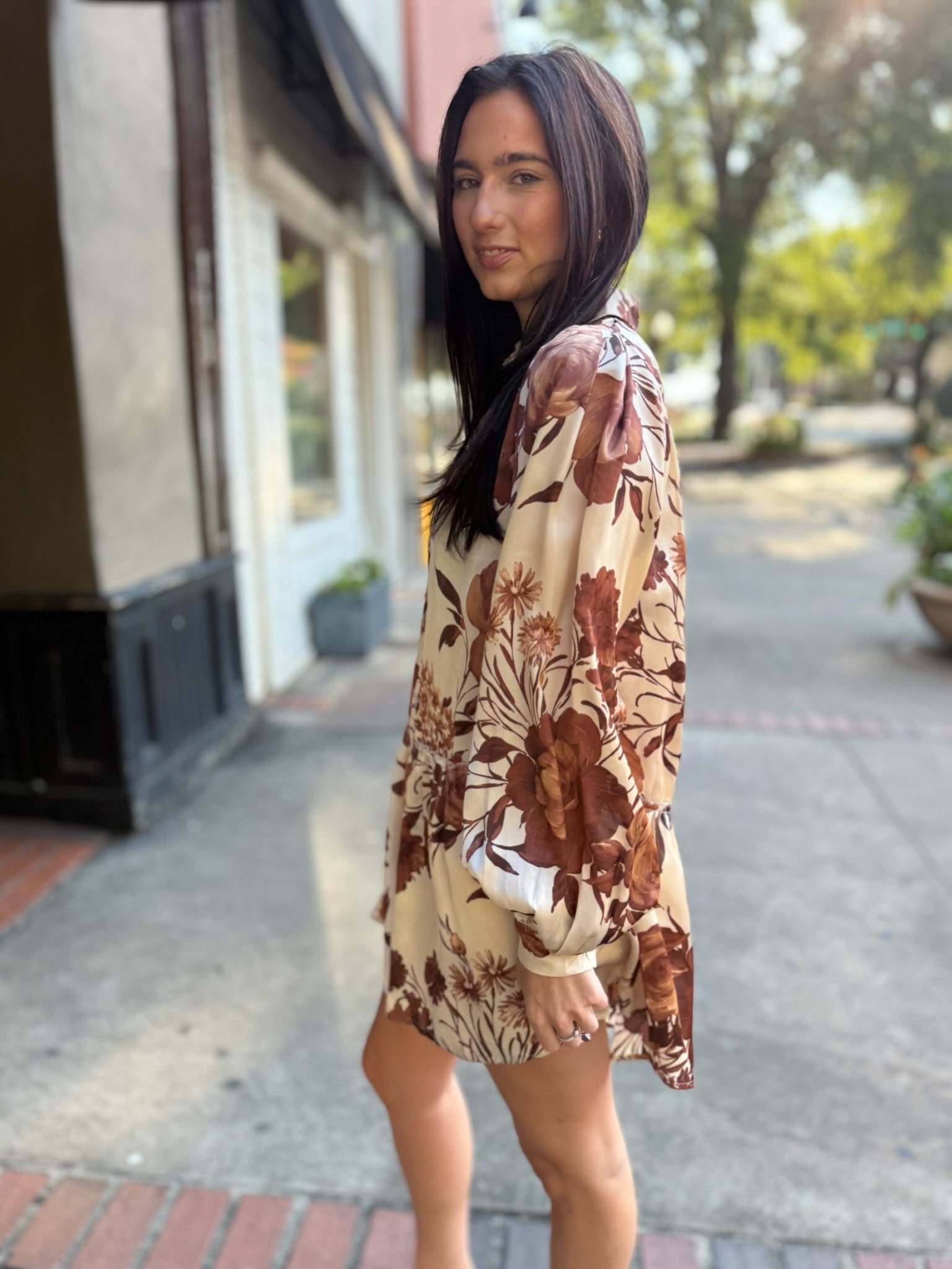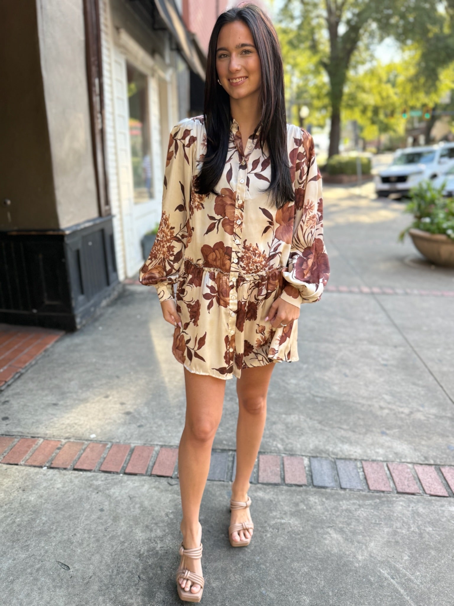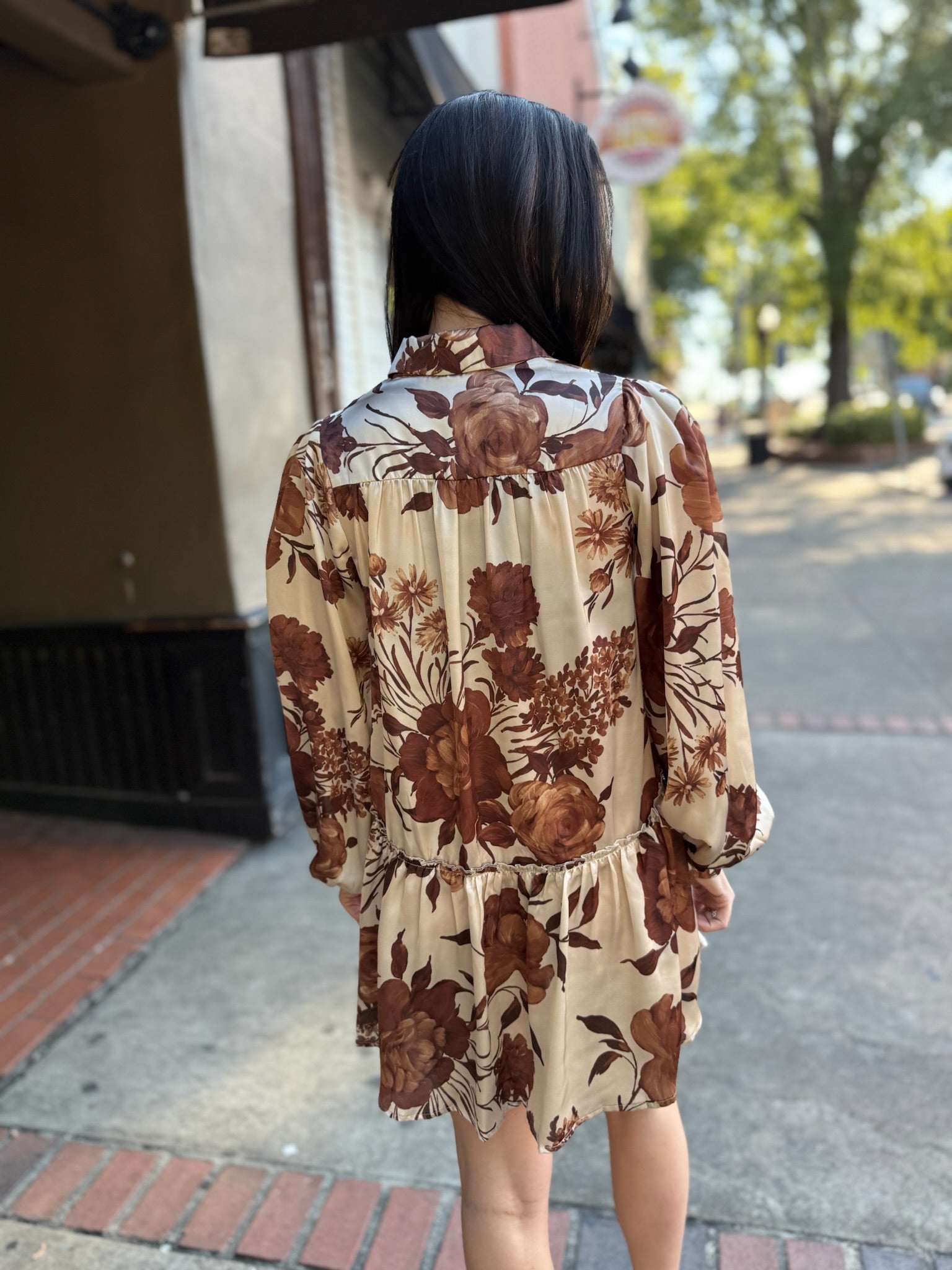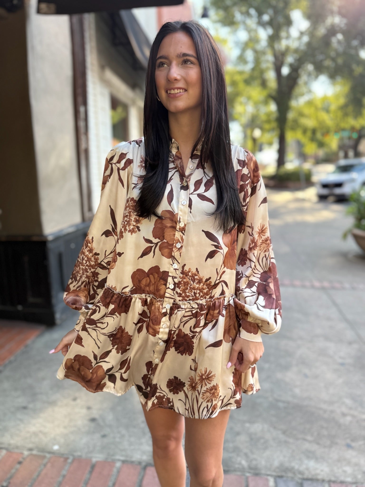 The Coffee Cream Brown Reina Satin Dress is a sophisticated yet effortless piece, perfect for any occasion. Crafted from luxurious satin printed fabric, it showcases a rich floral design in warm tones. The Reina Dress features functioning buttons down the front, a classic collared neckline, and a relaxed silhouette with a gathered waist for a flattering finish.