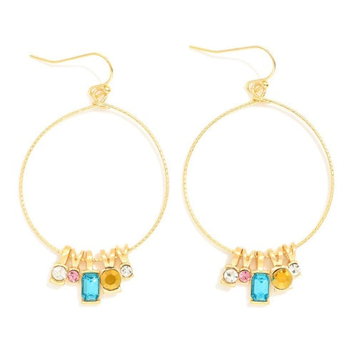 Add a playful pop of color with the Colorburst Gold Hoop Drop Earrings! These 2" textured gold open hoops feature a mix of vibrant stone drops—sparkling in shades of turquoise, pink, amber, and clear rhinestone. Lightweight and eye-catching, they bring just the right amount of fun and glam to your look. Perfect for brightening up casual outfits or making a bold statement on a night out, these hoops are all about effortless sparkle and style!