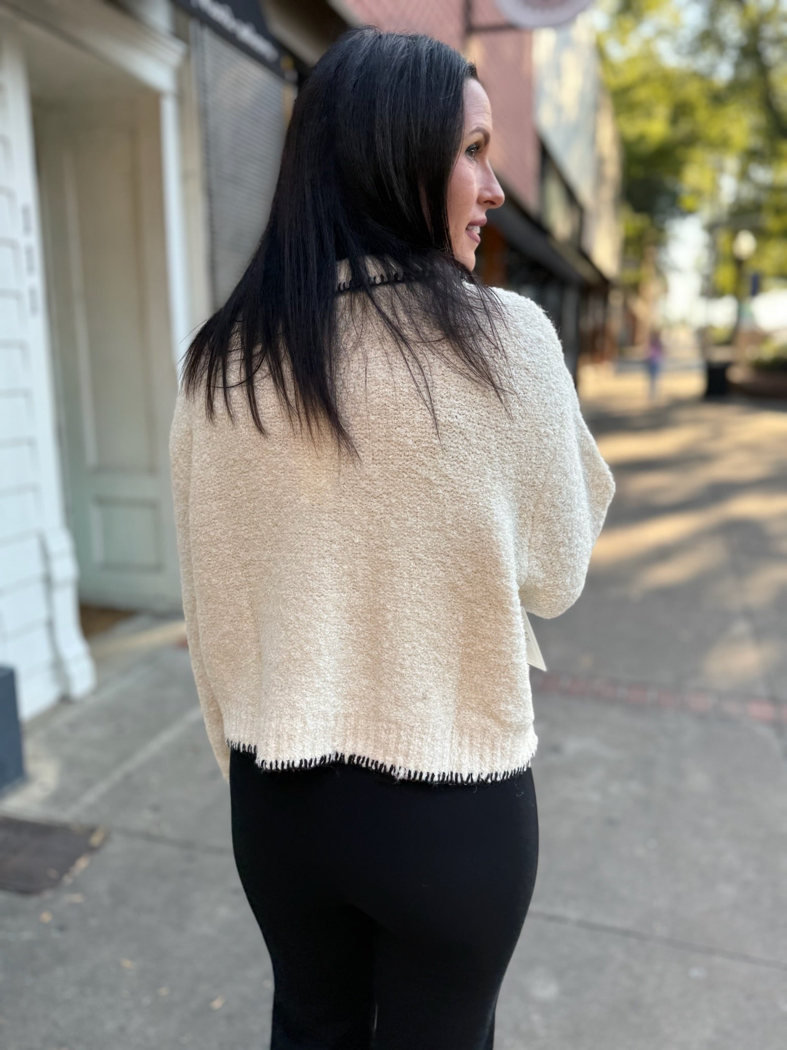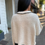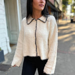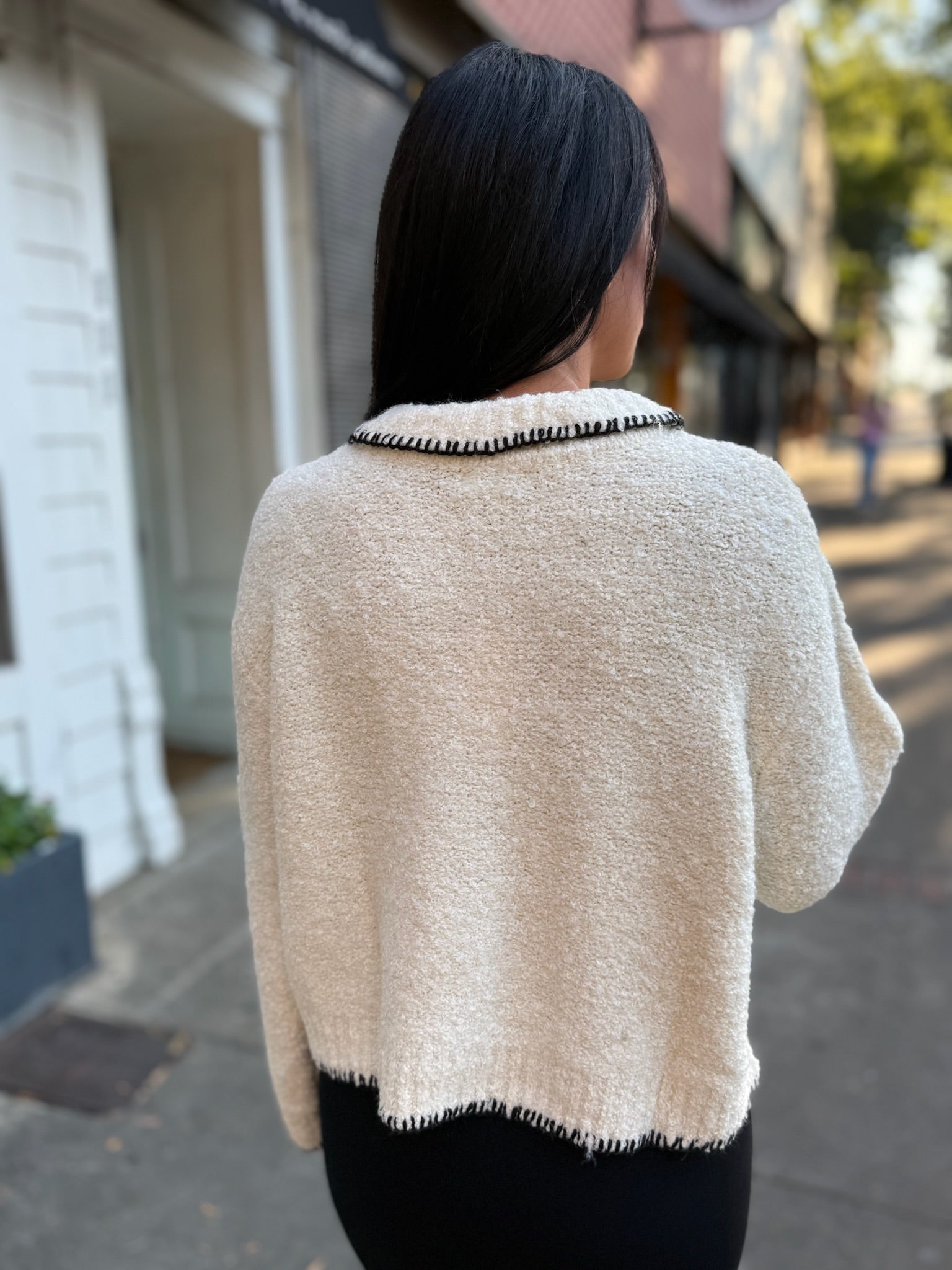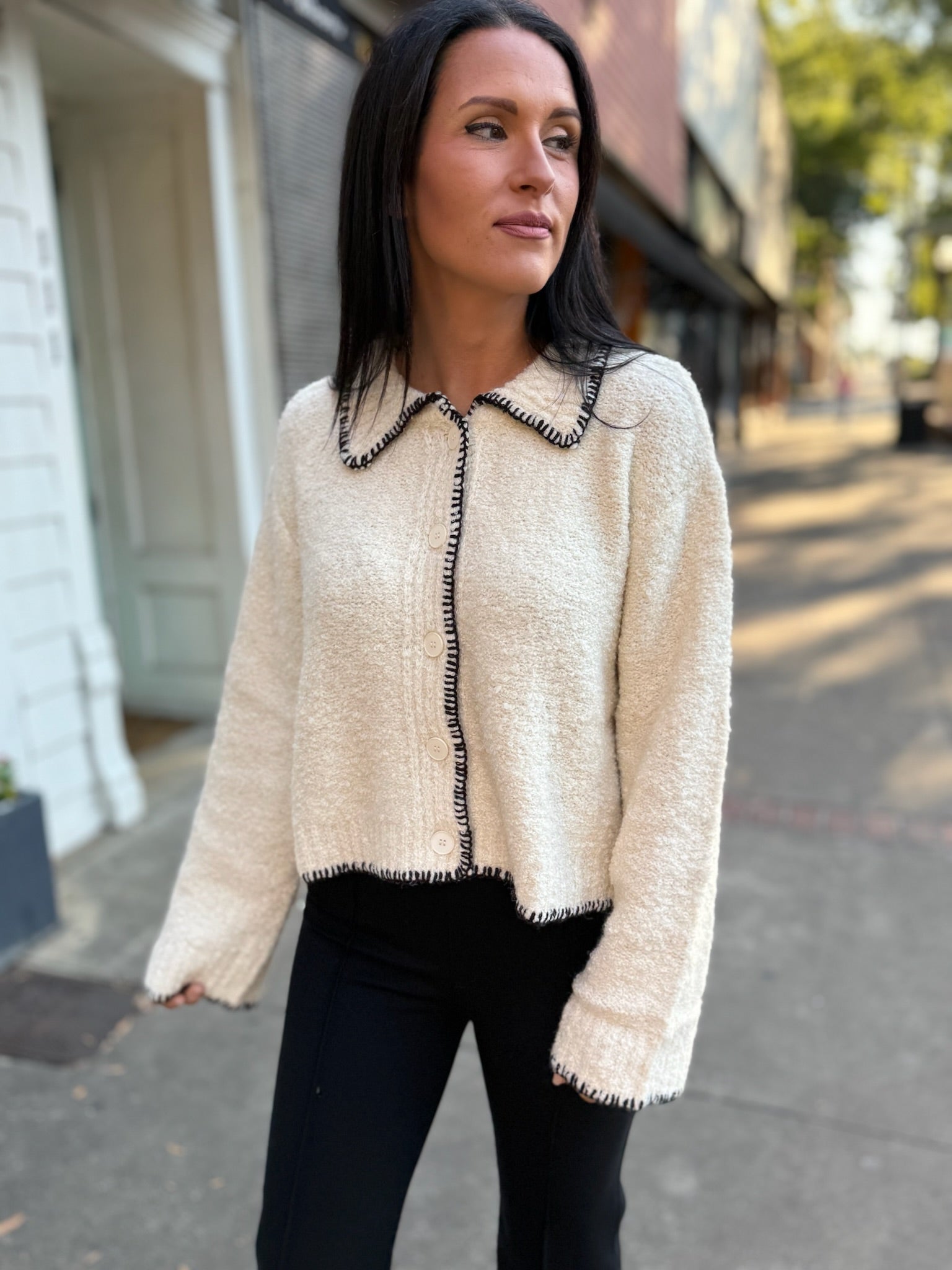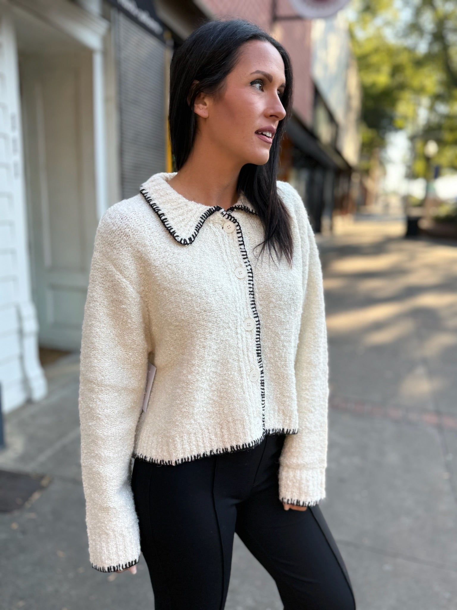 This Cream Contrast Trim Stitch Collared Cardigan is the perfect blend of cozy and chic. Designed with a statement collar and eye-catching black contrast stitching, it elevates a timeless silhouette with a modern edge. The soft knit fabric and relaxed fit make it an easy go-to for both casual days and polished nights out. Pair it with denim, skirts, or tailored pants for a look that’s effortlessly stylish and always on trend.