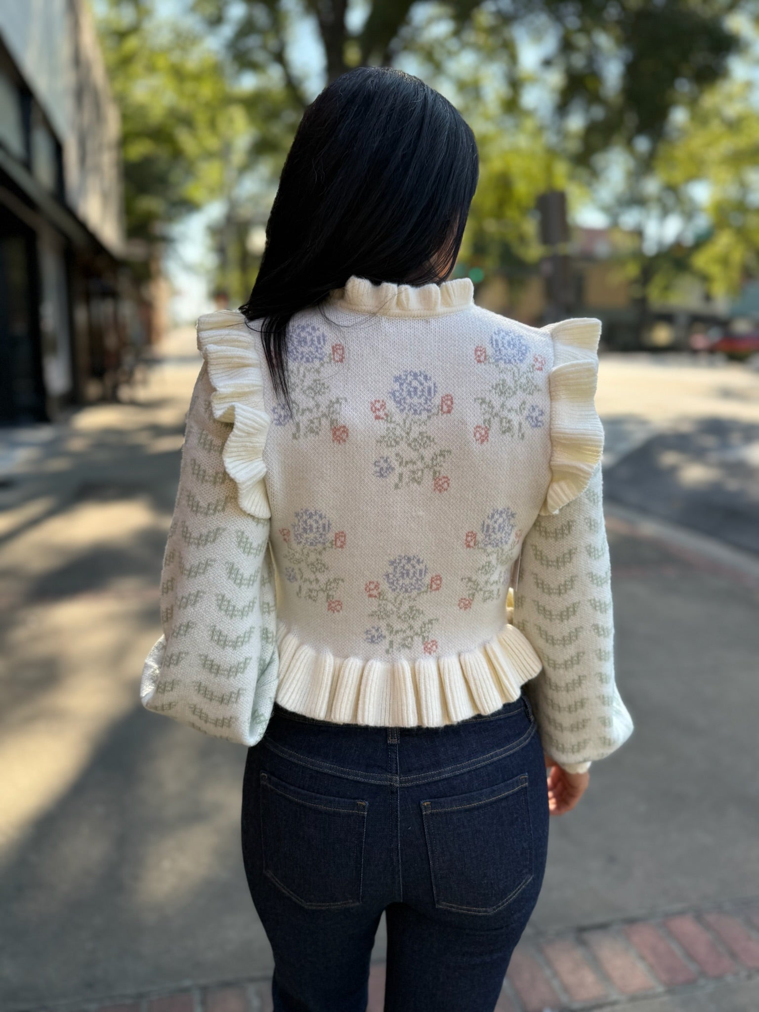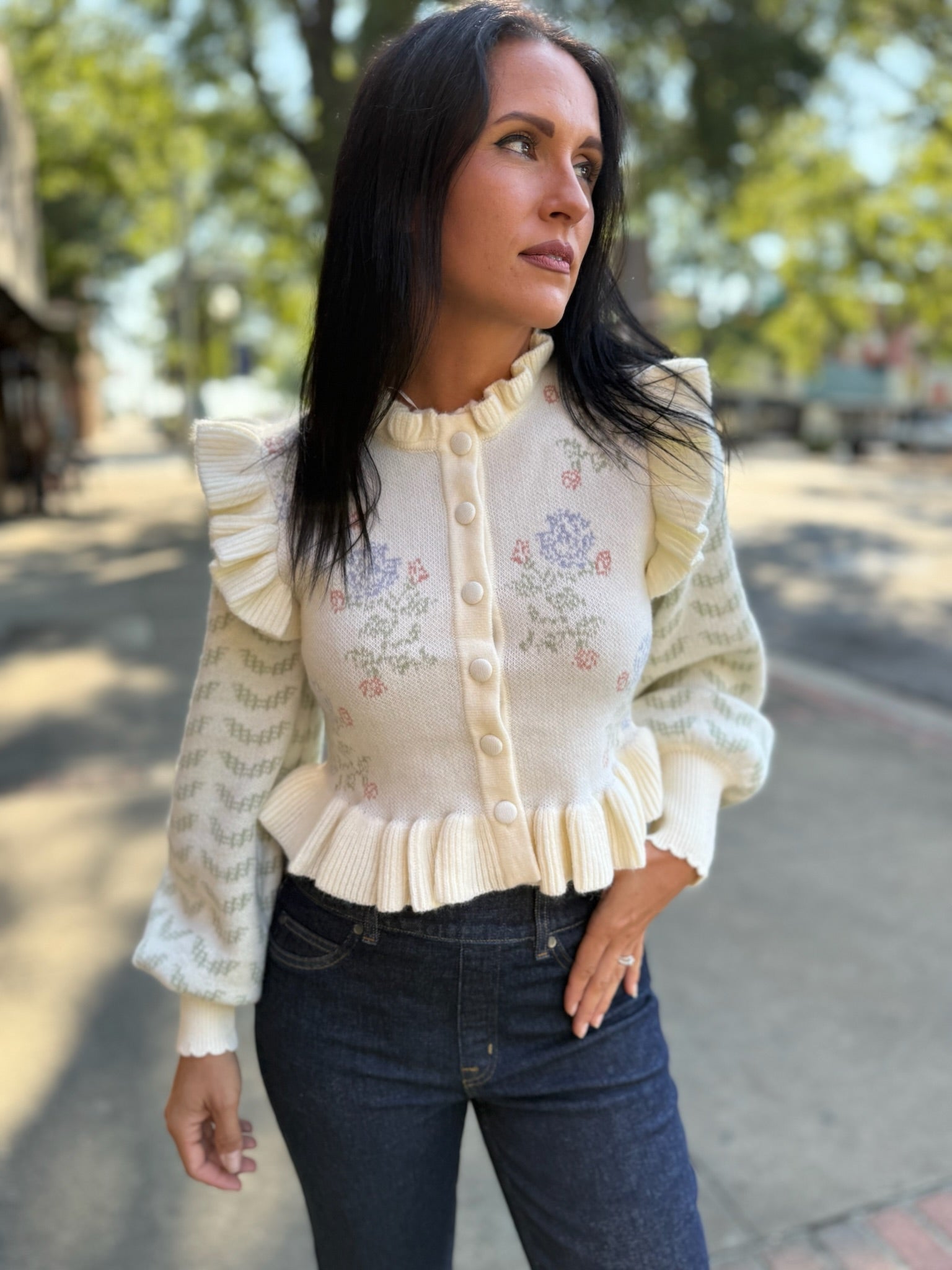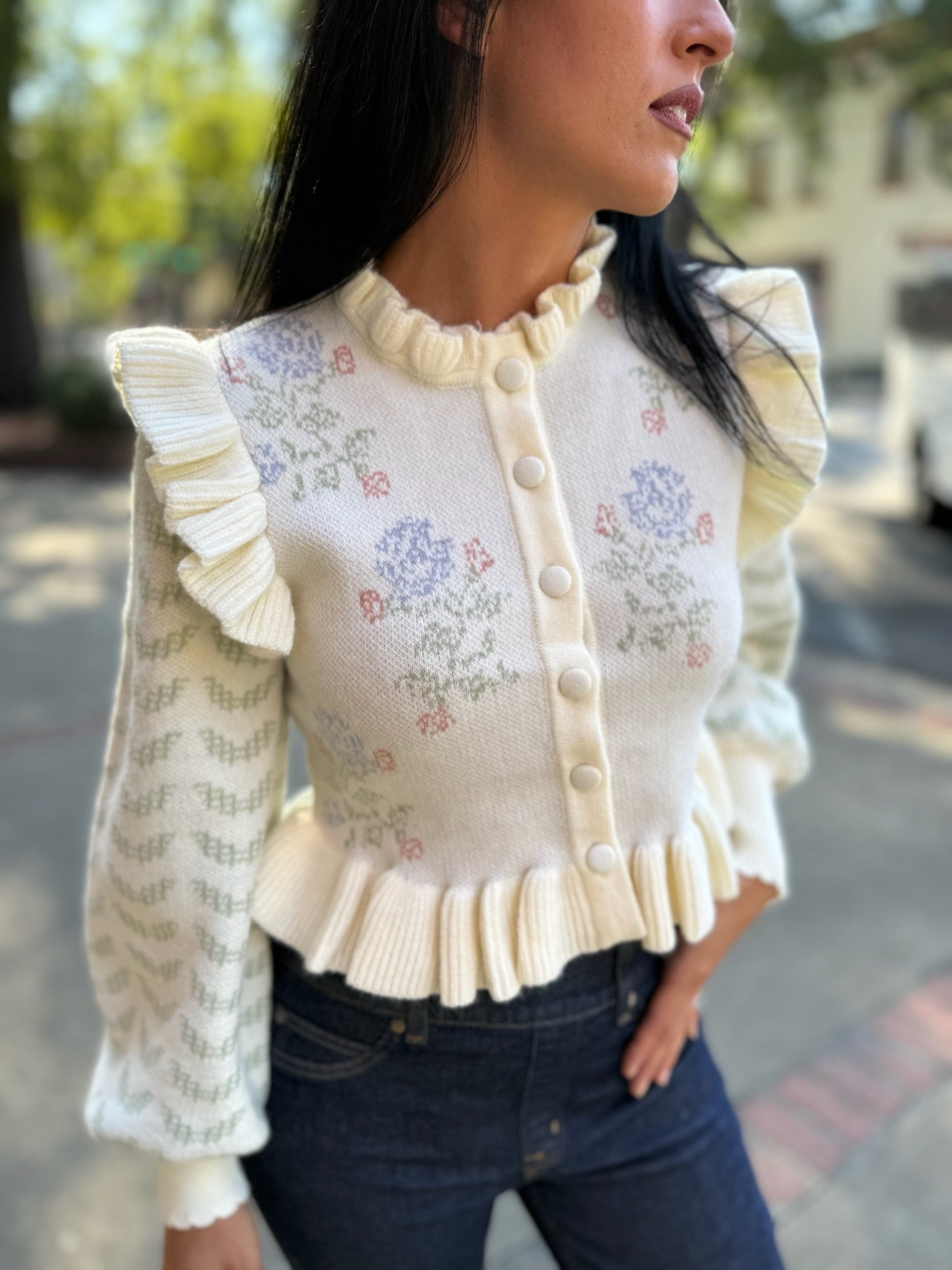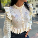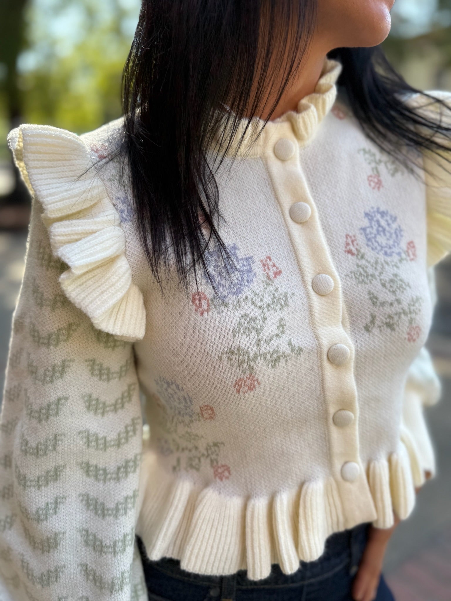 The Cream Floral Print Ruffle Detail Knit Cardigan is a charming blend of cozy and feminine. This floral printed button-down cardigan features delicate ruffle accents, whimsical balloon sleeves, and a soft knit finish. Perfect for layering over dresses or pairing with high-waisted jeans for a sweet, stylish look.