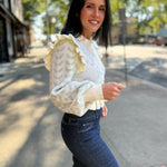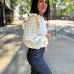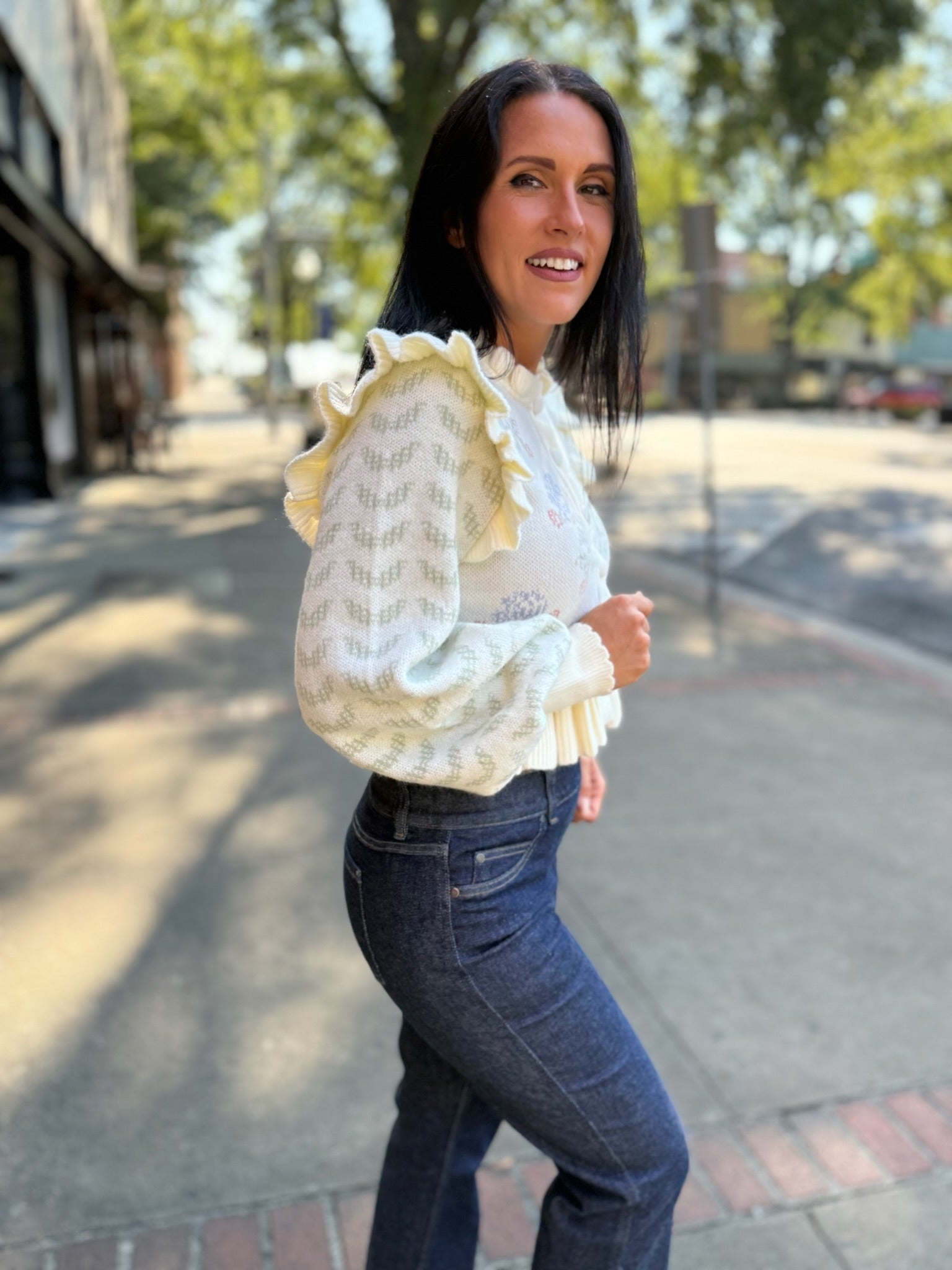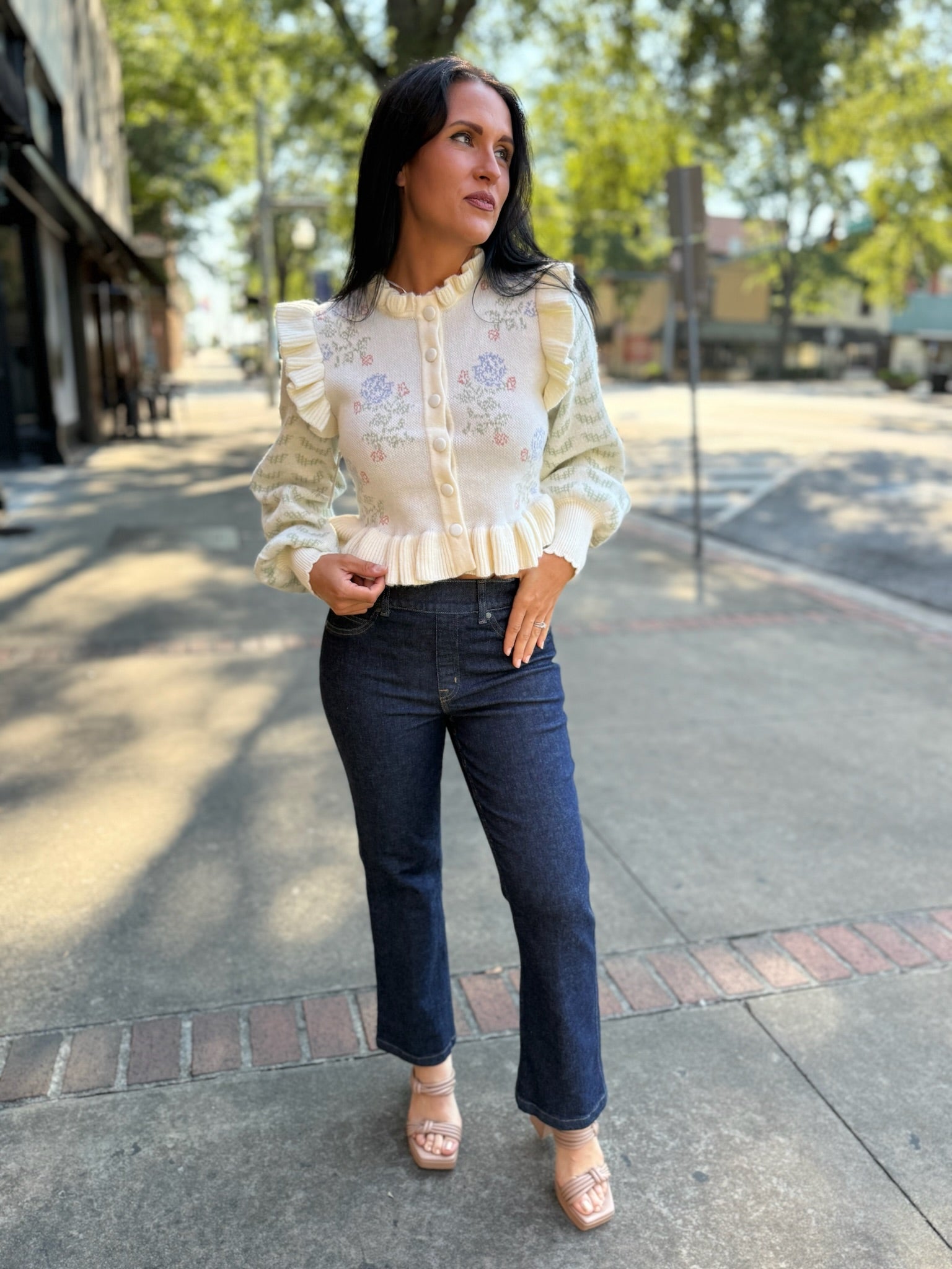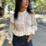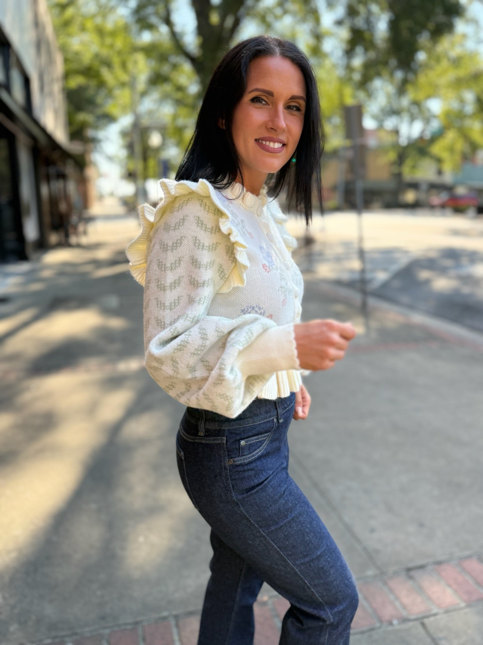 The Cream Floral Print Ruffle Detail Knit Cardigan is a charming blend of cozy and feminine. This floral printed button-down cardigan features delicate ruffle accents, whimsical balloon sleeves, and a soft knit finish. Perfect for layering over dresses or pairing with high-waisted jeans for a sweet, stylish look.