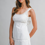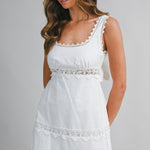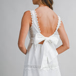 Sweet, airy, and effortlessly romantic, the Crochet Lace Trim Sleeveless Tiered Mini Dress is the perfect blend of soft femininity and summer charm. Crafted from a breathable cotton-linen blend, this mini silhouette features a flattering square neckline with delicate crochet lace-trimmed straps for a touch of vintage-inspired detail. The low open back makes a statement, finished with an oversized self-tie bow for a playful yet elegant finish. Scalloped lace trim accents the bust seam and tiered skirt, adding texture and movement to this beautifully feminine piece.