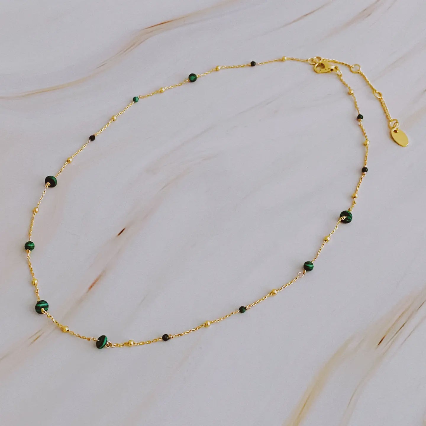 Elevate your everyday look with our Dainty Precious Stone Bead Necklace. The delicate chain showcases varying sizes of beautifully placed stone balls, offering a touch of daintiness to any outfit. Perfect for layering or wearing on its own, this versatile necklace will effortlessly take you from casual to dressy occasions.