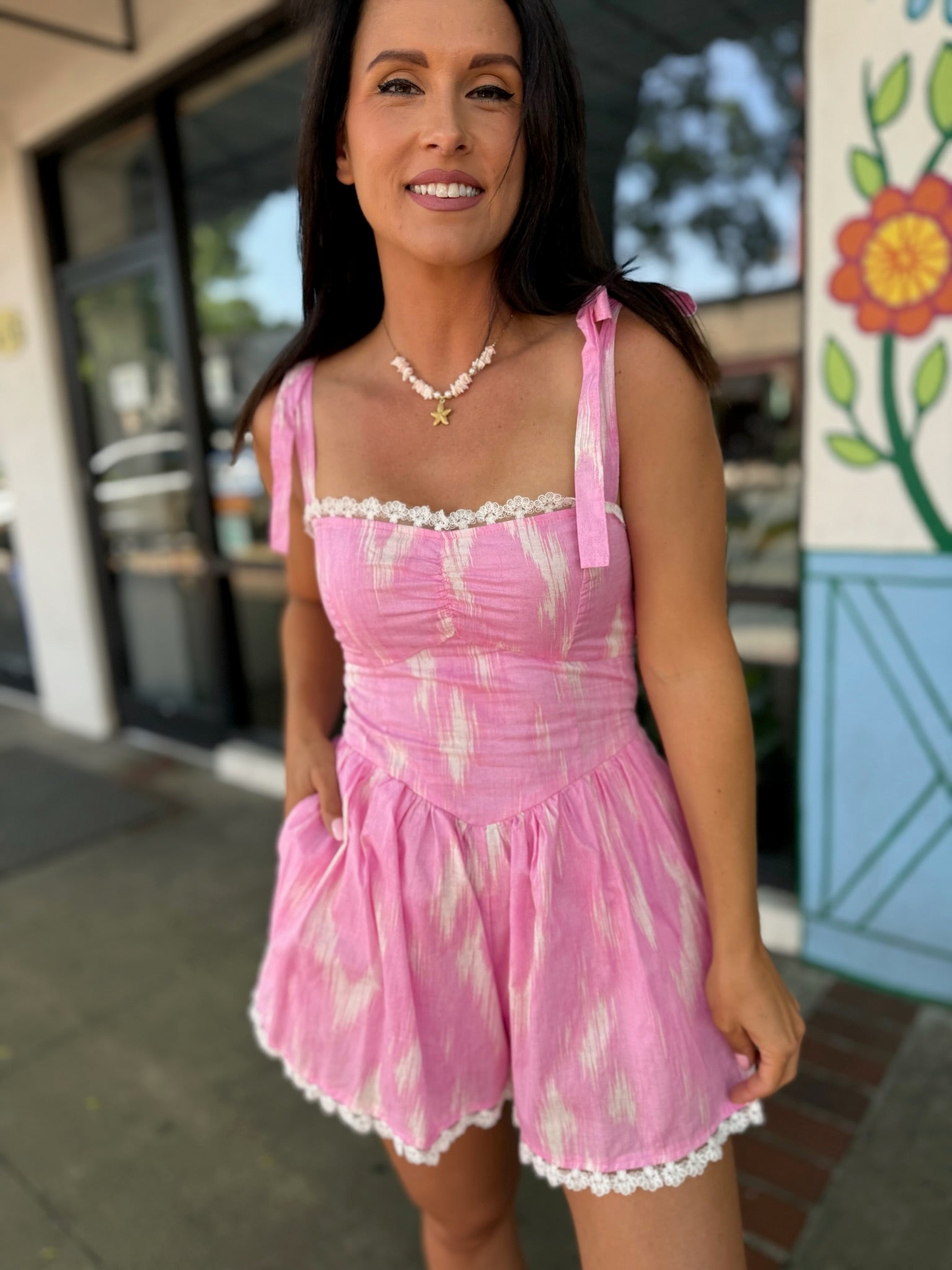 Step into sunshine with the Dara Pink Romper, your new go-to for flirty, feminine fun. Featuring delicate shoulder tie straps, a ruched bodice, and playful lace trim, it’s the perfect mix of sweet and sassy. The soft pink hue and breezy fit make it a dream for warm-weather adventures. Whether you're brunching or beach-strolling, this romper promises compliments all day long.