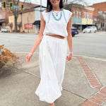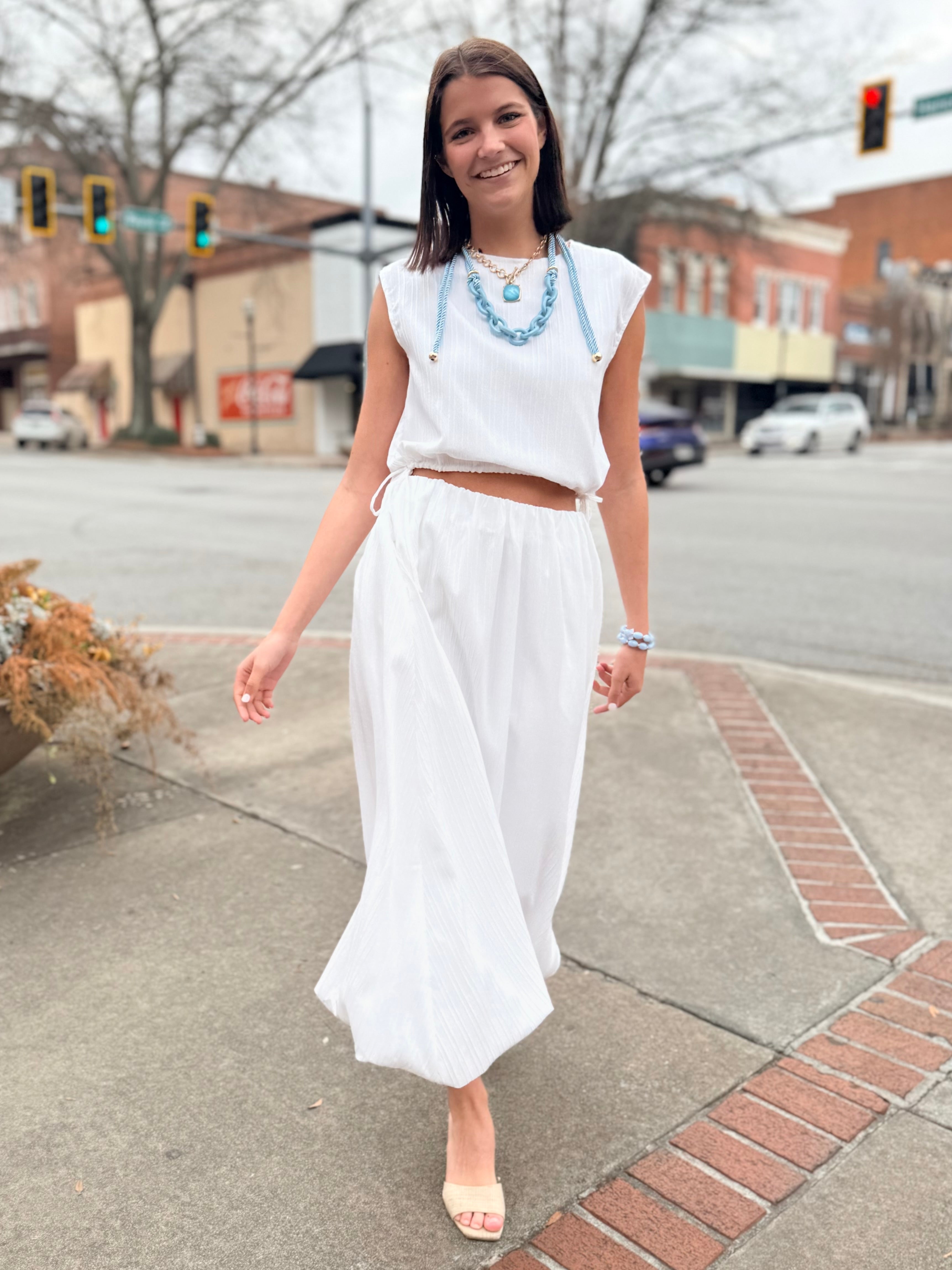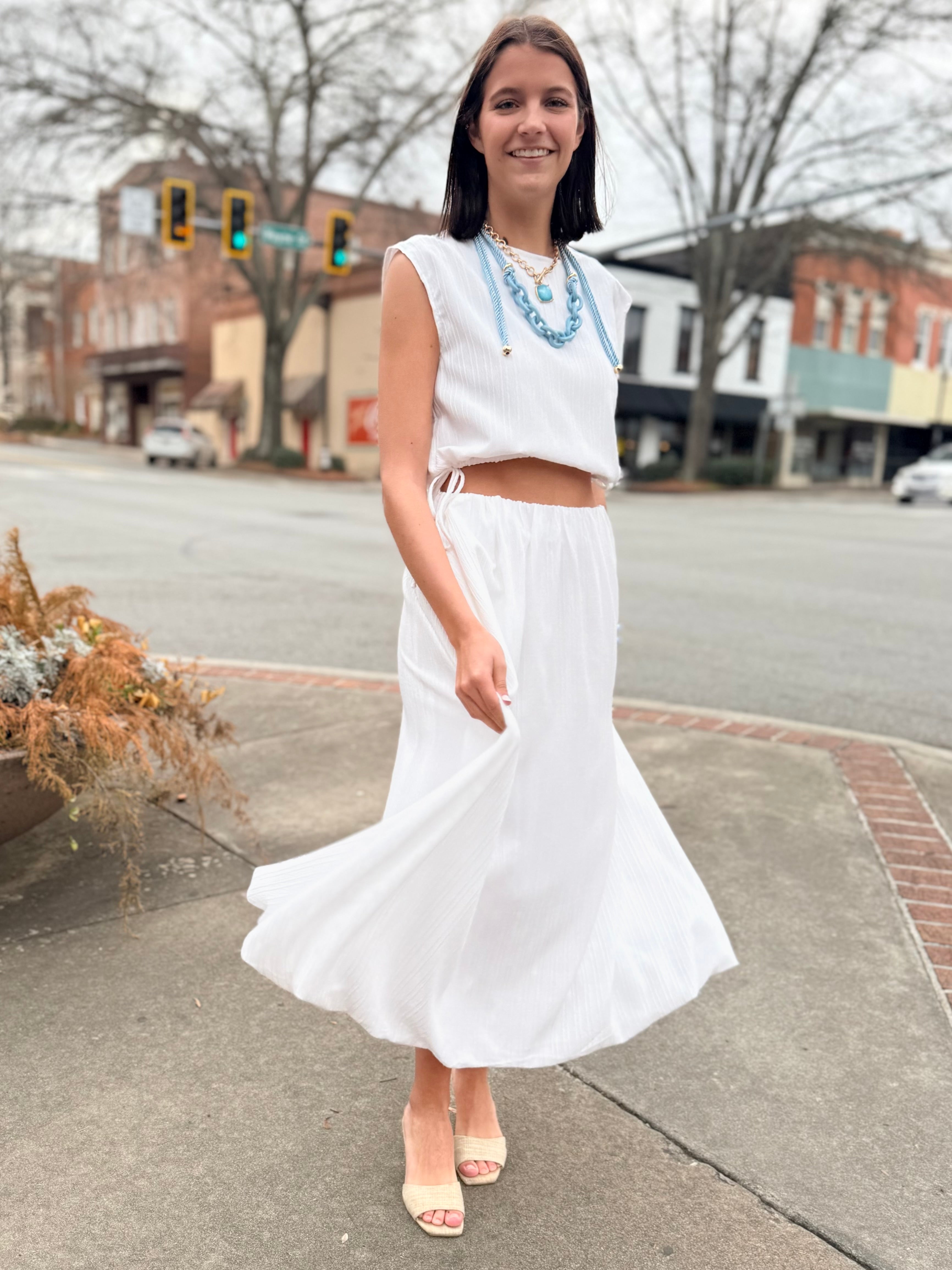 Graceful movement meets timeless style in this pleated maxi skirt. Crafted from the same lightweight textured fabric, it features a comfortable elastic waistband and a beautifully flowing silhouette that flatters every step. Dress it up with heels or keep it casual with sandals or boots — this versatile piece transitions seamlessly from daytime events to evening dinners. (Shown styled with a belt; belt not included.)