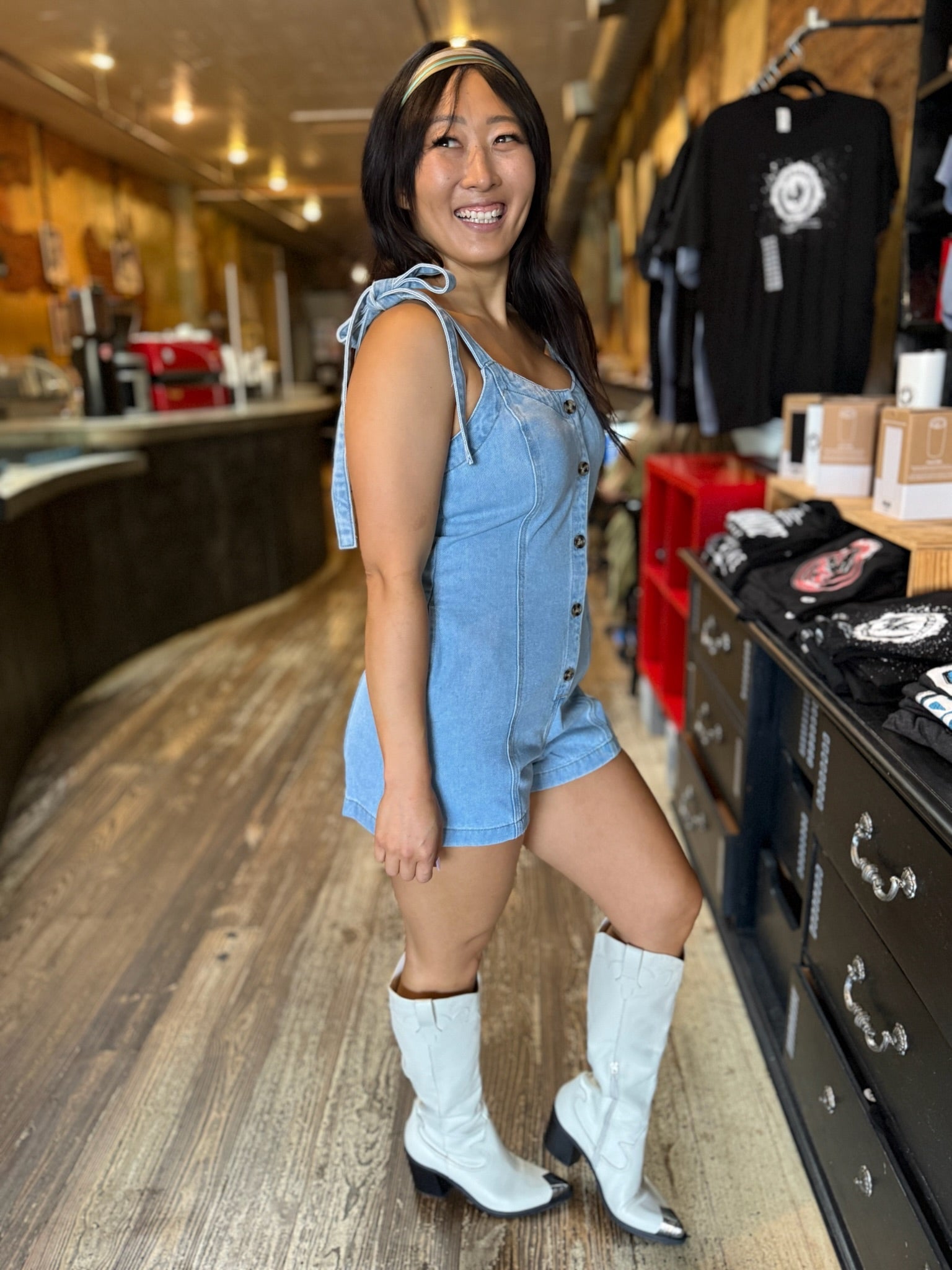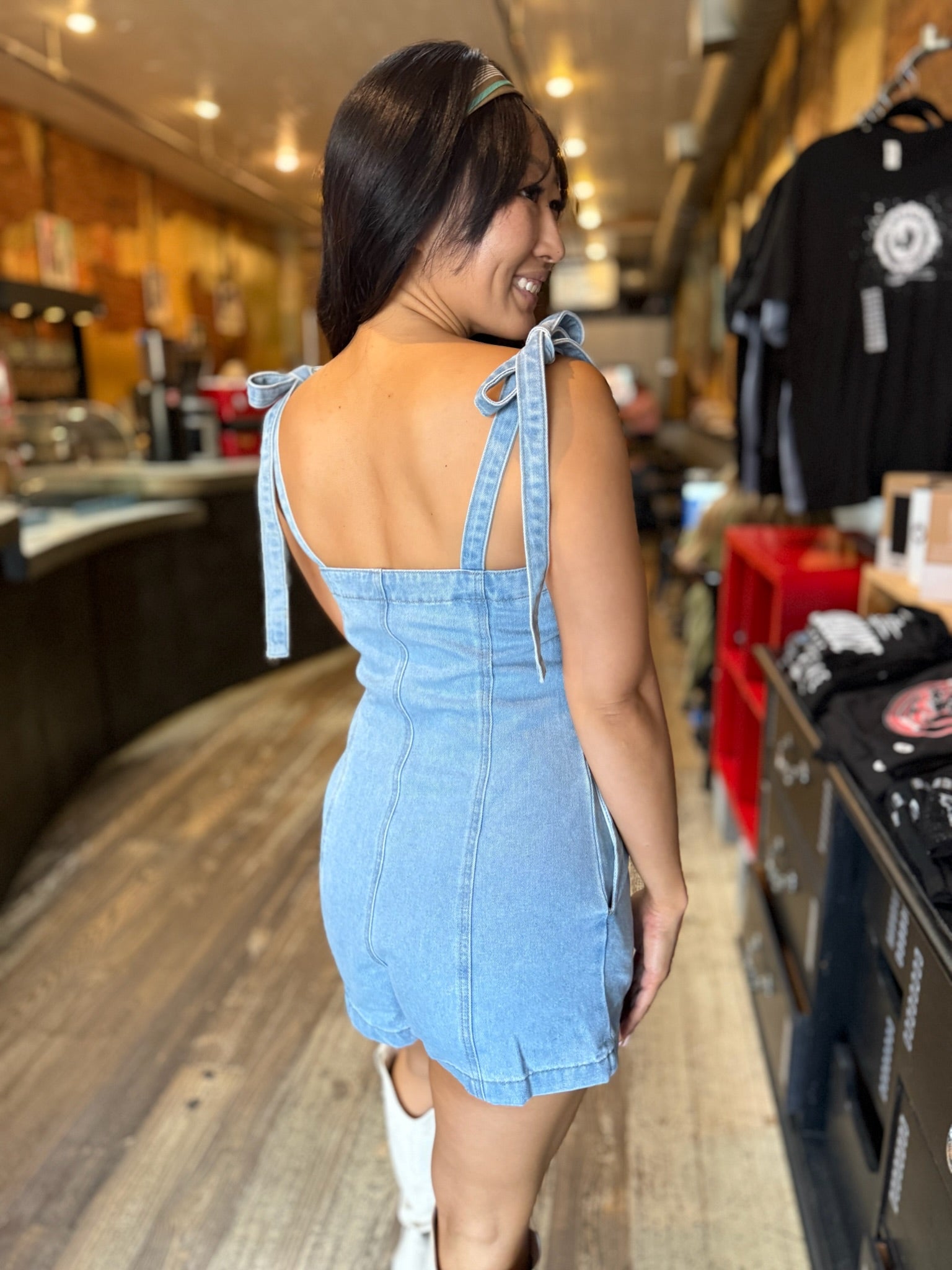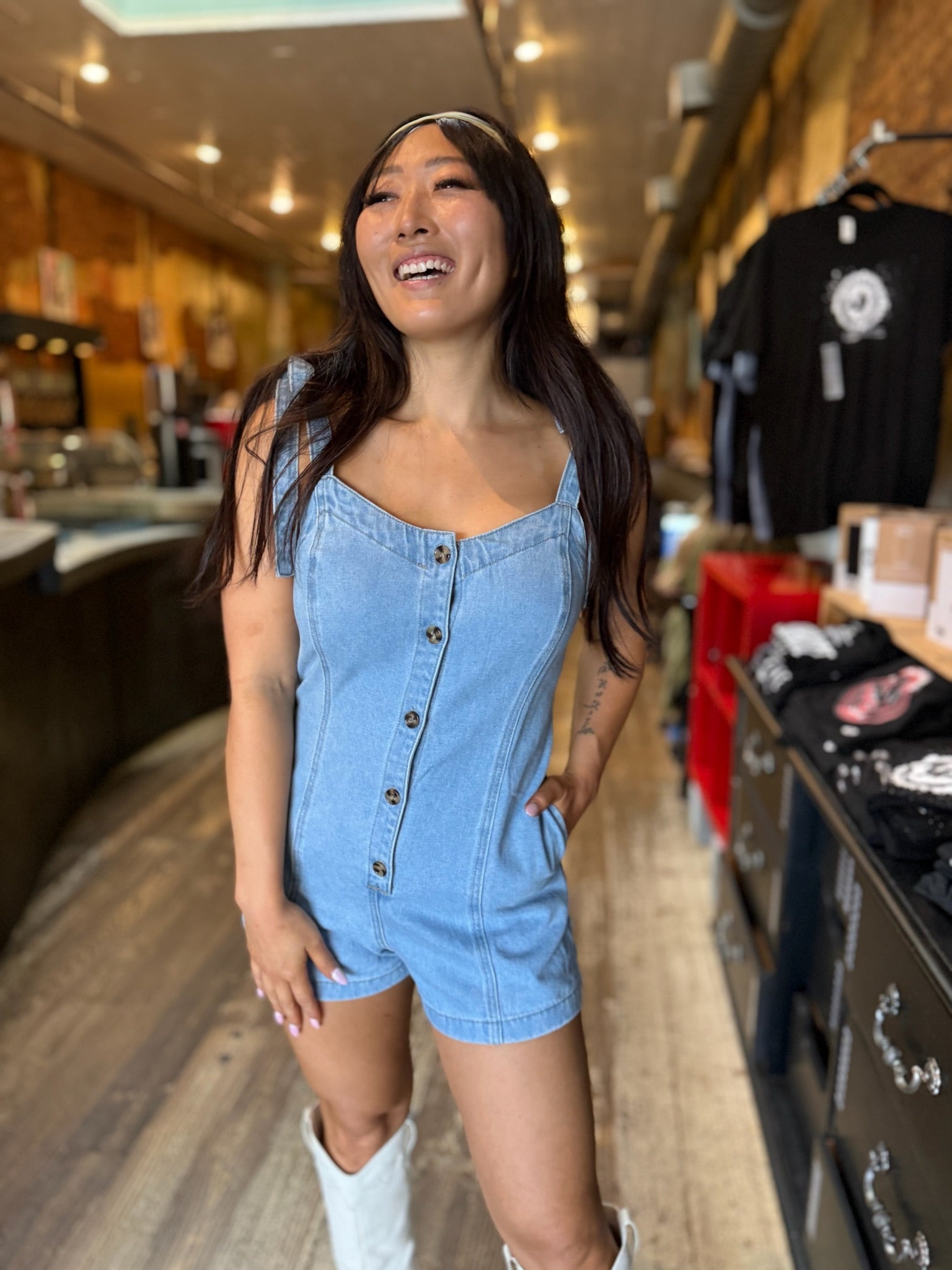 The Denim Button Down Romper With Shoulder Tie Detail is a playful yet chic warm-weather staple. This sleeveless denim romper features self-tie bow straps, a flattering button-down front, and convenient side pockets. Perfect for sunny days, it pairs effortlessly with sandals or sneakers for a laid-back, stylish look.